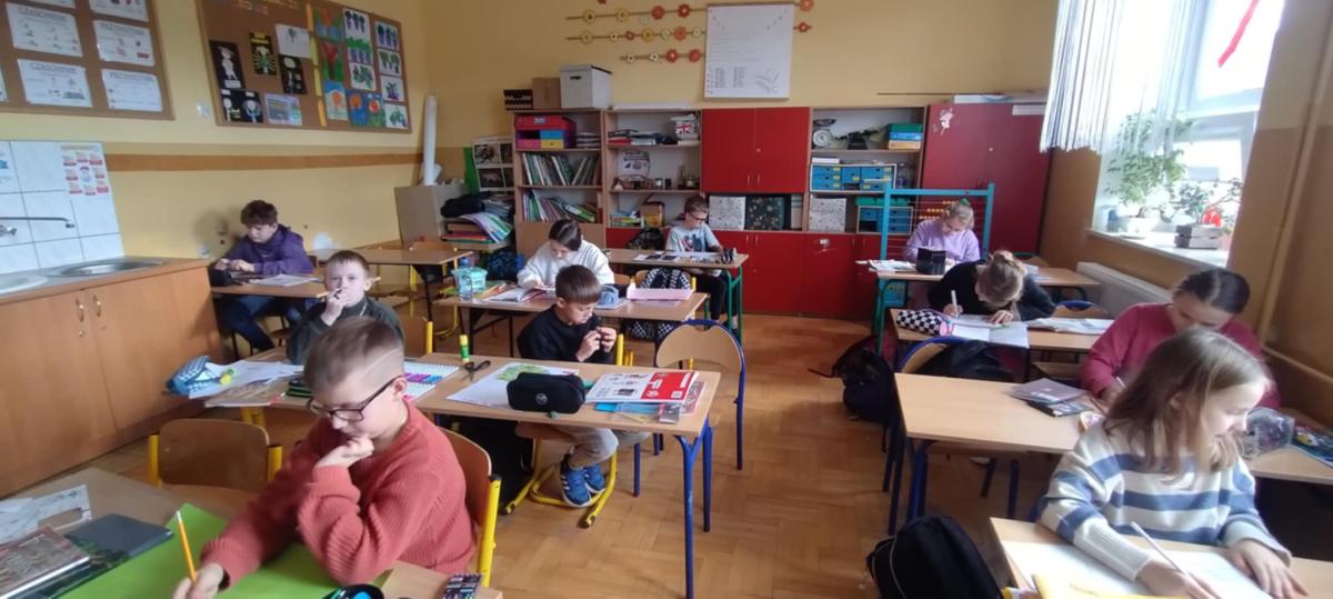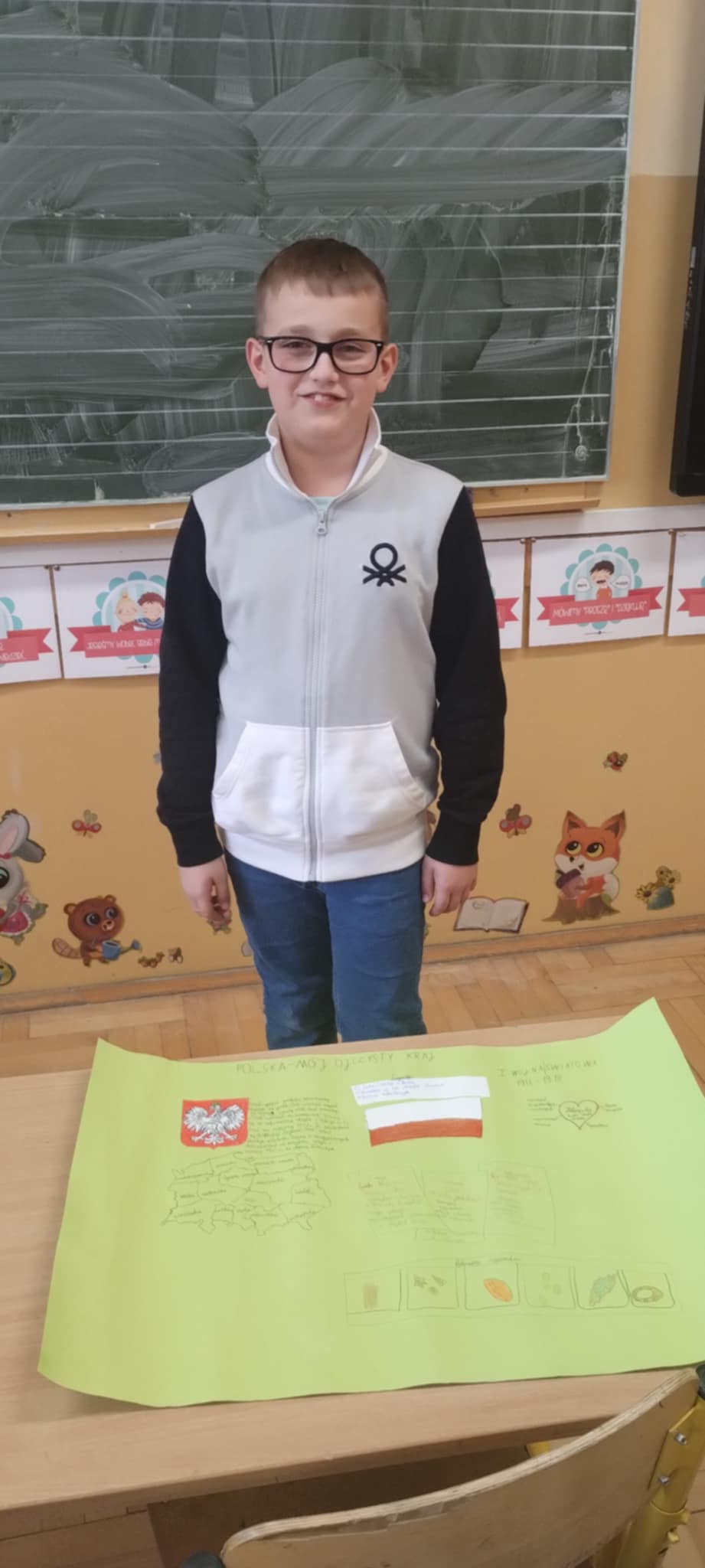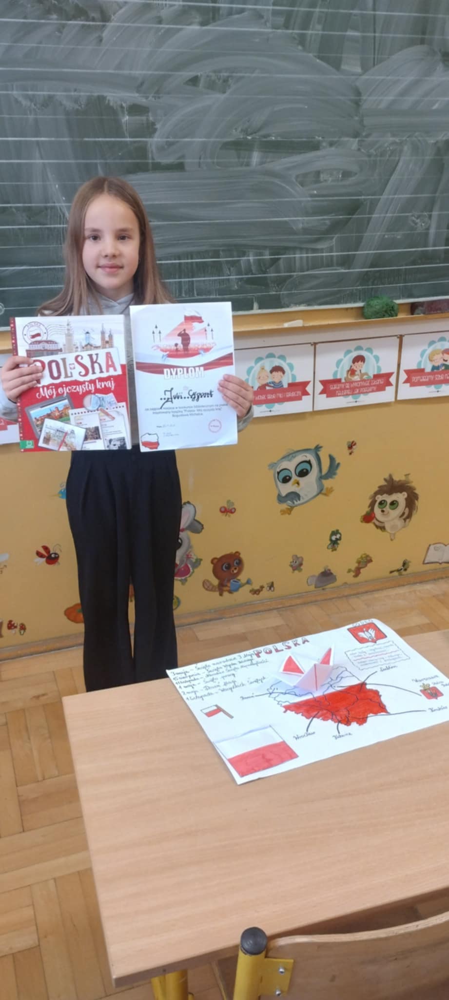 Uczniowie klasy IV wzięli udział w konkursie na plakat inspirowany książką "Polska- mój ojczysty kraj" autorstwa Bogusława Michalca. Celem konkursu było rozwijanie zainteresowań czytelniczych, pogłębianie wiedzy o Polsce, kształtowanie kreatywności i wrażliwości artystycznej uczniów oraz zachęcanie do twórczej interpretacji treści literackich.
