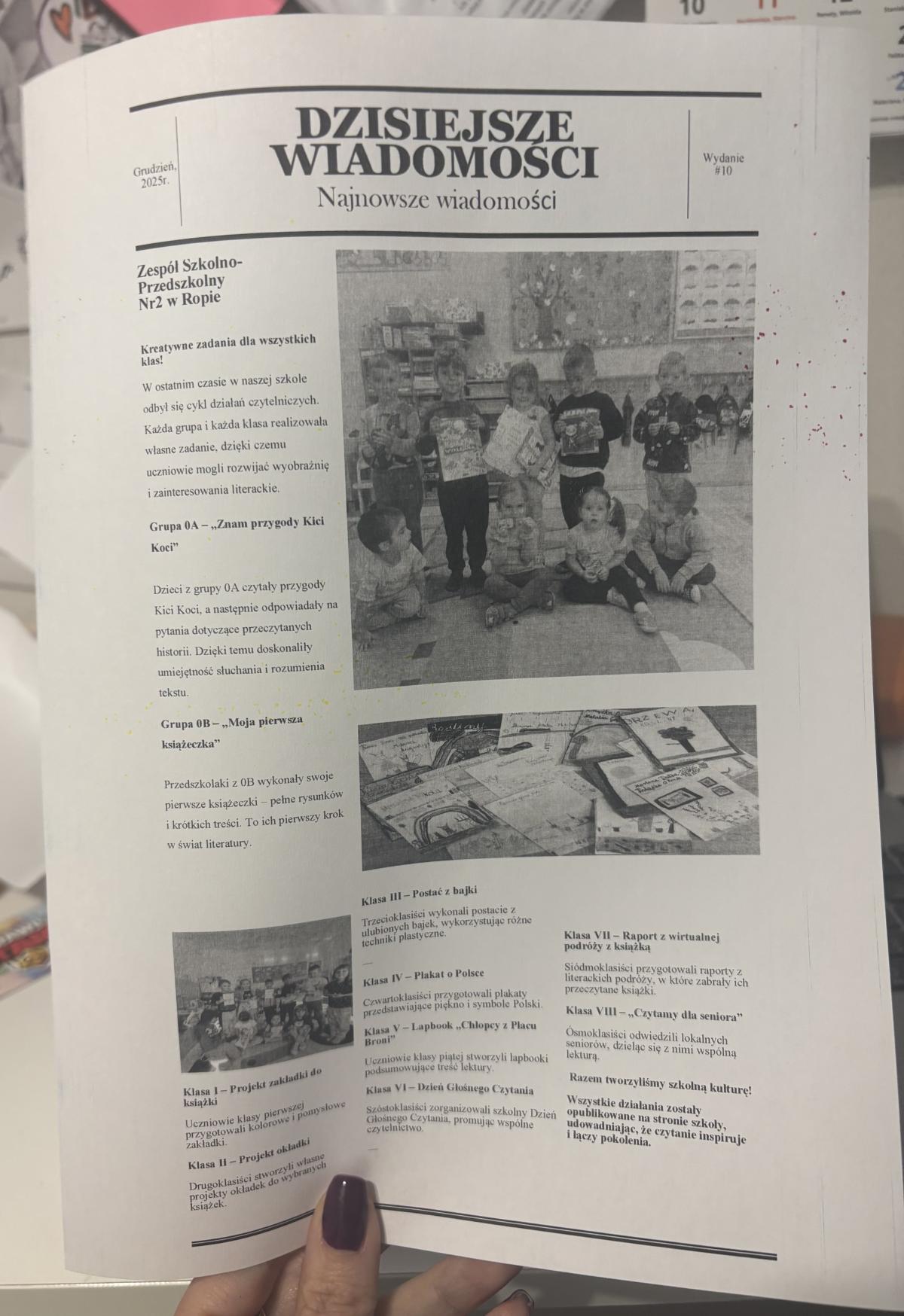 Były to m.in.: akcje czytelnicze, konkursy, projekty plastyczne inspirowane książką, zajęcia promujące czytanie oraz działania angażujące uczniów w różnym wieku. Gazetka stanowiła podsumowanie wspólnych działań społeczności szkolnej na rzecz rozwoju czytelnictwa i popularyzowania książki wśród dzieci i młodzieży.