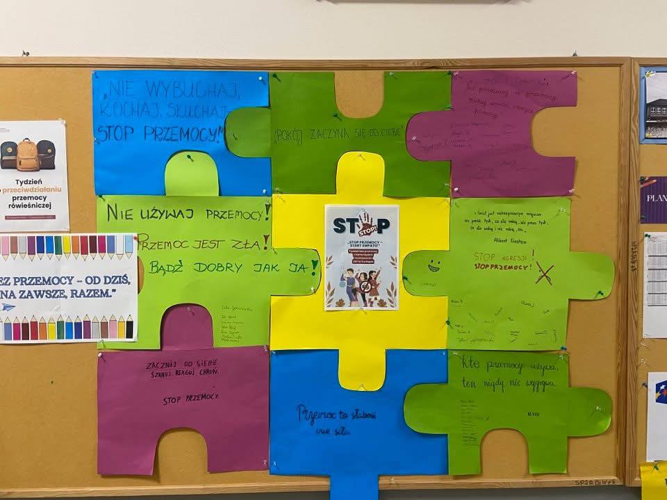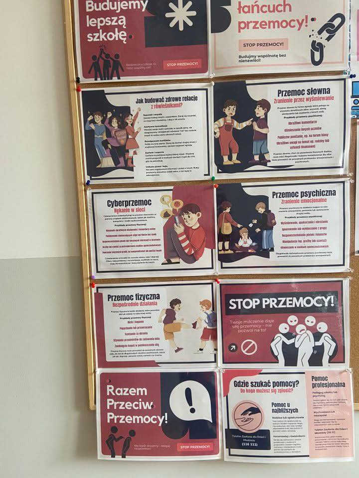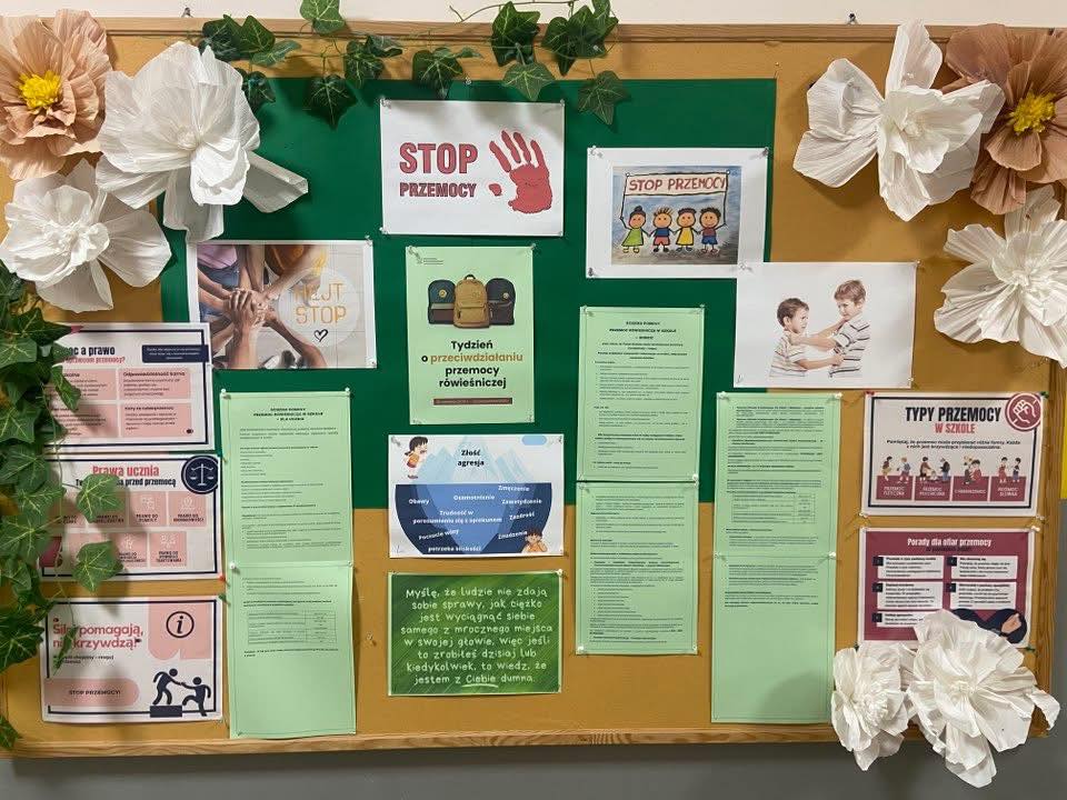 W minionym tygodniu nasza szkoła aktywnie włączyła się w działania mające na celu przeciwdziałanie przemocy rówieśniczej oraz budowanie atmosfery szacunku,życzliwości i bezpieczeństwa.To ważna inicjatywa, która zwraca uwagę na to, jak bardzo mogą ranić takie zachowania jak:wyśmiewanie , wykluczanie czy hejt w Internecie. W ramach działań - psycholog szkolny, pedagog oraz wychowawcy przeprowadzili inspirujące lekcje psychoedukacyjne, które skłaniały uczniów do refleksji nad empatią, szacunkiem i odpowiedzialnością w relacjach międzyludzkich. Przygotowane zostały również gazetki tematyczne oraz materiały informacyjne, które pokazują jak reagować na przemoc i gdzie szukać pomocy. To był tydzień pełen rozmów, pogadanek, filmów edukacyjnych i wspólnego działania. Pokazaliśmy, że razem możemy więcej - uczniowie dzielili się swoimi doświadczeniami, refleksjami i pomysłami na to, jak wspólnie budować wspierającą, empatyczną społeczność. Wierzymy, że tylko wspólne zaangażowanie uczniów, nauczycieli i rodziców pozwoli nam skutecznie przeciwdziałać przemocy i tworzyć szkołę, w której każdy czuje się bezpiecznie i jest traktowany z szacunkiem.