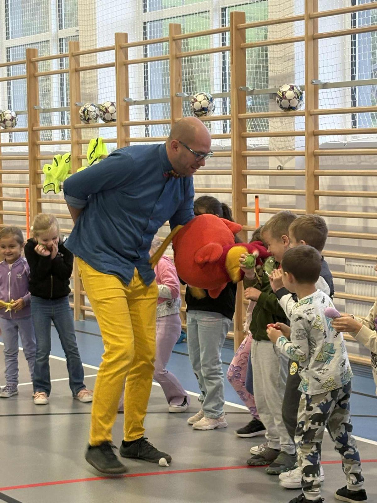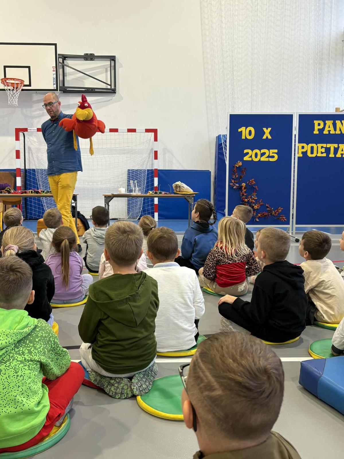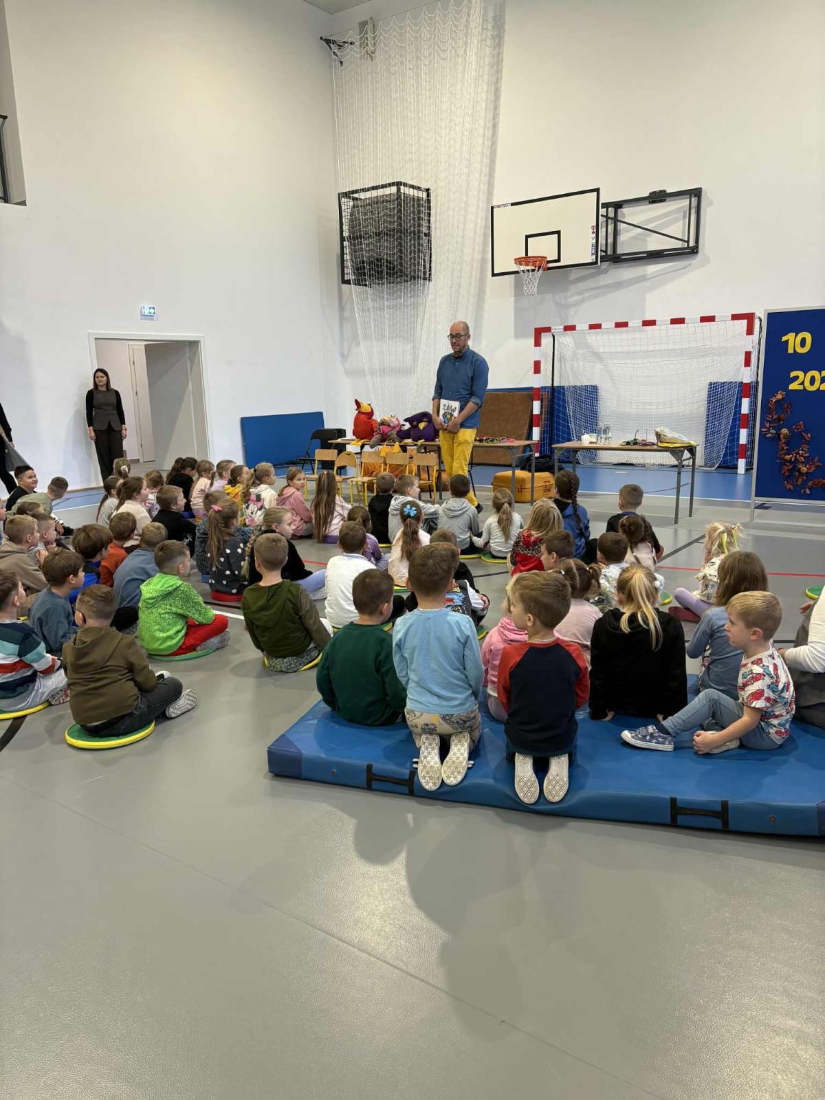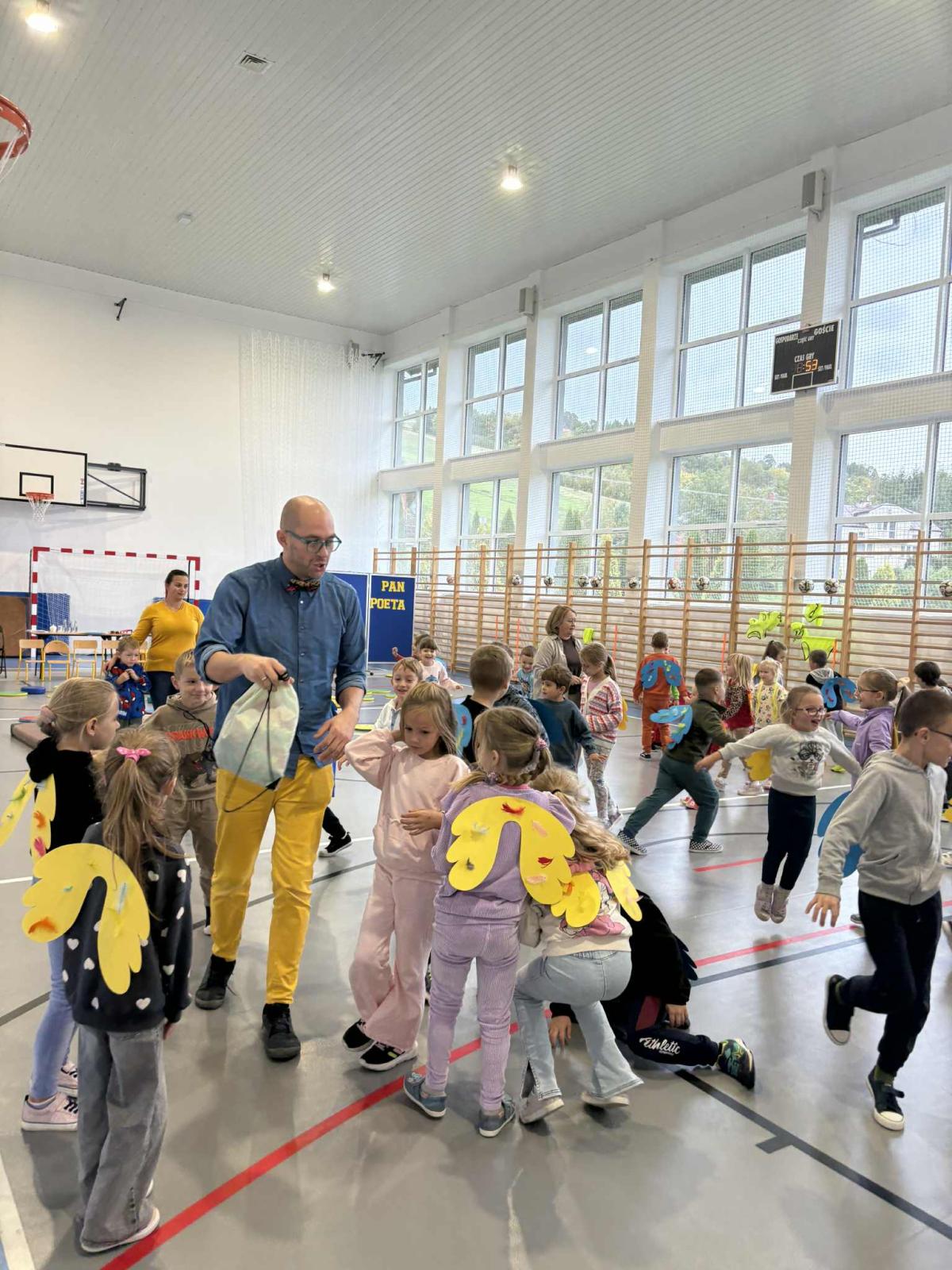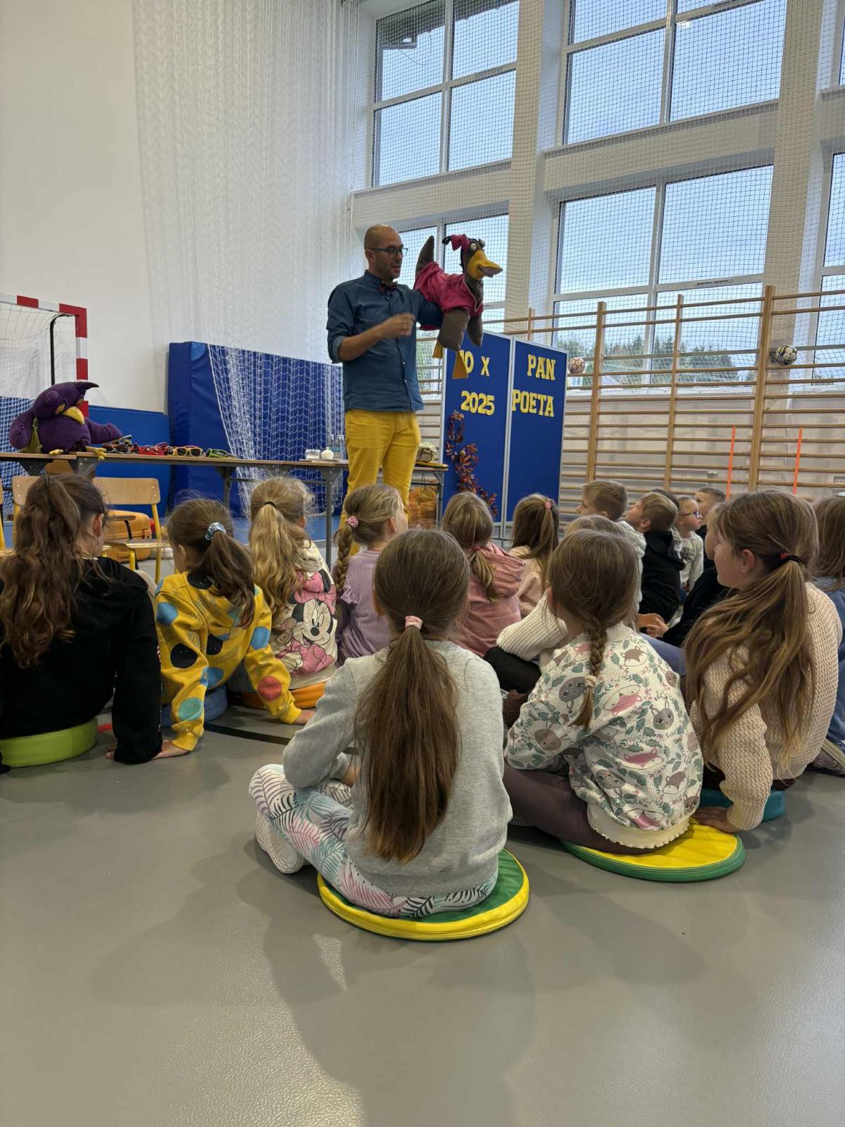 10 października 2025r. w Zespole Szkolno- Przedszkolnym Nr 2 w Ropie odbyło się spotkanie autorskie dla dzieci. Było to prawdziwe literackie SHOW z Panem Poetą! Dwumetrowy pan z muszką, walizki pełne rekwizytów i worek kolorowych balonów to można było zobaczyć w naszej szkole. Balony fruwały pod sufitem, pacynki mówiły ludzkim głosem, a dzieci przebierały się. Z „Kaczką, co przebrała miarkę” Dzieci odkrywały barwną kaczą garderobę. A w niej blisko pięćdziesiąt kolorowych okularów. Ogromna pacynka (bohaterka książki) recytowała dzieciom swoją historię. „Kury, co tyła na diecie” można było dotknąć, pobawić się z nią, a nawet nakarmić zdrowymi owocami i warzywami. Po przeczytaniu książki „Pawia, co ogon miał z przyjaźni„, Pan Poeta pytał dzieci, czy też czasem bywają smutne (jak paw z książki, który zgubił piórka z ogona). Na koniec dzieci ozdobiły swoje skrzydła z papieru kolorowymi piórkami. Młodzi czytelnicy byli pełni wrażeń i pozytywnych emocji, które od tej pory będą kojarzyć się ze spotkaniami autorskimi, książką i czytaniem.