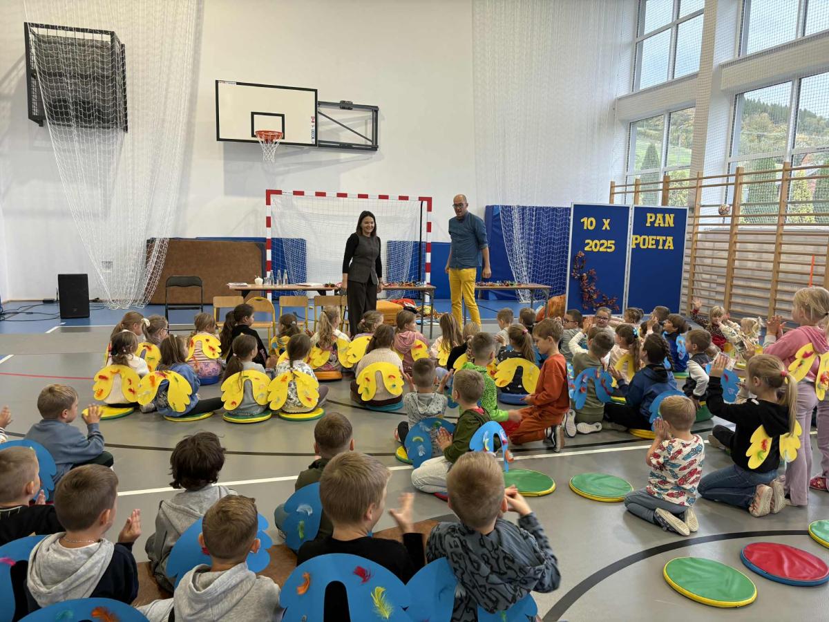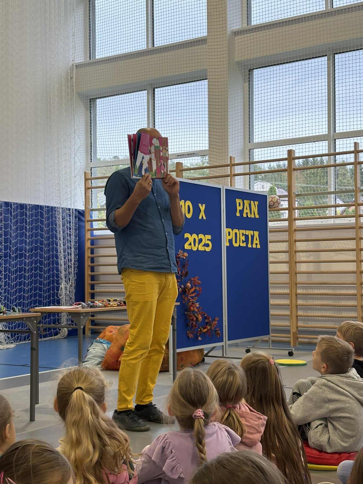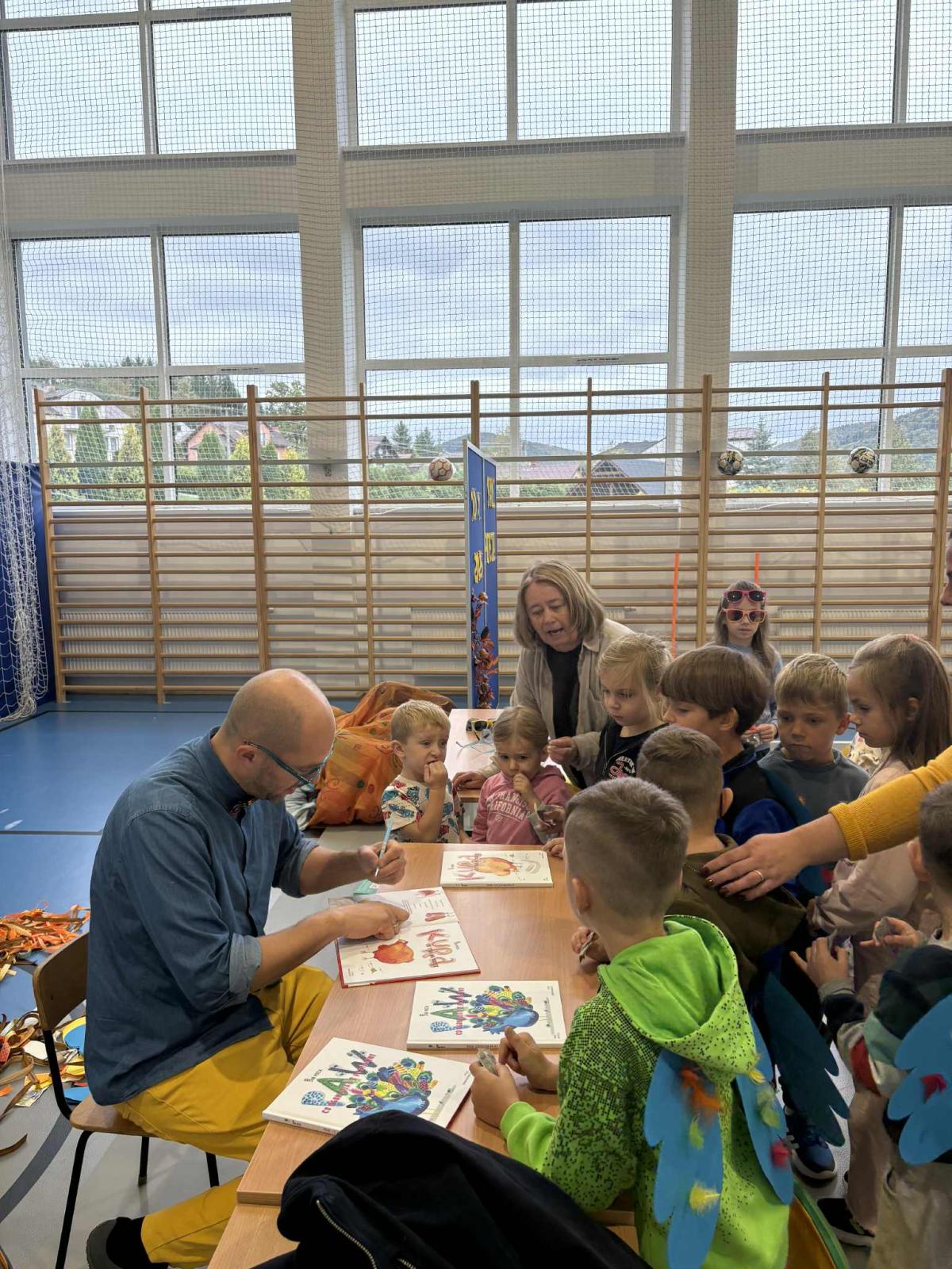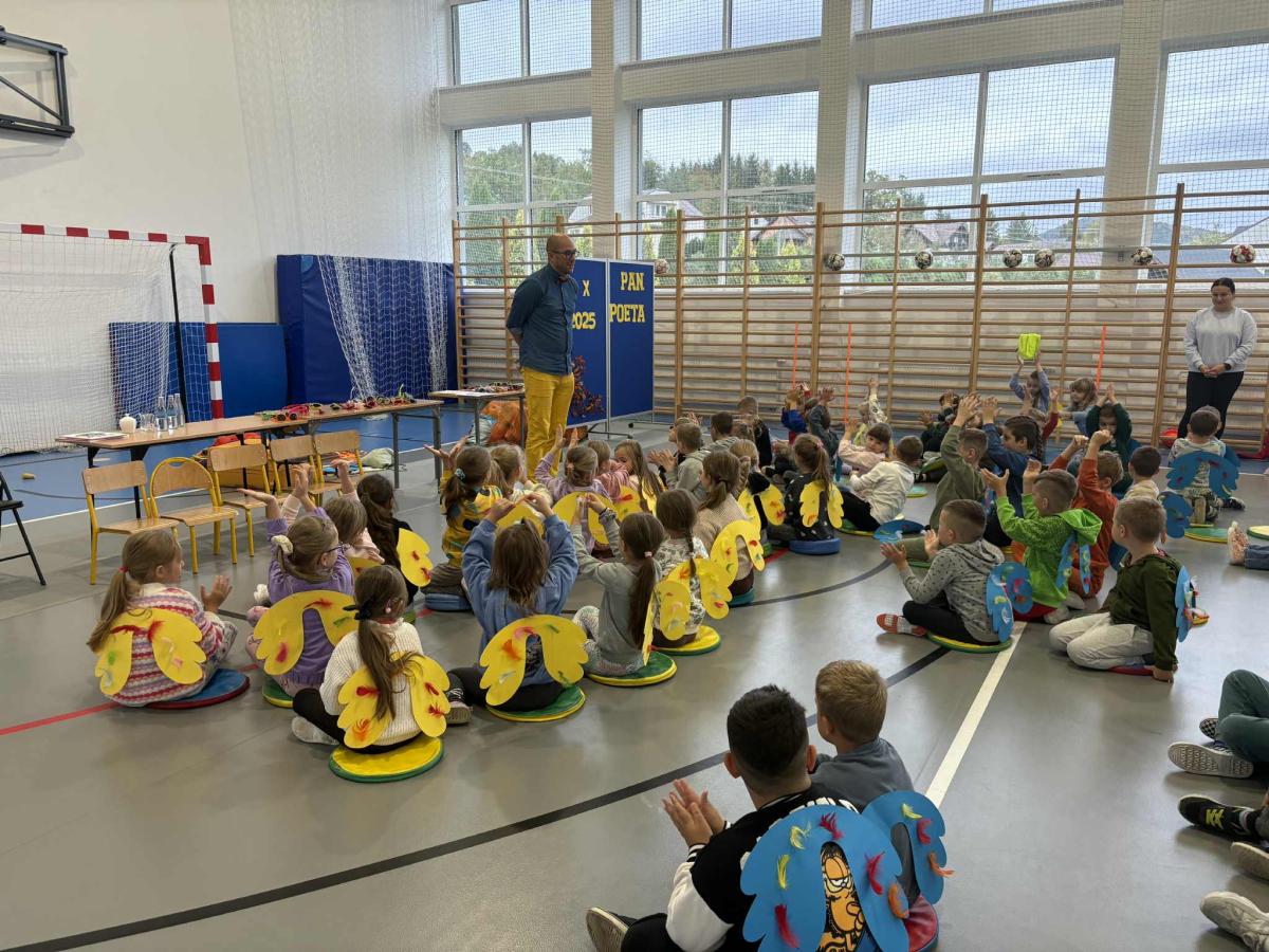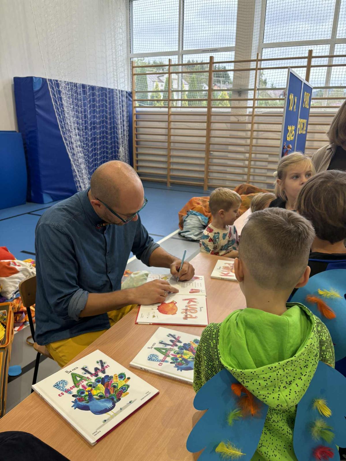 10 października 2025r. w Zespole Szkolno- Przedszkolnym Nr 2 w Ropie odbyło się spotkanie autorskie dla dzieci. Było to prawdziwe literackie SHOW z Panem Poetą! Dwumetrowy pan z muszką, walizki pełne rekwizytów i worek kolorowych balonów to można było zobaczyć w naszej szkole. Balony fruwały pod sufitem, pacynki mówiły ludzkim głosem, a dzieci przebierały się. Z „Kaczką, co przebrała miarkę” Dzieci odkrywały barwną kaczą garderobę. A w niej blisko pięćdziesiąt kolorowych okularów. Ogromna pacynka (bohaterka książki) recytowała dzieciom swoją historię. „Kury, co tyła na diecie” można było dotknąć, pobawić się z nią, a nawet nakarmić zdrowymi owocami i warzywami. Po przeczytaniu książki „Pawia, co ogon miał z przyjaźni„, Pan Poeta pytał dzieci, czy też czasem bywają smutne (jak paw z książki, który zgubił piórka z ogona). Na koniec dzieci ozdobiły swoje skrzydła z papieru kolorowymi piórkami. Młodzi czytelnicy byli pełni wrażeń i pozytywnych emocji, które od tej pory będą kojarzyć się ze spotkaniami autorskimi, książką i czytaniem.