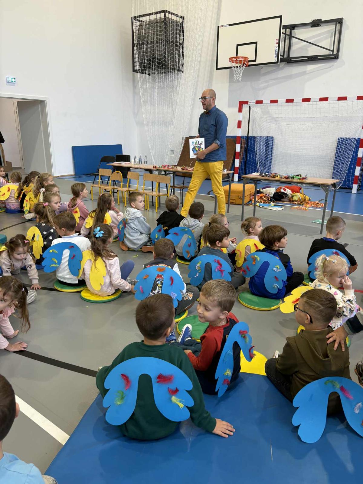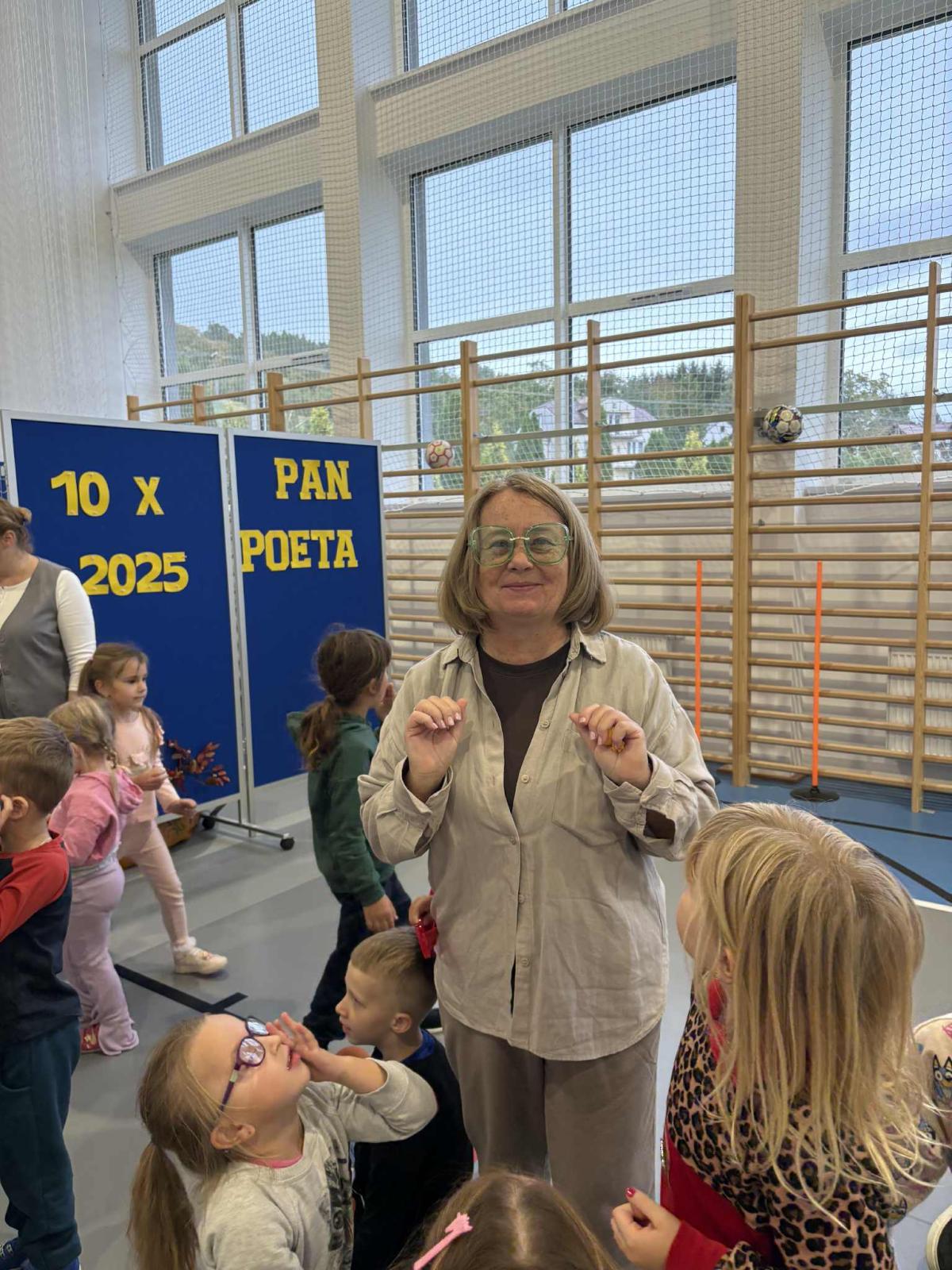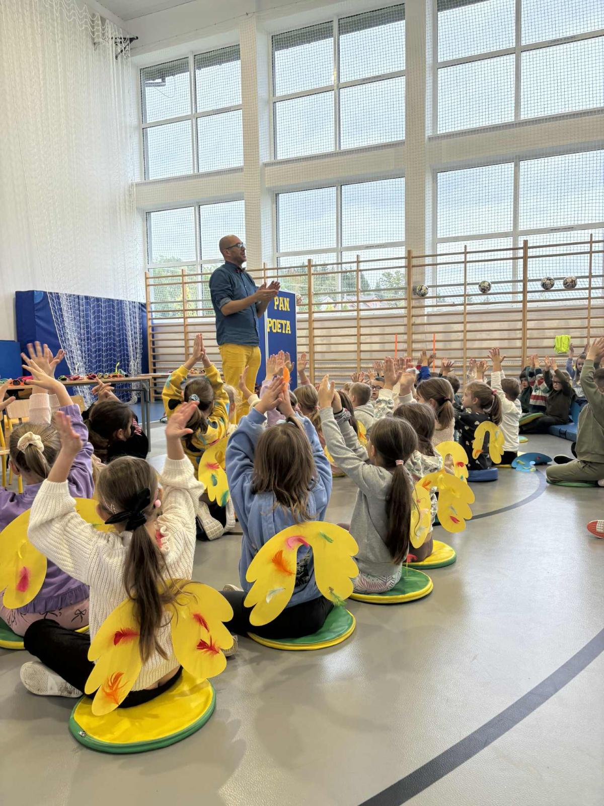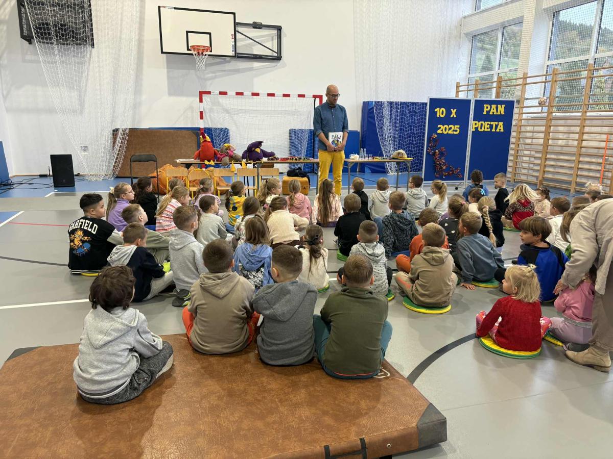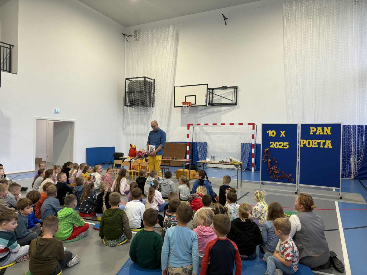 10 października 2025r. w Zespole Szkolno- Przedszkolnym Nr 2 w Ropie odbyło się spotkanie autorskie dla dzieci. Było to prawdziwe literackie SHOW z Panem Poetą! Dwumetrowy pan z muszką, walizki pełne rekwizytów i worek kolorowych balonów to można było zobaczyć w naszej szkole. Balony fruwały pod sufitem, pacynki mówiły ludzkim głosem, a dzieci przebierały się. Z „Kaczką, co przebrała miarkę” Dzieci odkrywały barwną kaczą garderobę. A w niej blisko pięćdziesiąt kolorowych okularów. Ogromna pacynka (bohaterka książki) recytowała dzieciom swoją historię. „Kury, co tyła na diecie” można było dotknąć, pobawić się z nią, a nawet nakarmić zdrowymi owocami i warzywami. Po przeczytaniu książki „Pawia, co ogon miał z przyjaźni„, Pan Poeta pytał dzieci, czy też czasem bywają smutne (jak paw z książki, który zgubił piórka z ogona). Na koniec dzieci ozdobiły swoje skrzydła z papieru kolorowymi piórkami. Młodzi czytelnicy byli pełni wrażeń i pozytywnych emocji, które od tej pory będą kojarzyć się ze spotkaniami autorskimi, książką i czytaniem.