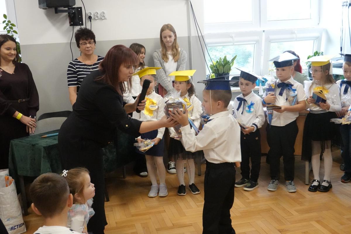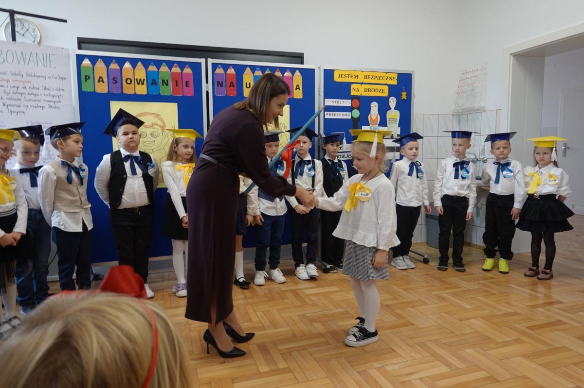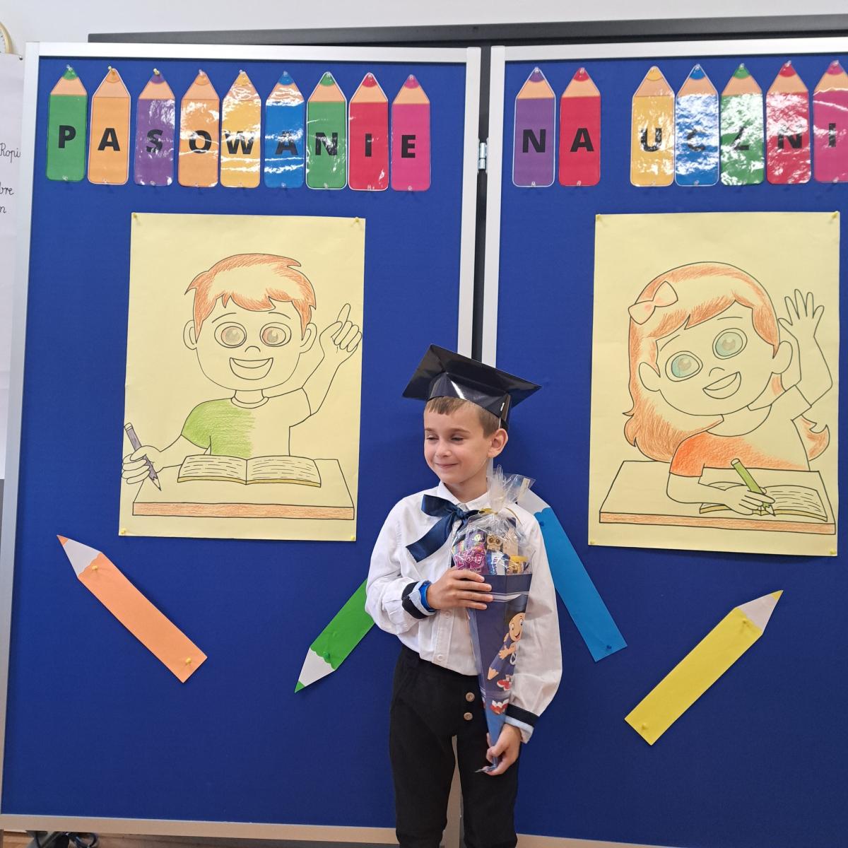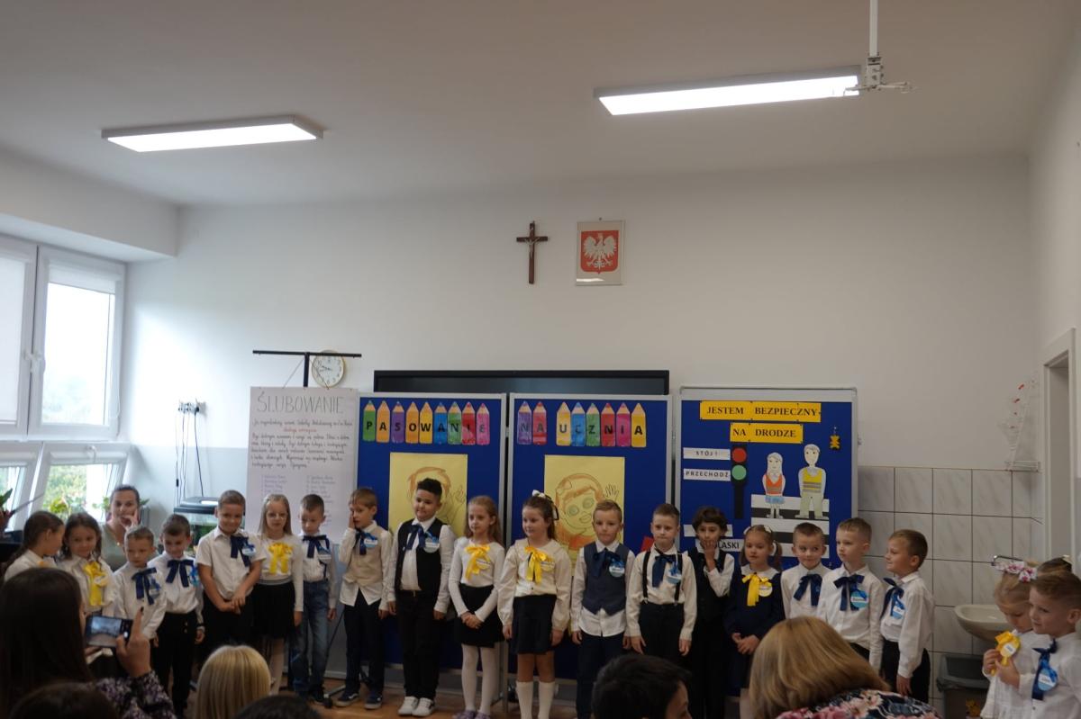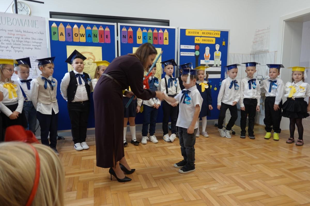 9 października 2025 r. odbyła się w naszej szkole uroczystość „Pasowania na ucznia”. Jest to szczególny dzień, który na długo pozostanie w pamięci każdego ucznia klasy pierwszej. W tym dniu dzieci oficjalnie przyjęte zostały do grona uczniów naszej szkoły. Podczas uroczystości pierwszoklasiści pokazali, że potrafią pięknie śpiewać i recytować wiersze. Zdali „egzamin” przeprowadzony przez uczennice z klasy 7 Amelkę i Emilkę. Najważniejszą częścią uroczystości, na którą wszyscy czekali było ślubowanie oraz pasowanie każdego ucznia wielkim ołówkiem przez Panią Dyrektor Szkoły Mariolę Spólnik. Pierwszaki głośno i z przekonaniem ślubowały być dobrymi i pilnymi uczniami, rzetelnie wypełniać swoje obowiązki, szanować nauczycieli i ludzi starszych oraz wyrosnąć na mądrych Polaków kochających swoją Ojczyznę. Po ceremonii dzieci otrzymały dyplomy i odblaski oraz inne pamiątki od Samorządu Uczniowskiego i rodziców. Wszystkim pierwszoklasistom w tak ważnym dla nich dniu życzymy wielu sukcesów na nowej drodze obowiązków szkolnych.