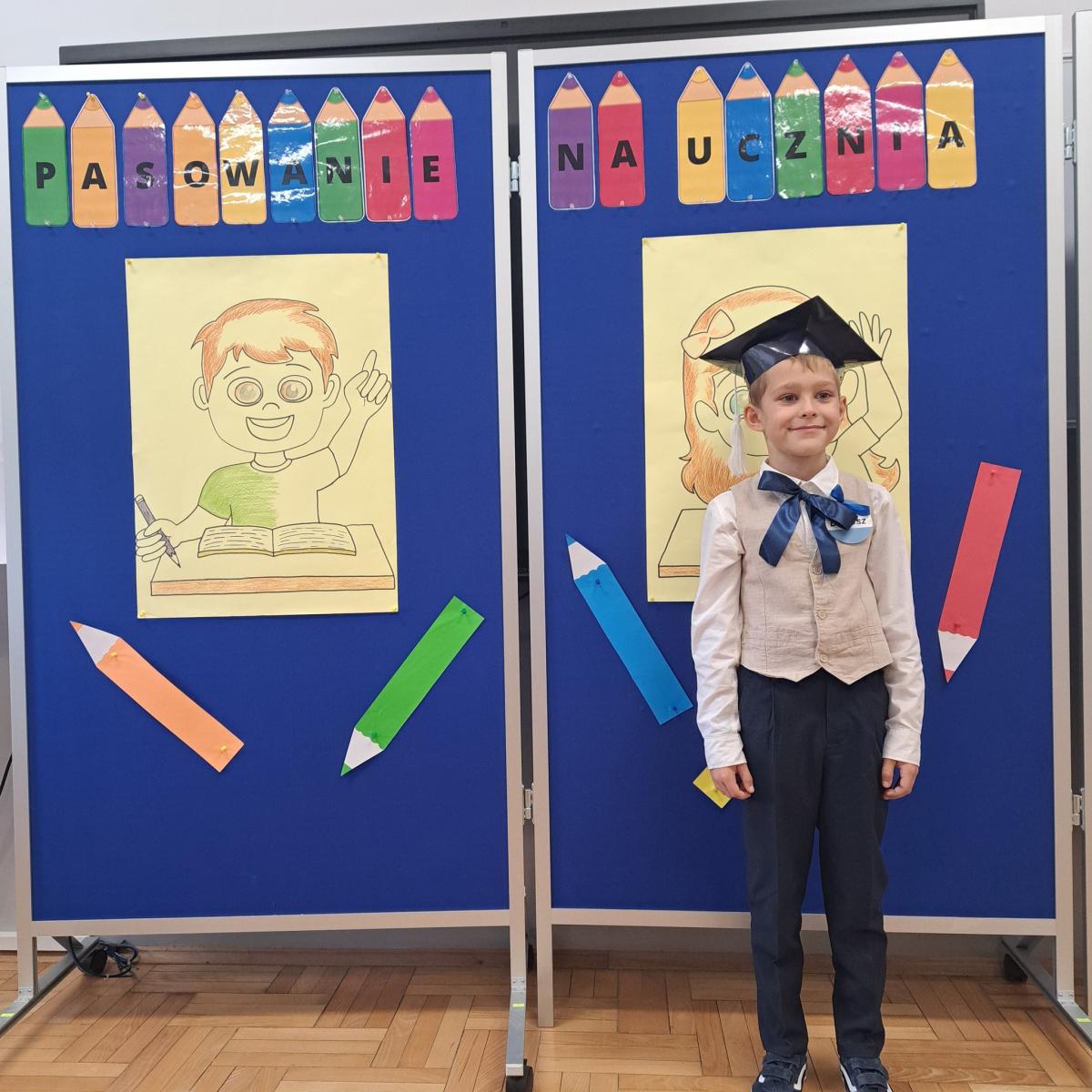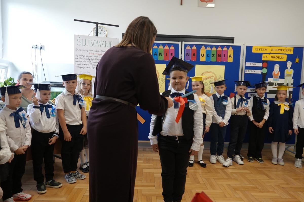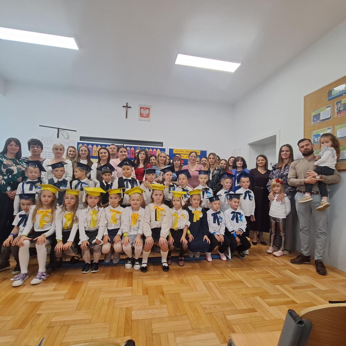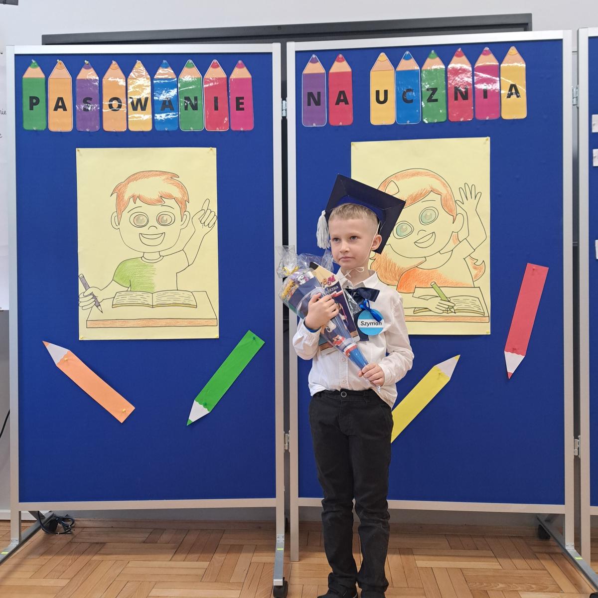 9 października 2025 r. odbyła się w naszej szkole uroczystość „Pasowania na ucznia”. Jest to szczególny dzień, który na długo pozostanie w pamięci każdego ucznia klasy pierwszej. W tym dniu dzieci oficjalnie przyjęte zostały do grona uczniów naszej szkoły. Podczas uroczystości pierwszoklasiści pokazali, że potrafią pięknie śpiewać i recytować wiersze. Zdali „egzamin” przeprowadzony przez uczennice z klasy 7 Amelkę i Emilkę. Najważniejszą częścią uroczystości, na którą wszyscy czekali było ślubowanie oraz pasowanie każdego ucznia wielkim ołówkiem przez Panią Dyrektor Szkoły Mariolę Spólnik. Pierwszaki głośno i z przekonaniem ślubowały być dobrymi i pilnymi uczniami, rzetelnie wypełniać swoje obowiązki, szanować nauczycieli i ludzi starszych oraz wyrosnąć na mądrych Polaków kochających swoją Ojczyznę. Po ceremonii dzieci otrzymały dyplomy i odblaski oraz inne pamiątki od Samorządu Uczniowskiego i rodziców. Wszystkim pierwszoklasistom w tak ważnym dla nich dniu życzymy wielu sukcesów na nowej drodze obowiązków szkolnych.