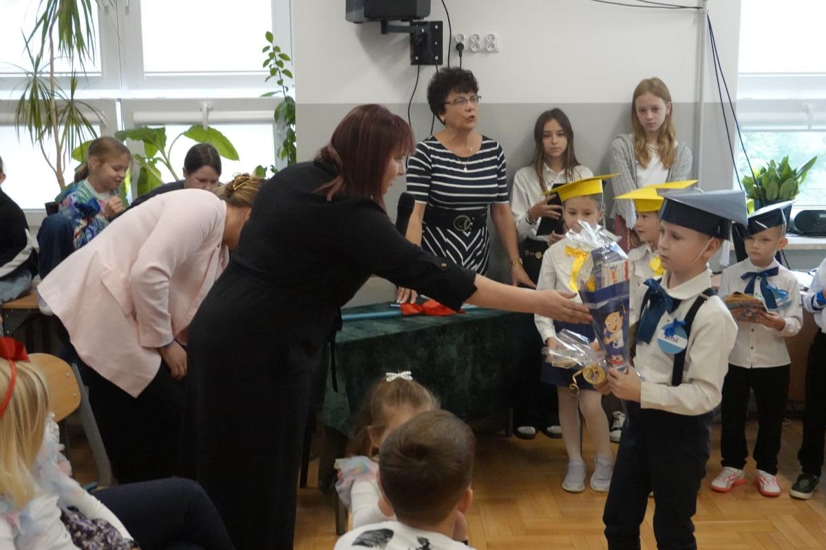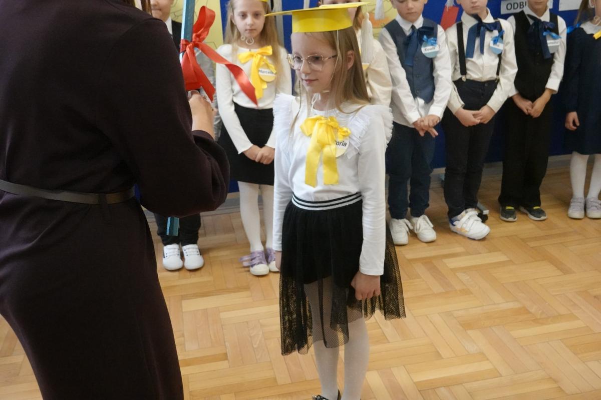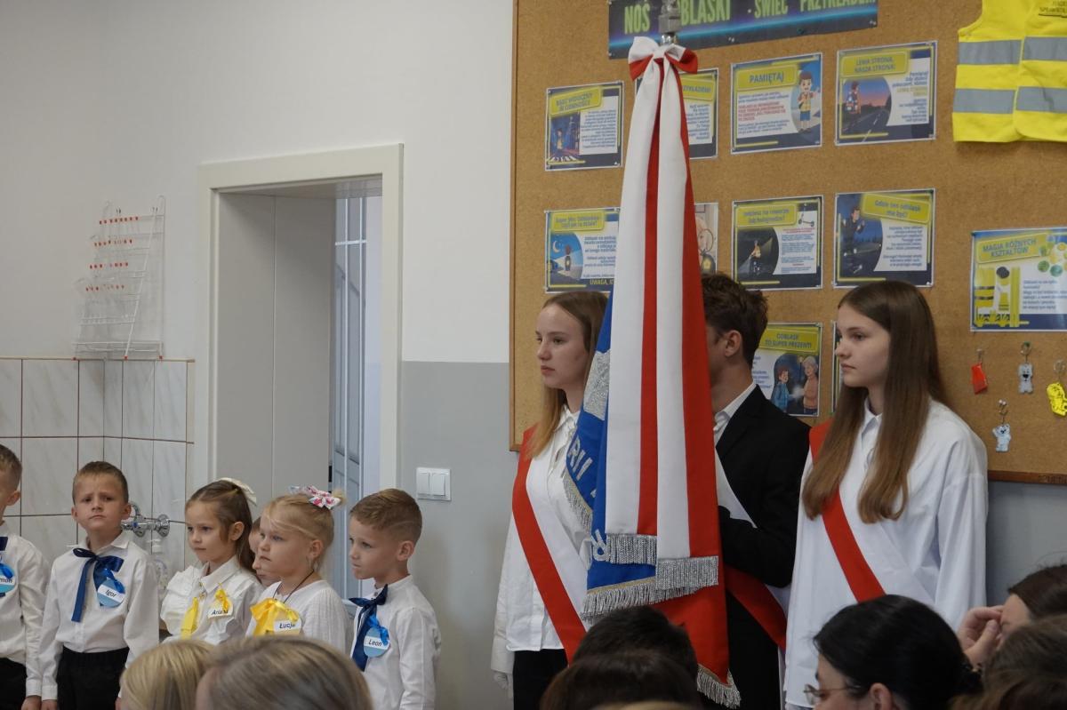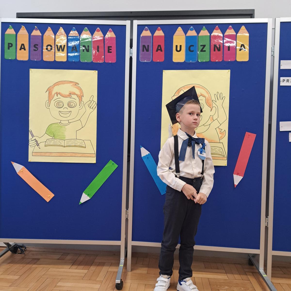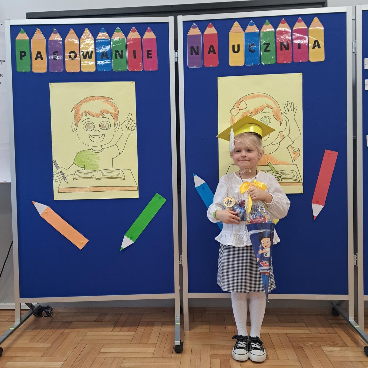 9 października 2025 r. odbyła się w naszej szkole uroczystość „Pasowania na ucznia”. Jest to szczególny dzień, który na długo pozostanie w pamięci każdego ucznia klasy pierwszej. W tym dniu dzieci oficjalnie przyjęte zostały do grona uczniów naszej szkoły. Podczas uroczystości pierwszoklasiści pokazali, że potrafią pięknie śpiewać i recytować wiersze. Zdali „egzamin” przeprowadzony przez uczennice z klasy 7 Amelkę i Emilkę. Najważniejszą częścią uroczystości, na którą wszyscy czekali było ślubowanie oraz pasowanie każdego ucznia wielkim ołówkiem przez Panią Dyrektor Szkoły Mariolę Spólnik. Pierwszaki głośno i z przekonaniem ślubowały być dobrymi i pilnymi uczniami, rzetelnie wypełniać swoje obowiązki, szanować nauczycieli i ludzi starszych oraz wyrosnąć na mądrych Polaków kochających swoją Ojczyznę. Po ceremonii dzieci otrzymały dyplomy i odblaski oraz inne pamiątki od Samorządu Uczniowskiego i rodziców. Wszystkim pierwszoklasistom w tak ważnym dla nich dniu życzymy wielu sukcesów na nowej drodze obowiązków szkolnych.
