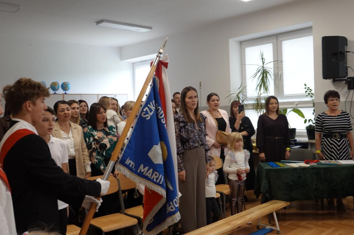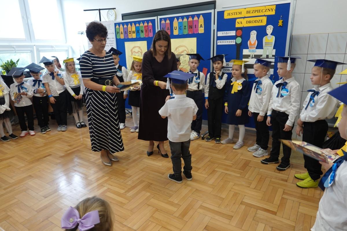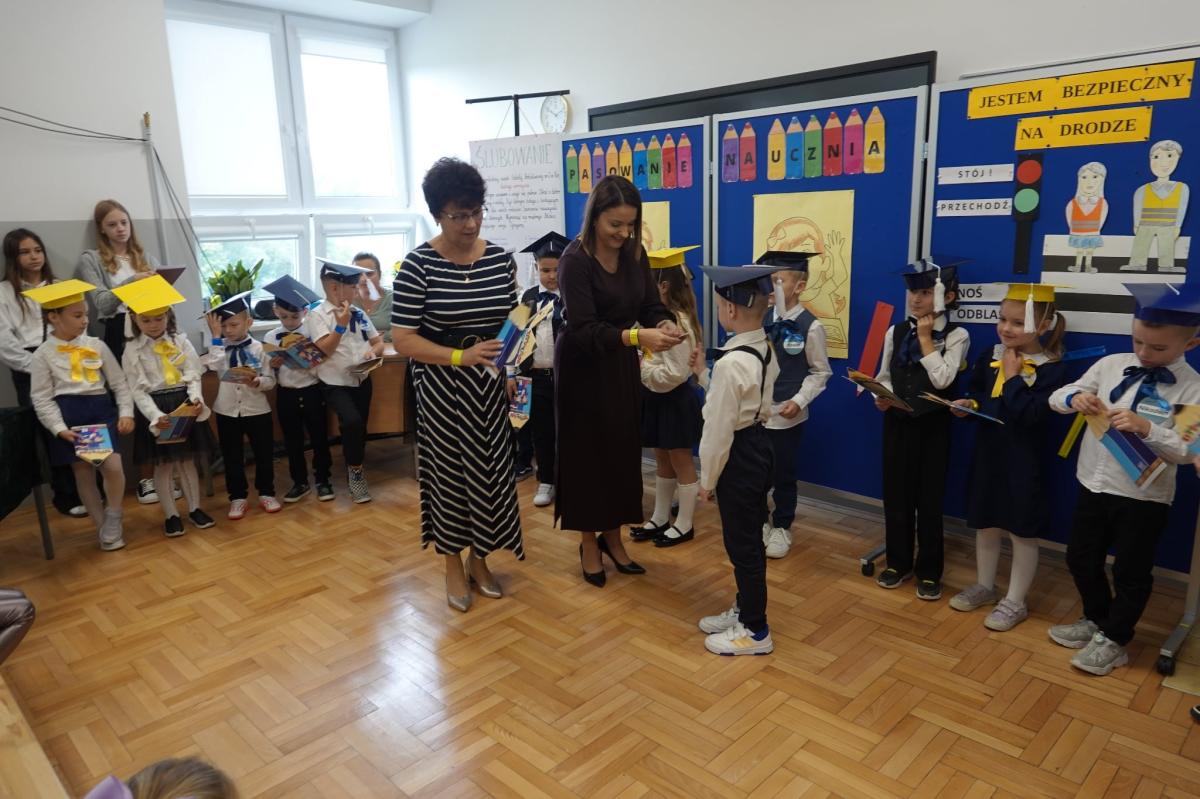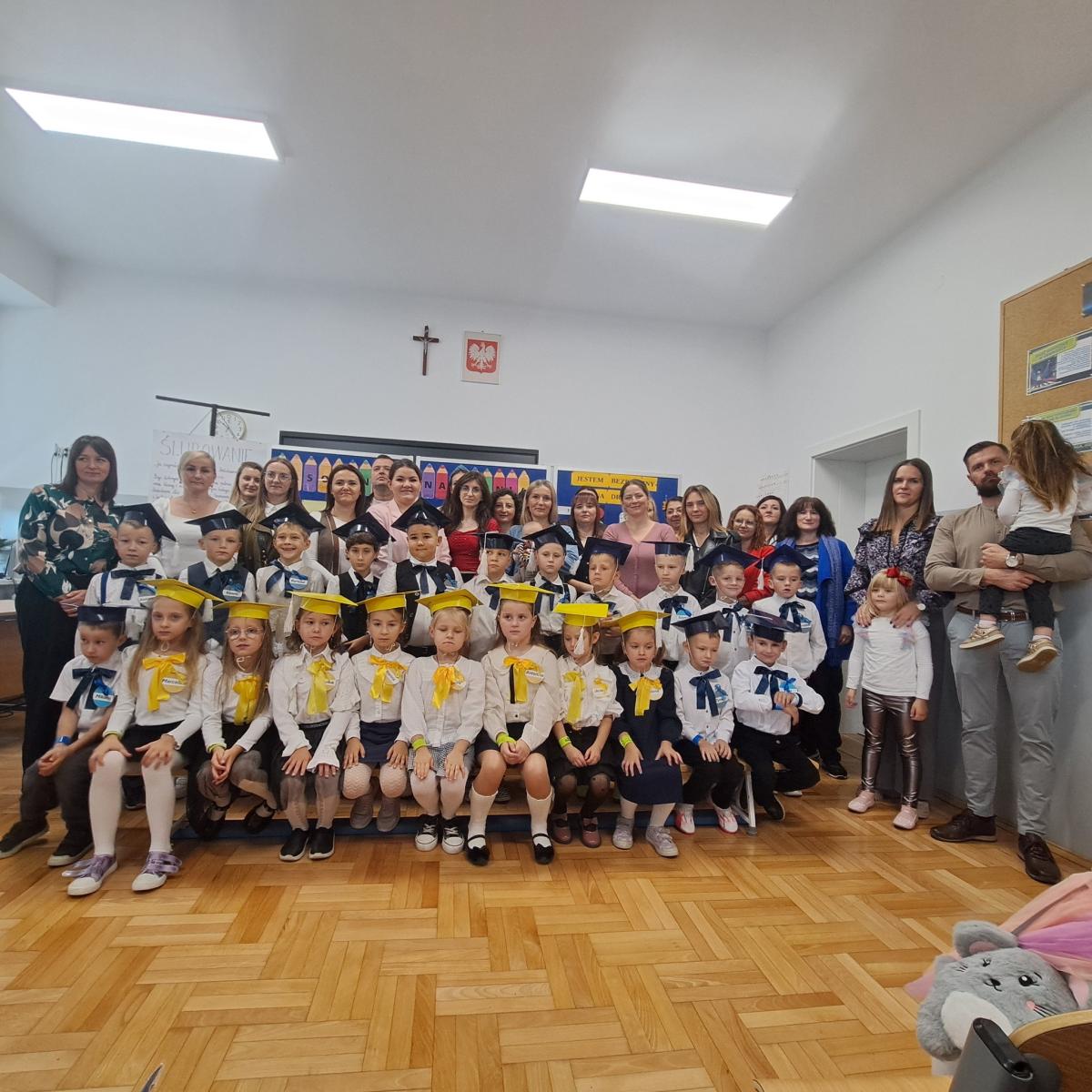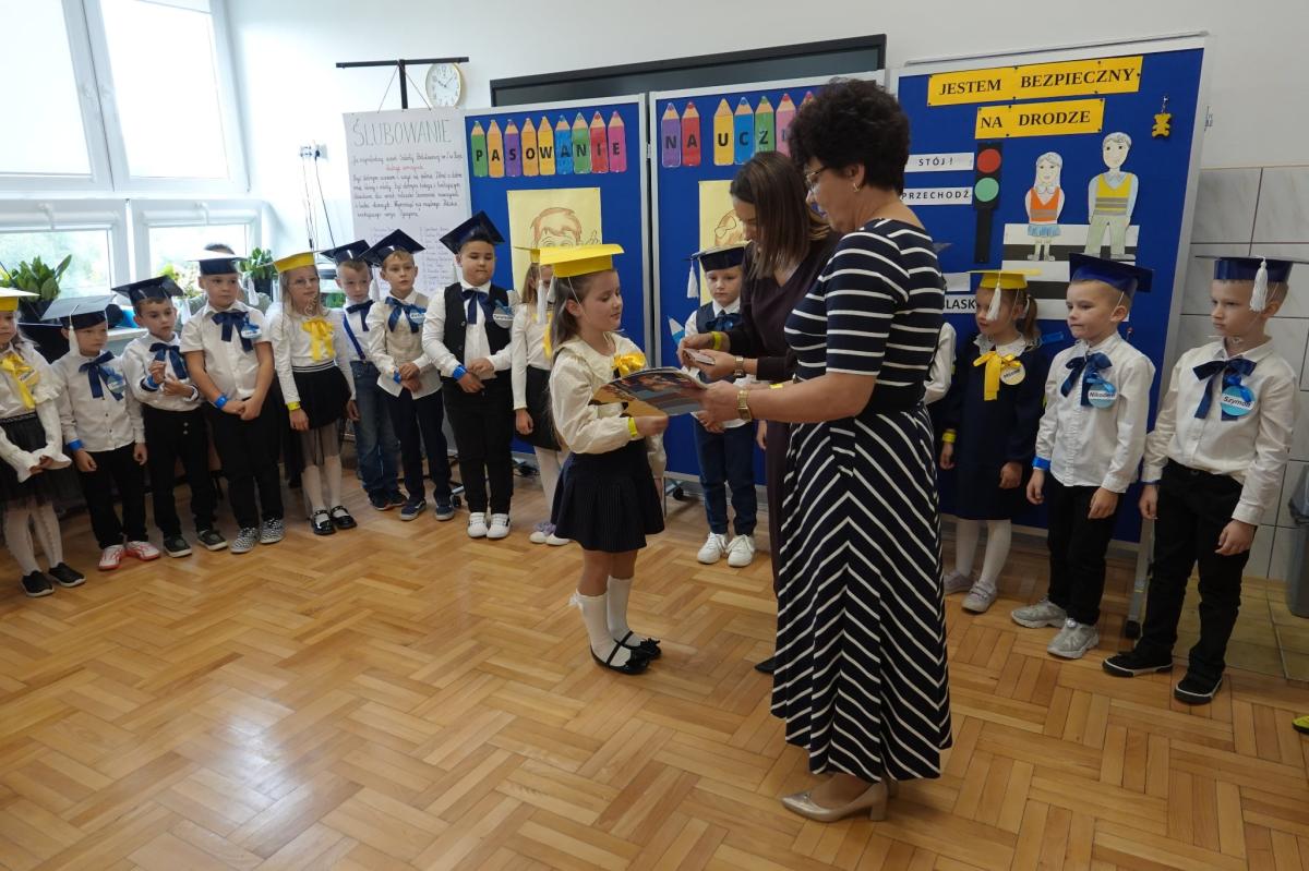 9 października 2025 r. odbyła się w naszej szkole uroczystość „Pasowania na ucznia”. Jest to szczególny dzień, który na długo pozostanie w pamięci każdego ucznia klasy pierwszej. W tym dniu dzieci oficjalnie przyjęte zostały do grona uczniów naszej szkoły. Podczas uroczystości pierwszoklasiści pokazali, że potrafią pięknie śpiewać i recytować wiersze. Zdali „egzamin” przeprowadzony przez uczennice z klasy 7 Amelkę i Emilkę. Najważniejszą częścią uroczystości, na którą wszyscy czekali było ślubowanie oraz pasowanie każdego ucznia wielkim ołówkiem przez Panią Dyrektor Szkoły Mariolę Spólnik. Pierwszaki głośno i z przekonaniem ślubowały być dobrymi i pilnymi uczniami, rzetelnie wypełniać swoje obowiązki, szanować nauczycieli i ludzi starszych oraz wyrosnąć na mądrych Polaków kochających swoją Ojczyznę. Po ceremonii dzieci otrzymały dyplomy i odblaski oraz inne pamiątki od Samorządu Uczniowskiego i rodziców. Wszystkim pierwszoklasistom w tak ważnym dla nich dniu życzymy wielu sukcesów na nowej drodze obowiązków szkolnych.