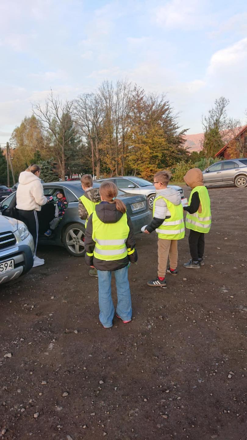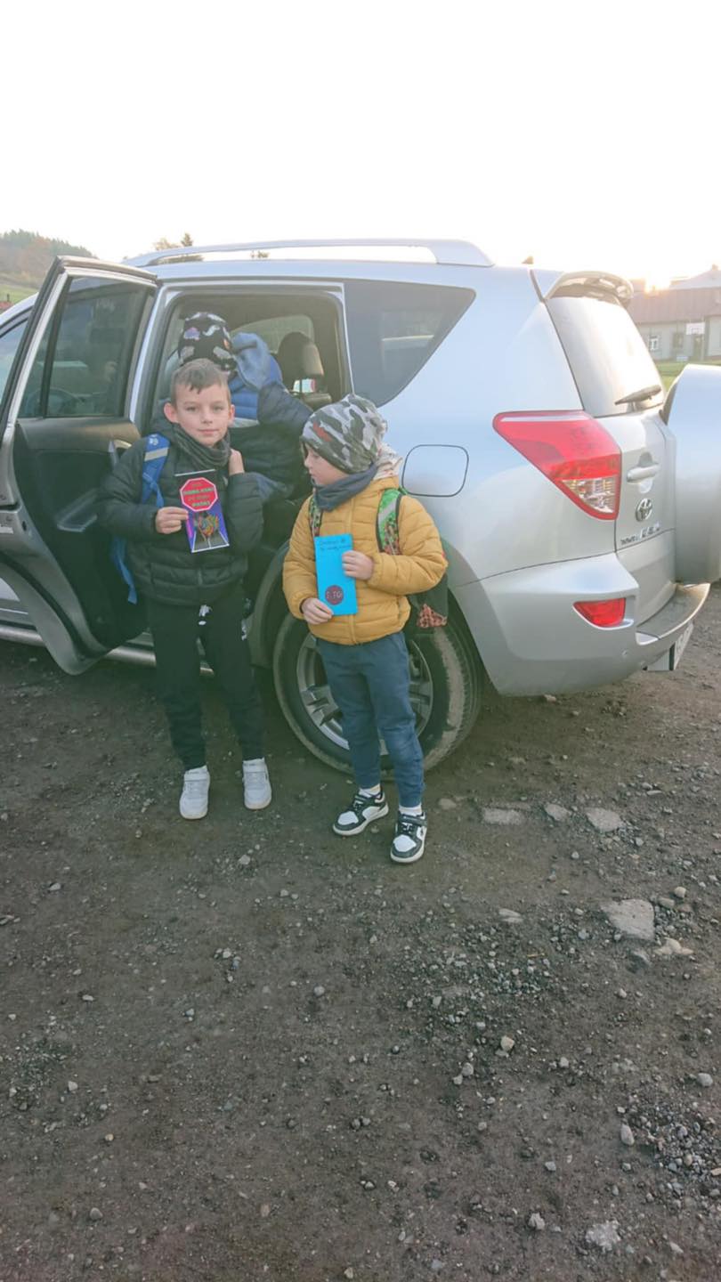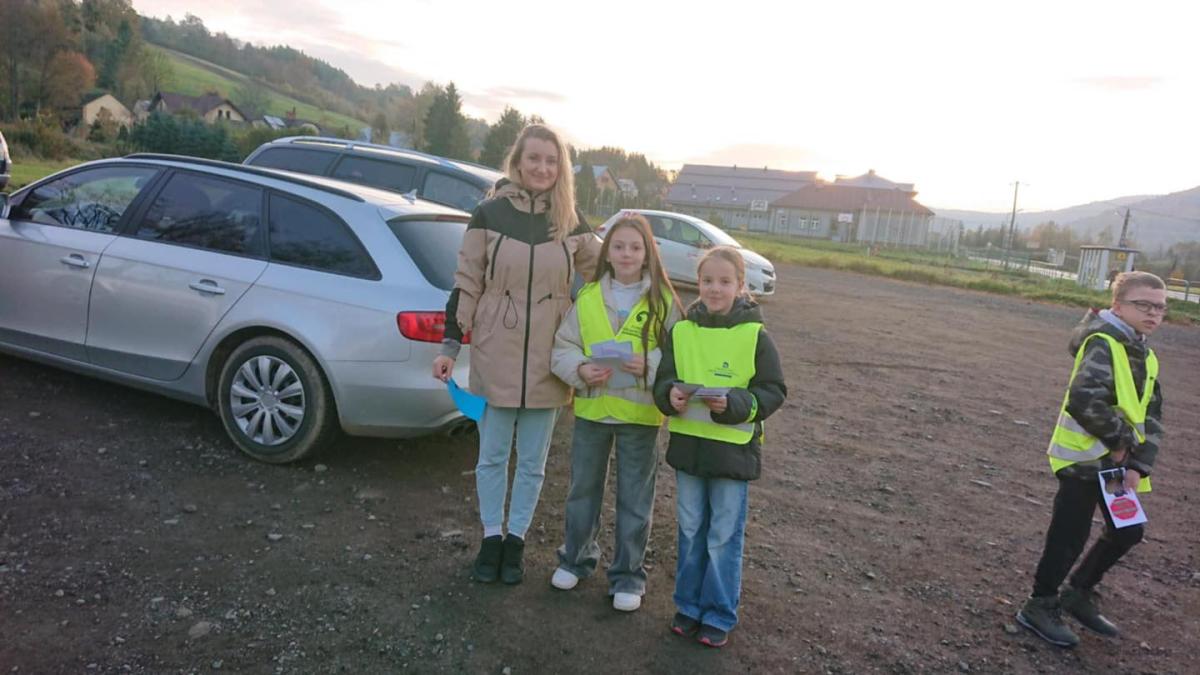 W środowy poranek, 22 października 2025 r., na parkingu szkolnym czwartoklasiści rozdawali własnoręcznie wykonane ulotki z ważnymi przestrogami i apelami o bezpieczną, rozważną jazdę.