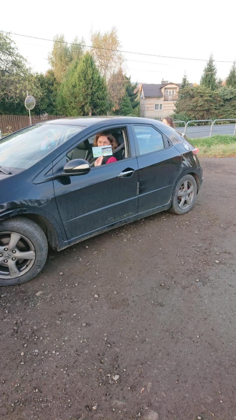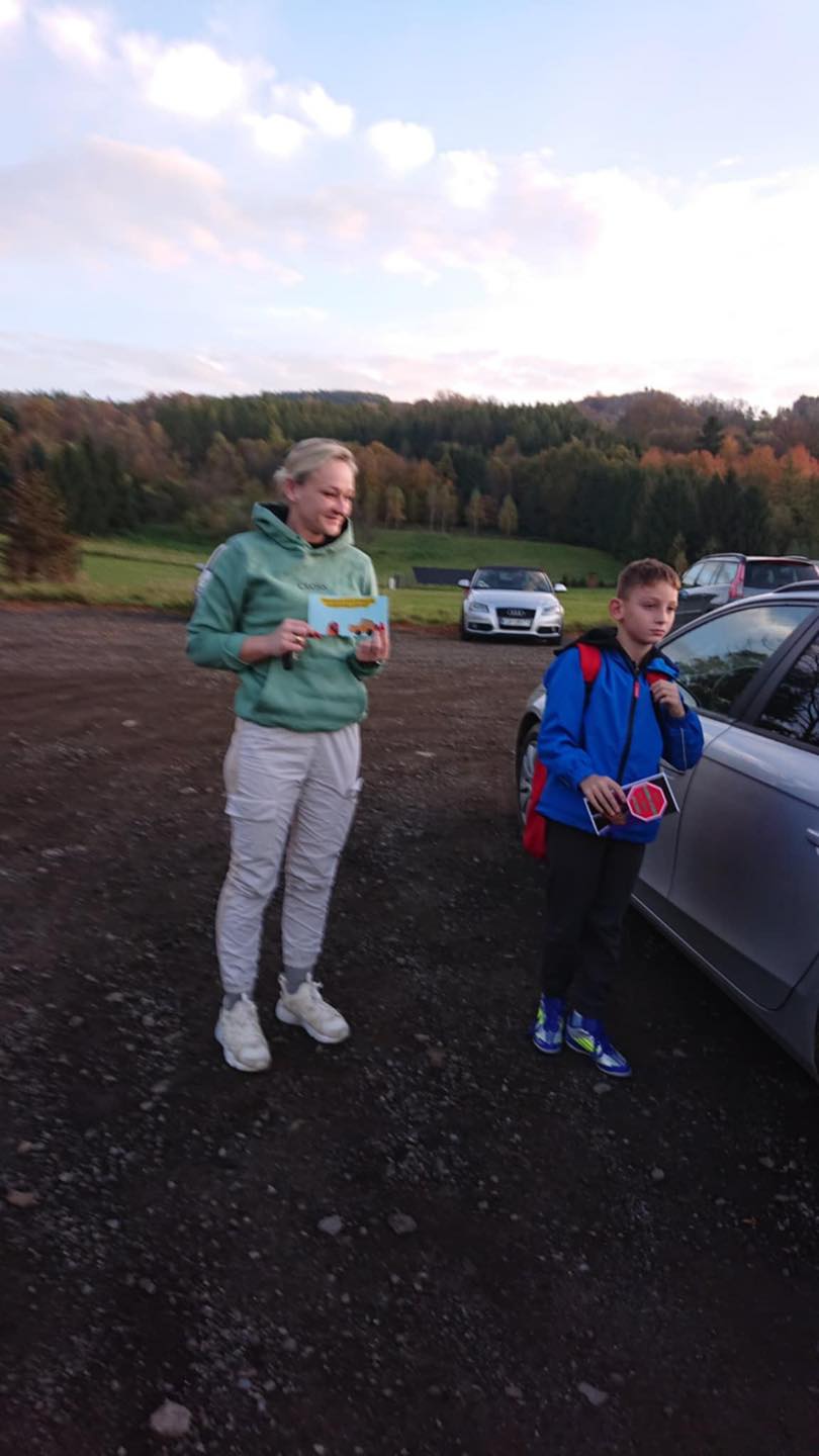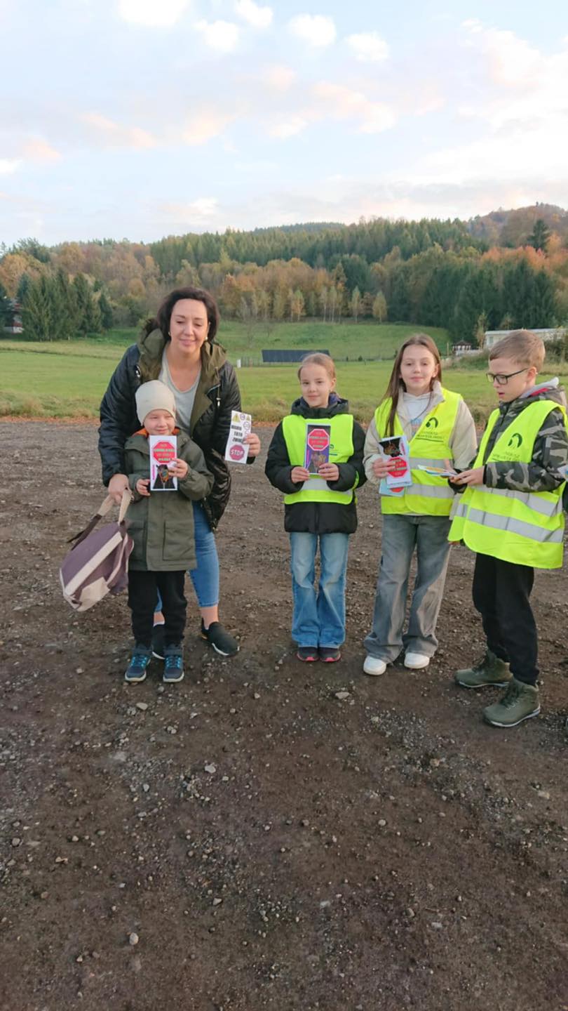 W środowy poranek, 22 października 2025 r., na parkingu szkolnym czwartoklasiści rozdawali własnoręcznie wykonane ulotki z ważnymi przestrogami i apelami o bezpieczną, rozważną jazdę.