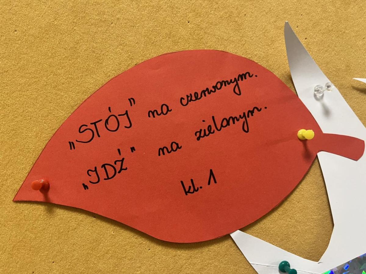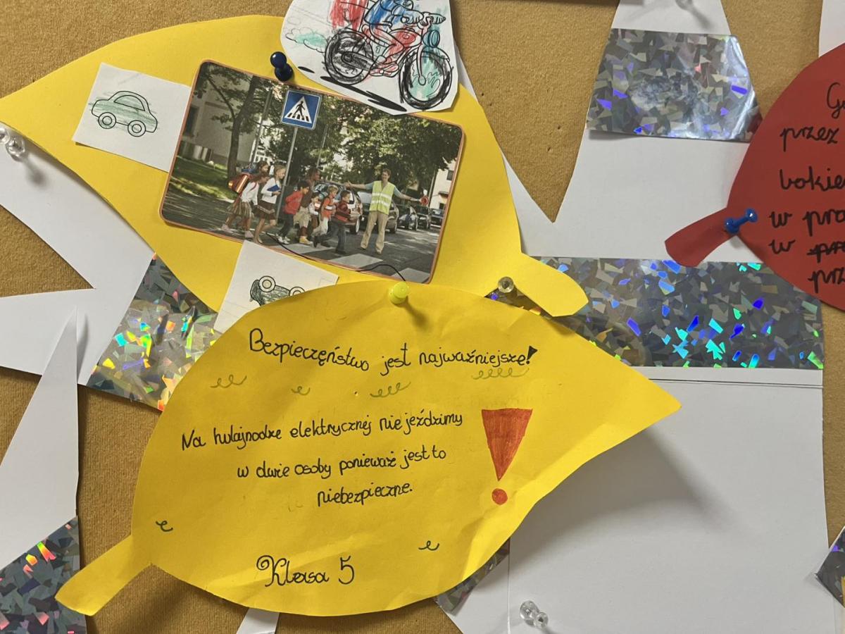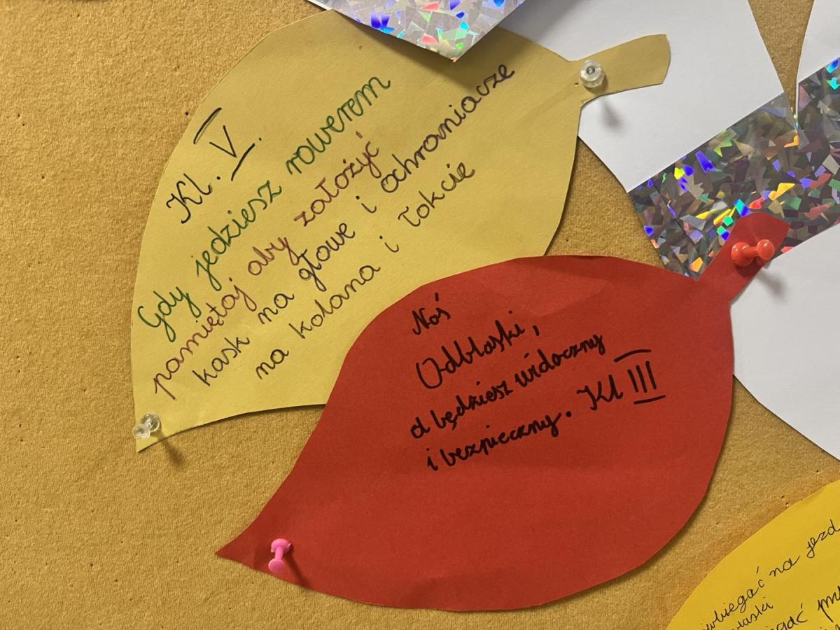 Każda klasa otrzymała zadanie, by na kolorowych kartkach w kształcie liści zapisać zasady bezpiecznego poruszania się po drodze – zarówno pieszo, jak i na rowerach czy hulajnogach. Nie zabrakło też przypomnień o znakach drogowych, odblaskach i odpowiedzialnych zachowaniach uczestników ruchu.