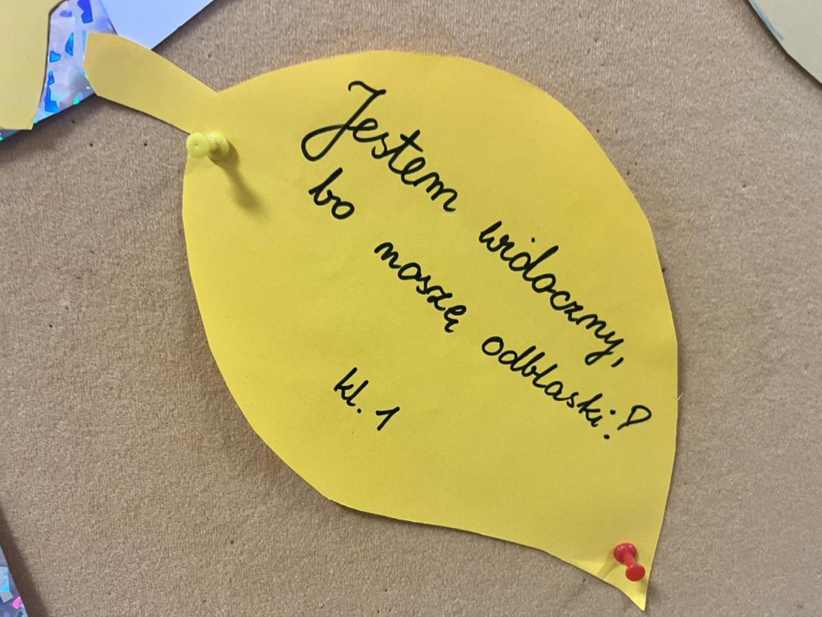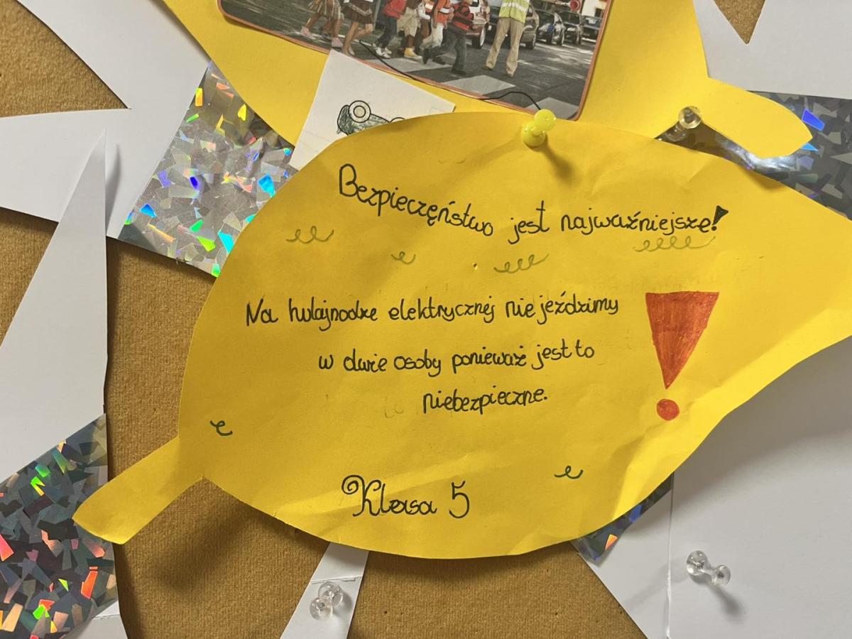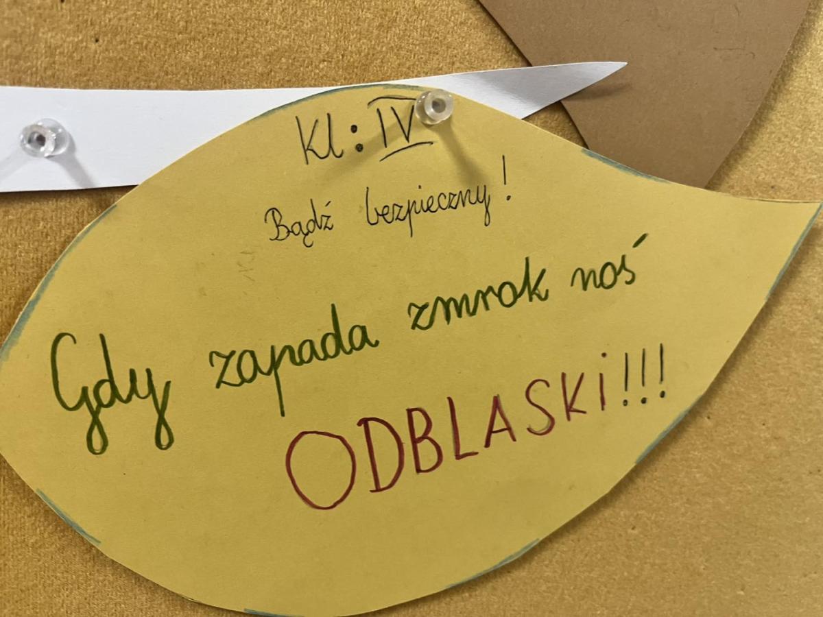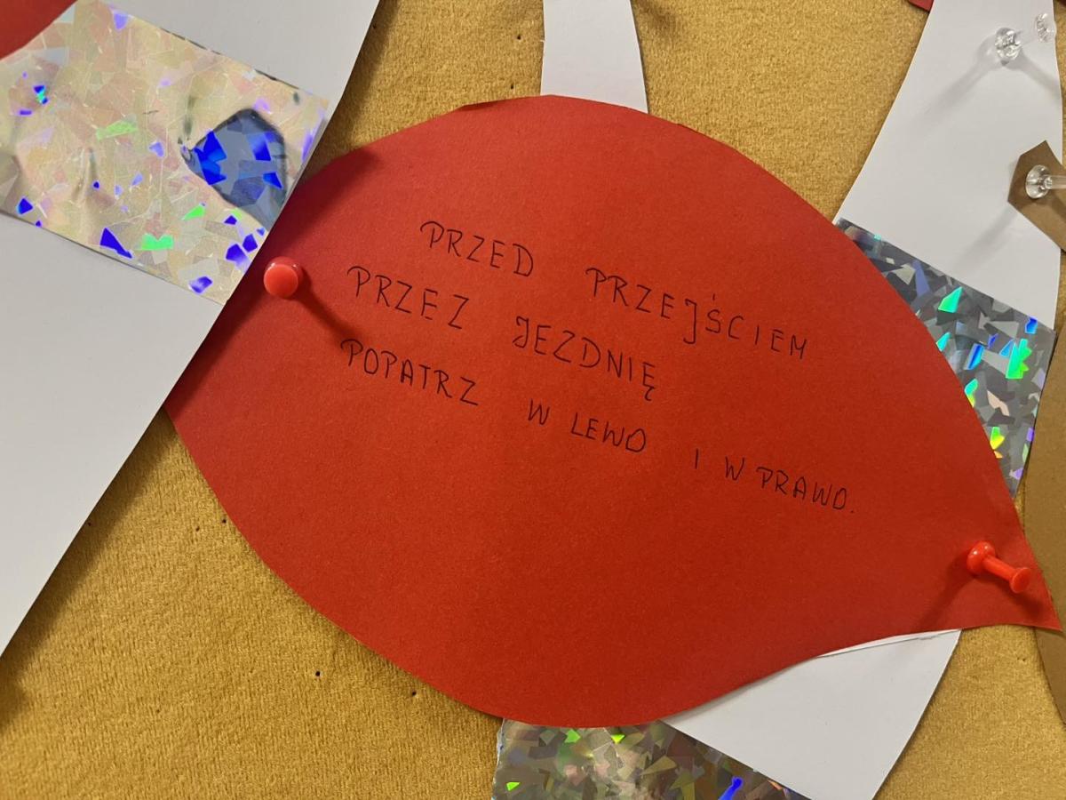 Każda klasa otrzymała zadanie, by na kolorowych kartkach w kształcie liści zapisać zasady bezpiecznego poruszania się po drodze – zarówno pieszo, jak i na rowerach czy hulajnogach. Nie zabrakło też przypomnień o znakach drogowych, odblaskach i odpowiedzialnych zachowaniach uczestników ruchu.