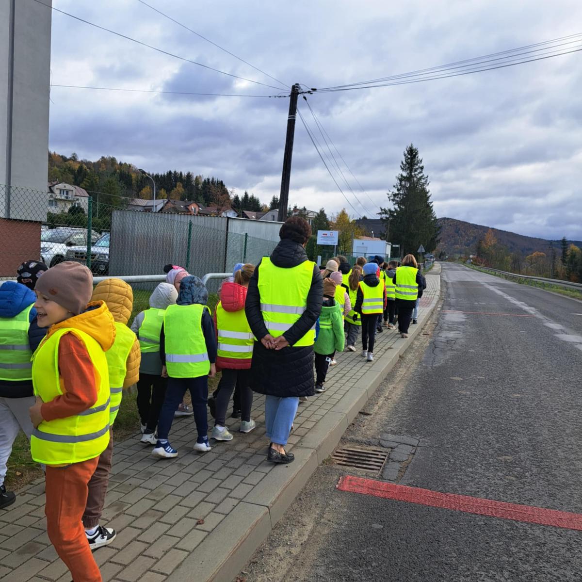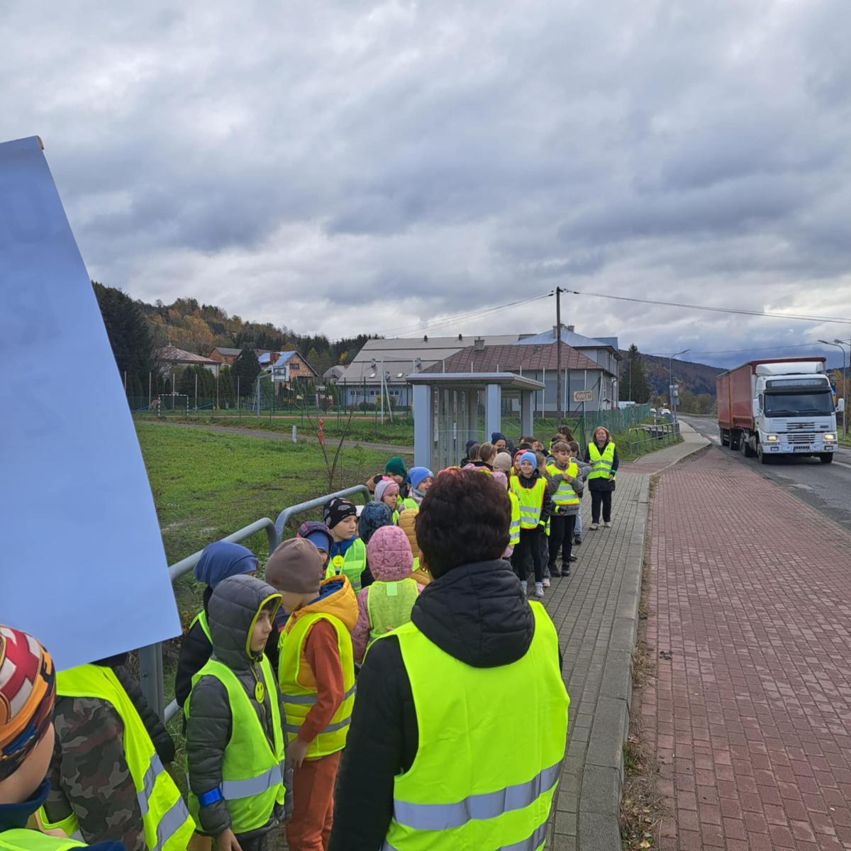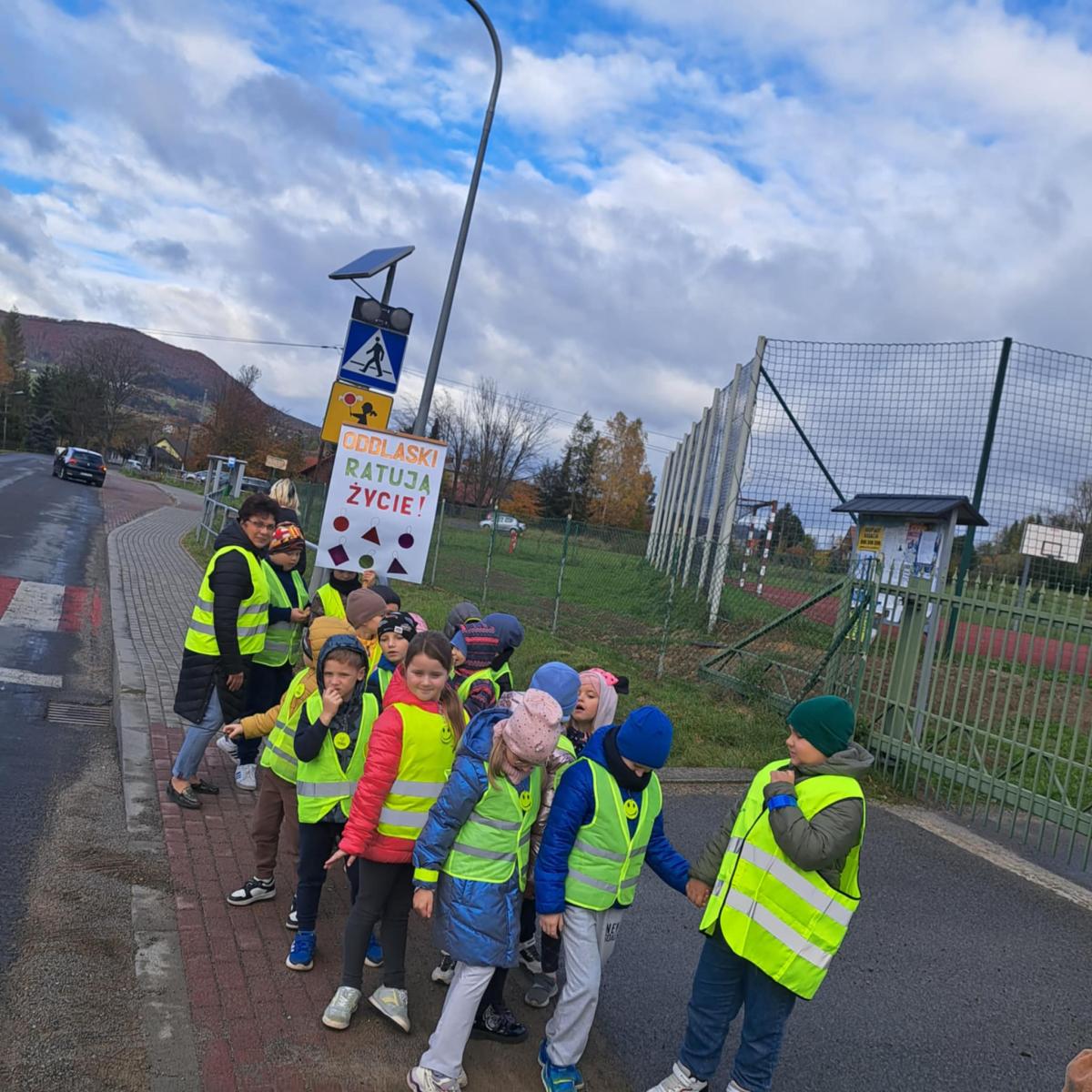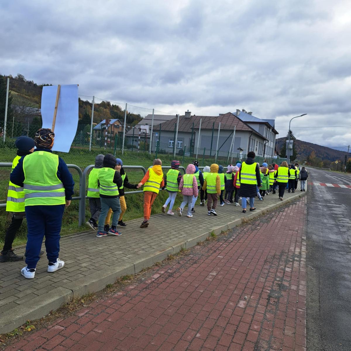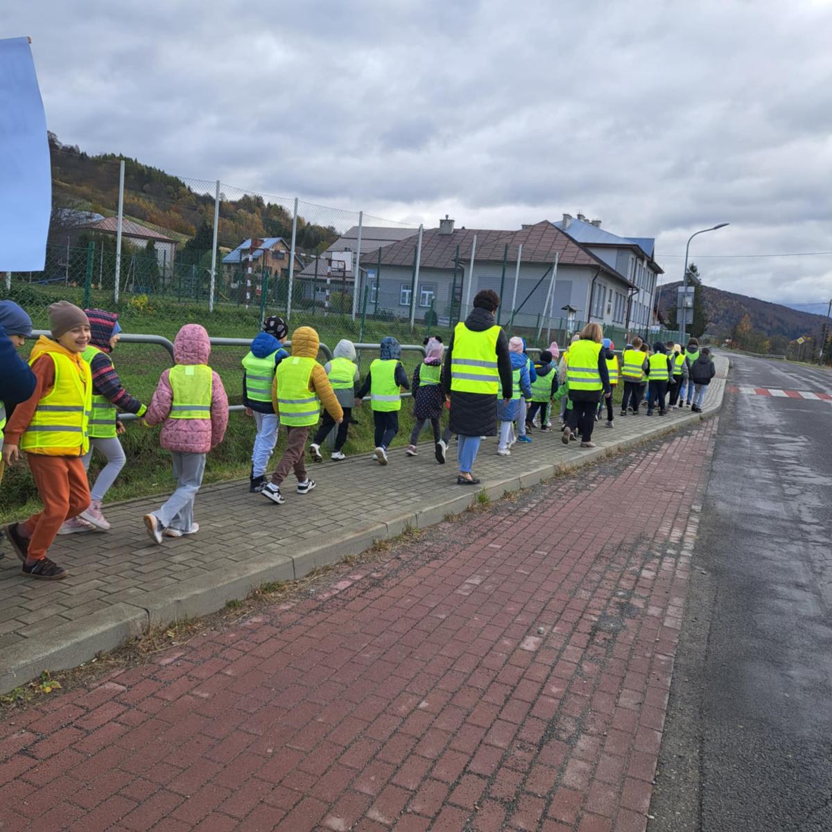 W dniu 28.10.2025 roku uczniowie klas I i III wzięli udział w spacerze odblaskowym, promującym bezpieczeństwo na drodze. Dzieci ubrane w kamizelki odblaskowe i niosące transparent z hasłem przypominającym o konieczności bycia widocznym, przeszły ulicami naszej miejscowości.