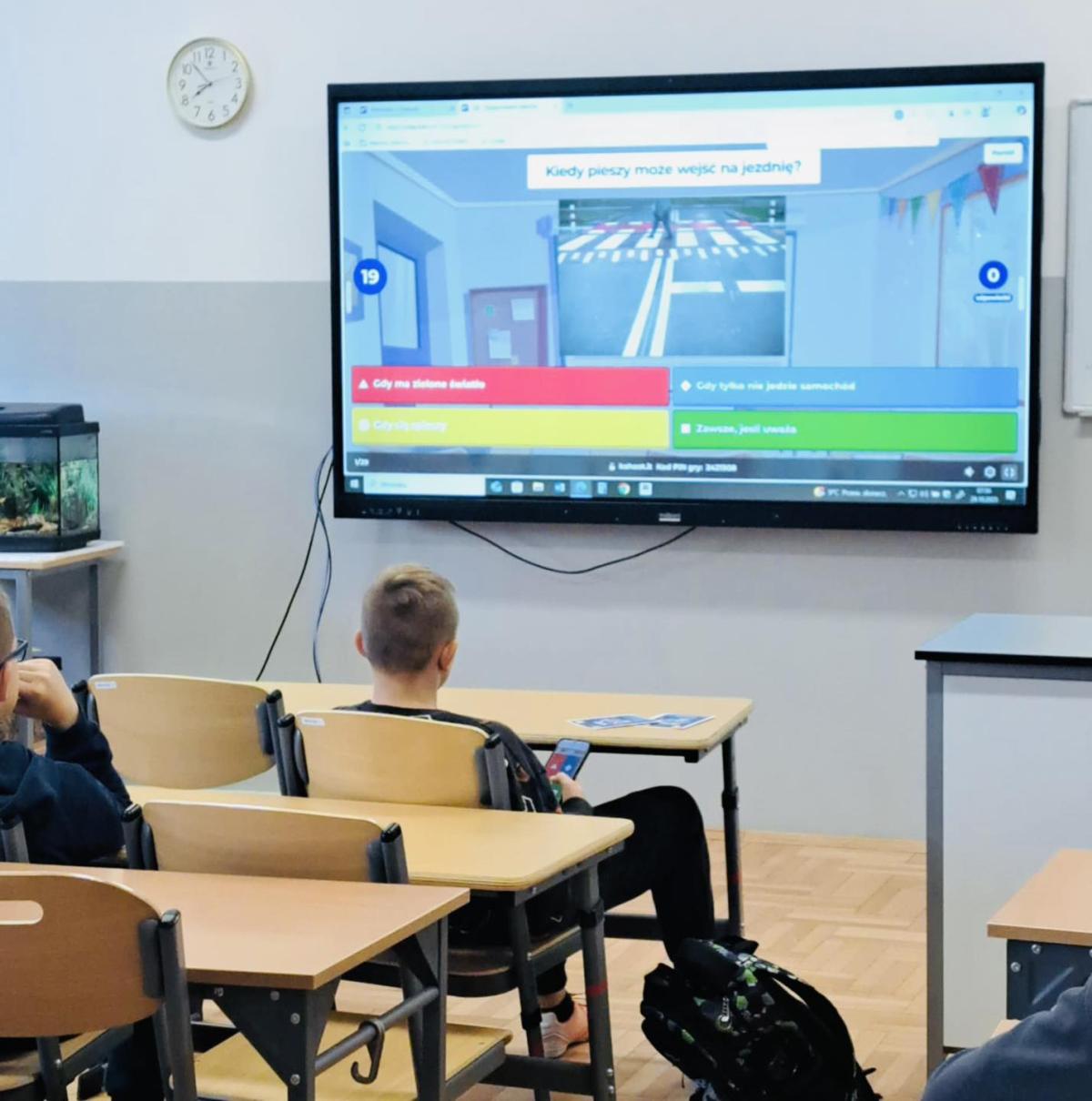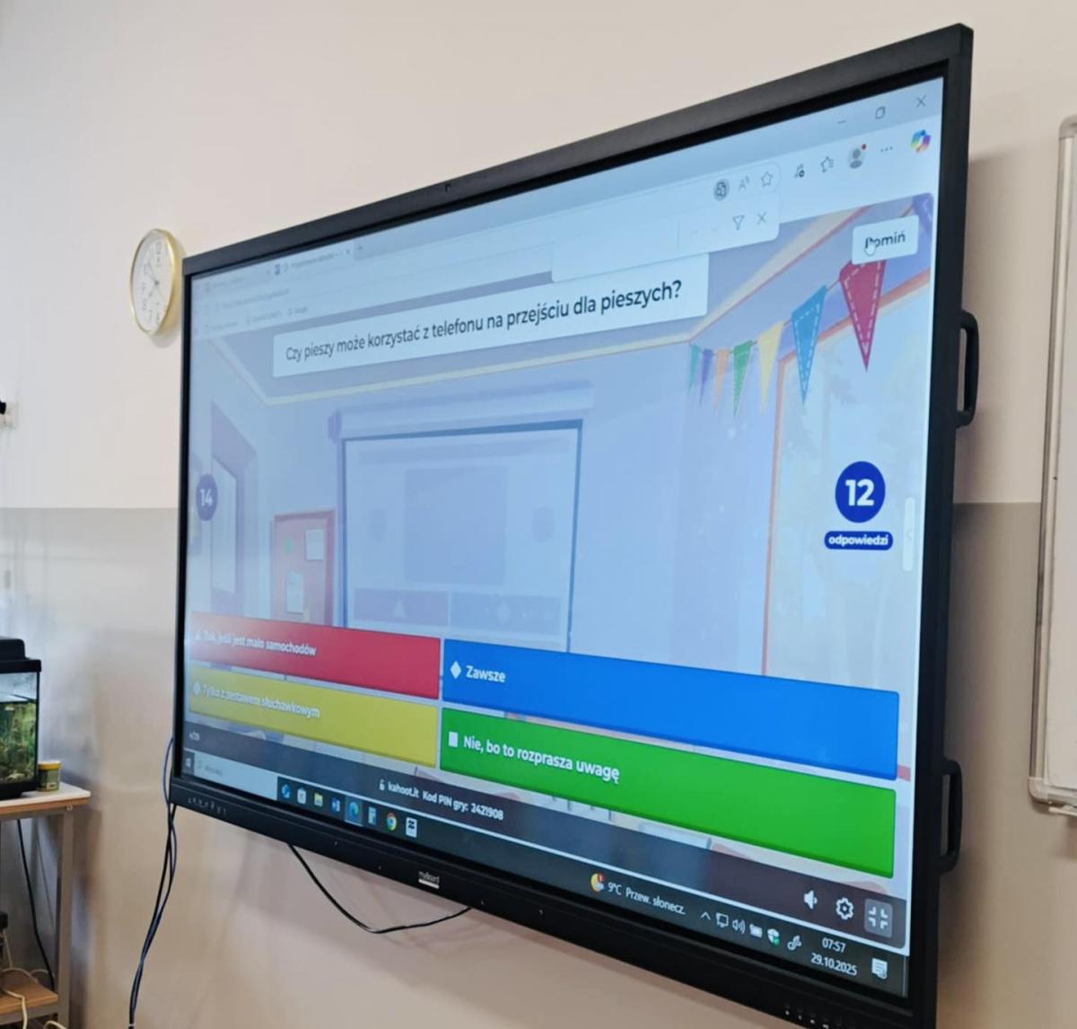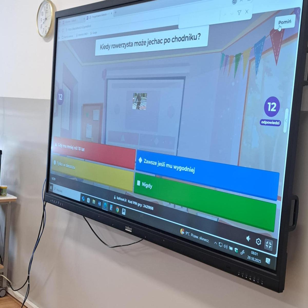 Dnia 29 października 2025 r., trzynastu uczniów naszej szkoły wzięło udział w interaktywnym quizie na temat bezpieczeństwa w ruchu drogowym. Do zabawy wykorzystano popularną aplikację Kahoot, dzięki której uczestnicy, korzystając ze swoich telefonów komórkowych, odpowiadali na pytania testowe wyświetlane na tablicy interaktywnej.