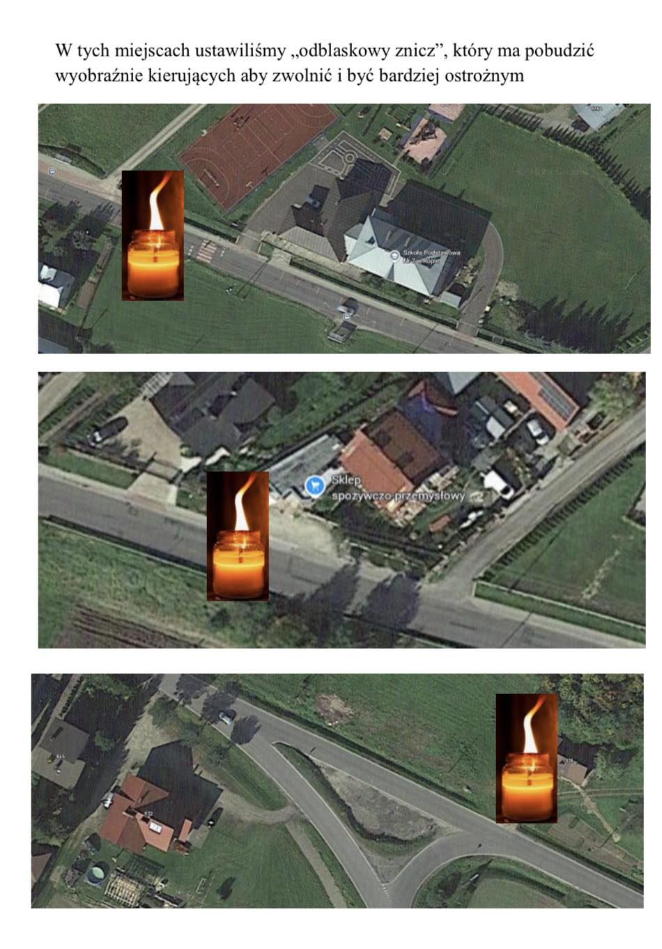 Akcja została przeprowadzona w ramach udziału w „Odblaskowej Szkole” , a miała ona na celu poprawę bezpieczeństwa w ruchu drogowym. Na mapie zaznaczyliśmy pięć niebezpiecznych miejsc w okolicy, które mogą stanowić zagrożenie dla pieszych. W tych lokalizacjach ustawiliśmy znicze z elementami odblaskowymi oraz kartkami z hasłami, np. „Jedź wolniej – życie nie ma restartu”.