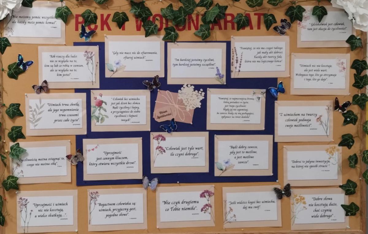 W szkolnym holu pojawiła się piękna gazetka o życzliwości. „Promienie dobroci”, która stała się symbolem wspólnego świętowania i zachętą do dzielenia się uśmiechem.