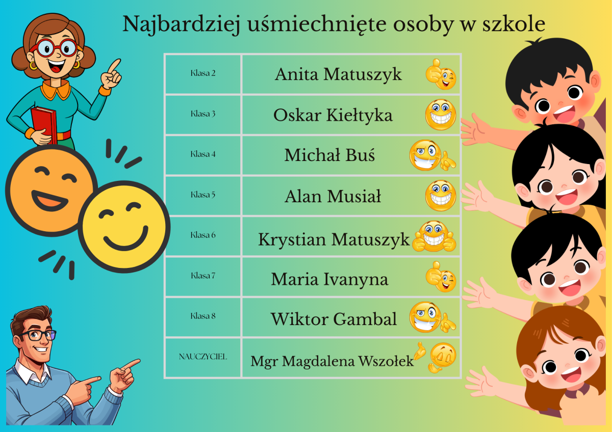 Ponadto w klasach II–VIII oraz w gronie nauczycielskim odbyły się wybory na najbardziej uśmiechniętą osobę. To radosne wydarzenie pokazało, że uśmiech jest najprostszym i najpiękniejszym gestem dobroci. Gratulujemy zwycięzcom! Choć rywalizacja była wyrównana, tak naprawdę w naszej szkole każdy jest zwycięzcą, bo uśmiech towarzyszy nam wszystkim i rozświetla każdy dzień.
