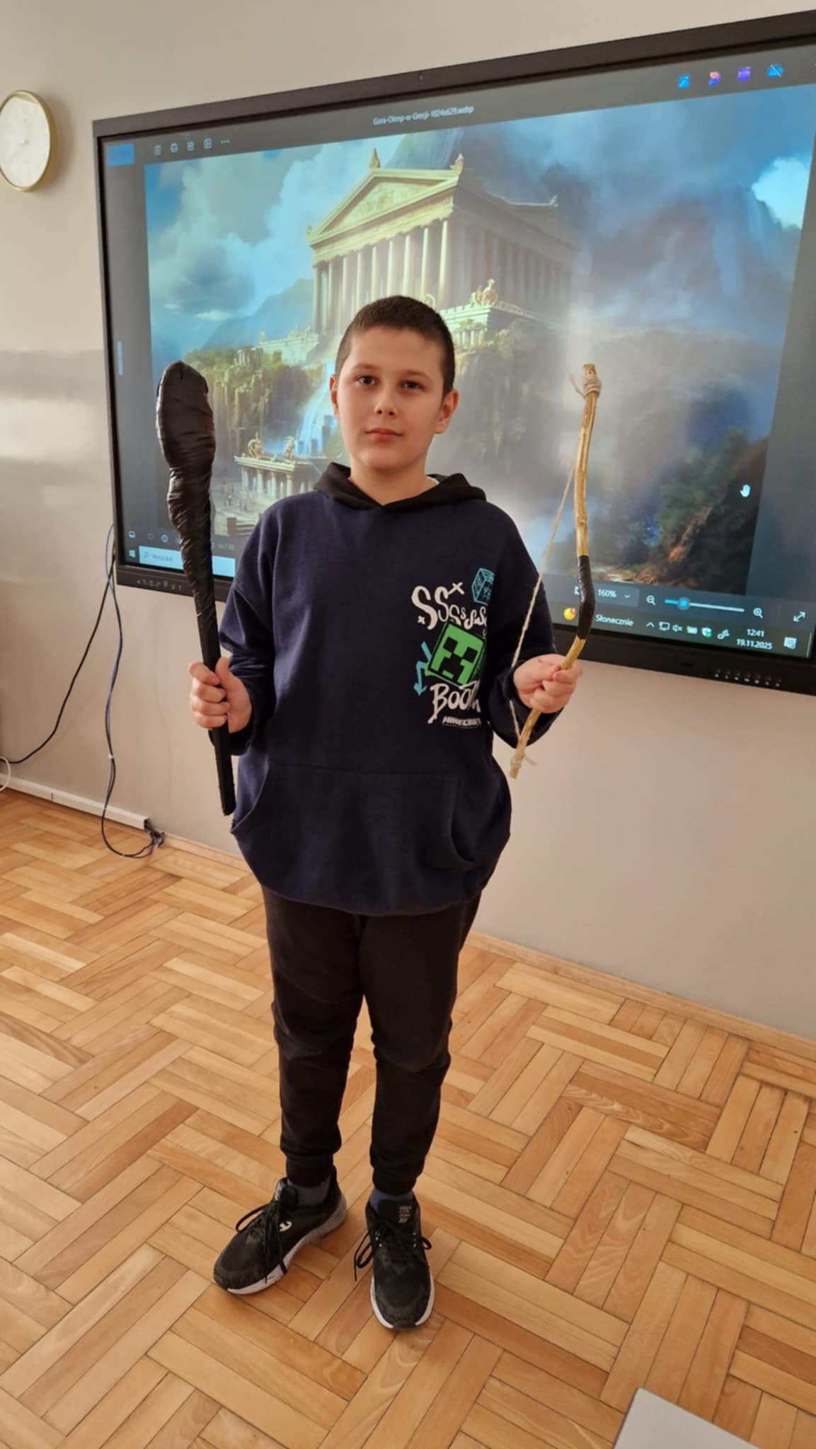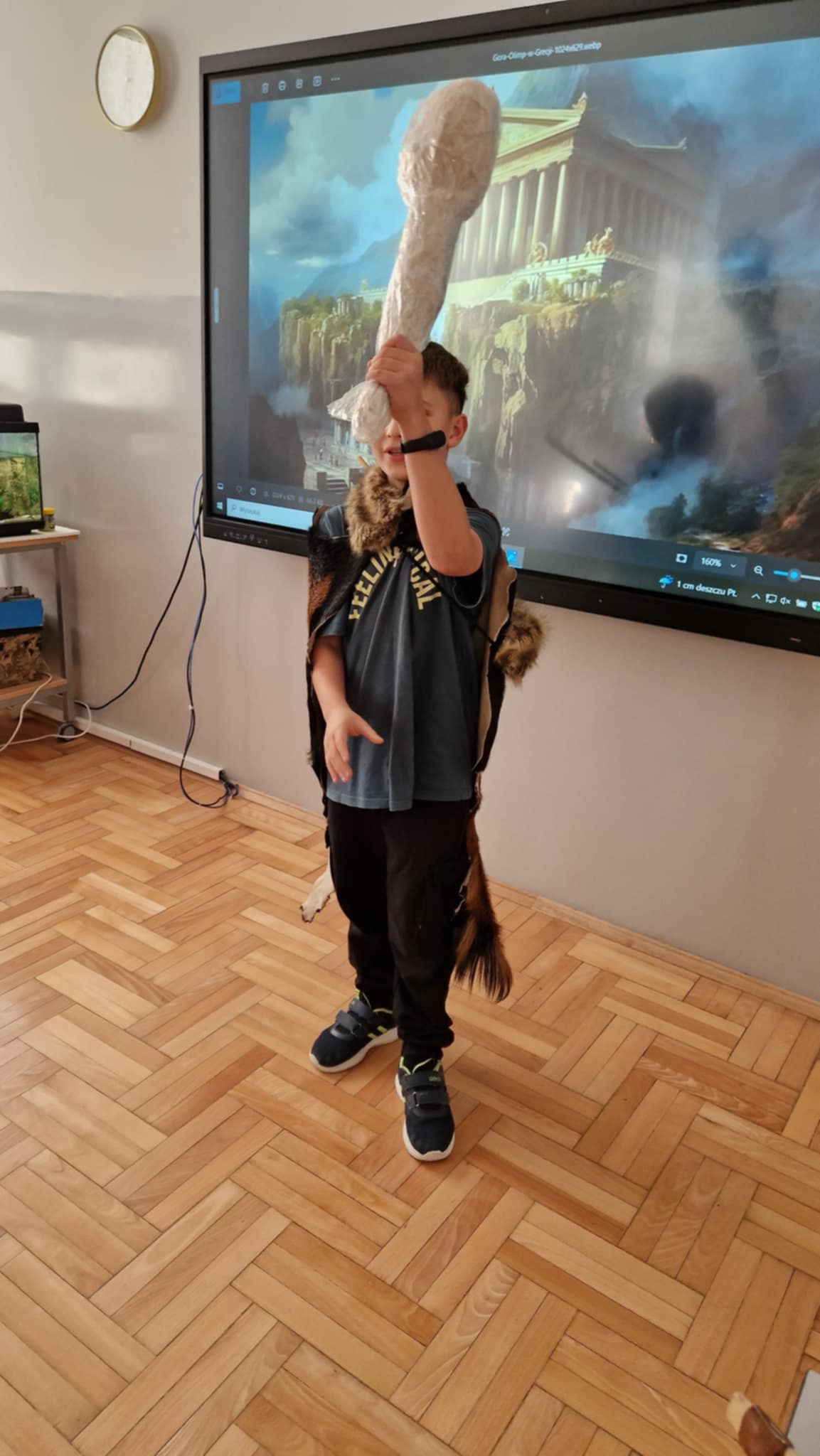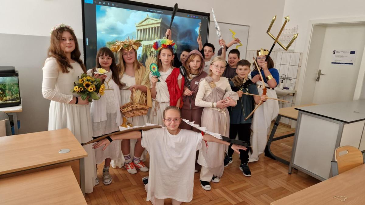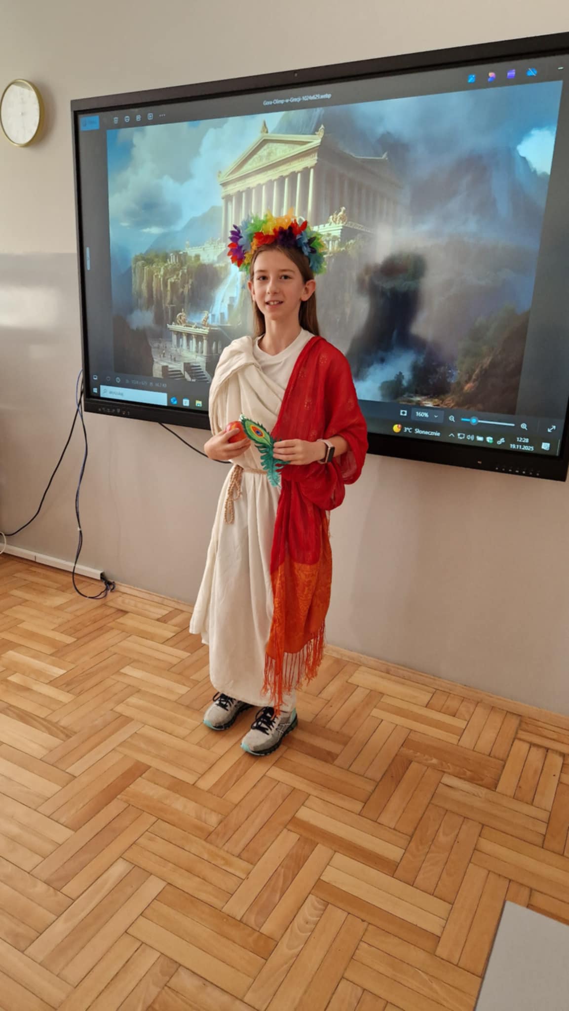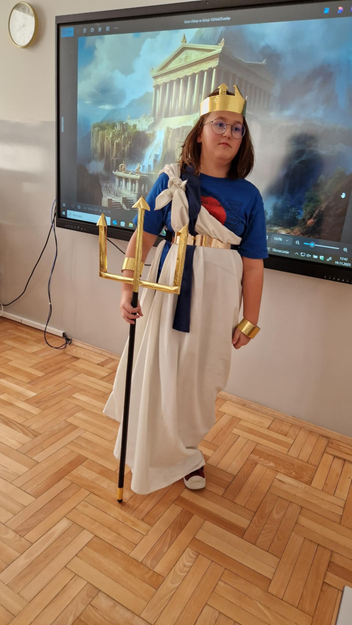 W minioną środę klasa V przeniosła się do starożytnej Grecji. Podczas lekcji podsumowującej pracę z mitologią uczniowie wcielili się w role greckich bogów i herosów. Nie zabrakło zarówno imponujących kostiumów i rekwizytów, jak i ciekawych interpretacji mitologicznych bohaterów. Uczniowie zaskoczyli nie tylko pomysłowością strojów, lecz także znajomością mitów — potrafili ciekawie opowiadać o swoich bogach, ich symbolach i cechach oraz roli, jaką odgrywali w antycznym świecie. Atmosfera łączyła w sobie zabawę z zaangażowaniem, a radość i entuzjazm udzielały się wszystkim. Dzięki temu lekcja ta pozwoliła nie tylko utrwalić zdobytą wiedzę, ale też spojrzeć na nią w nieszablonowy sposób.