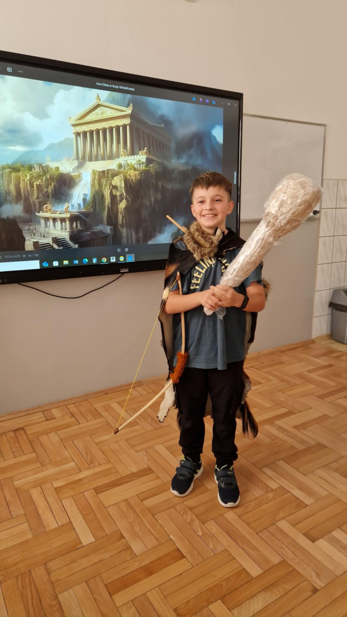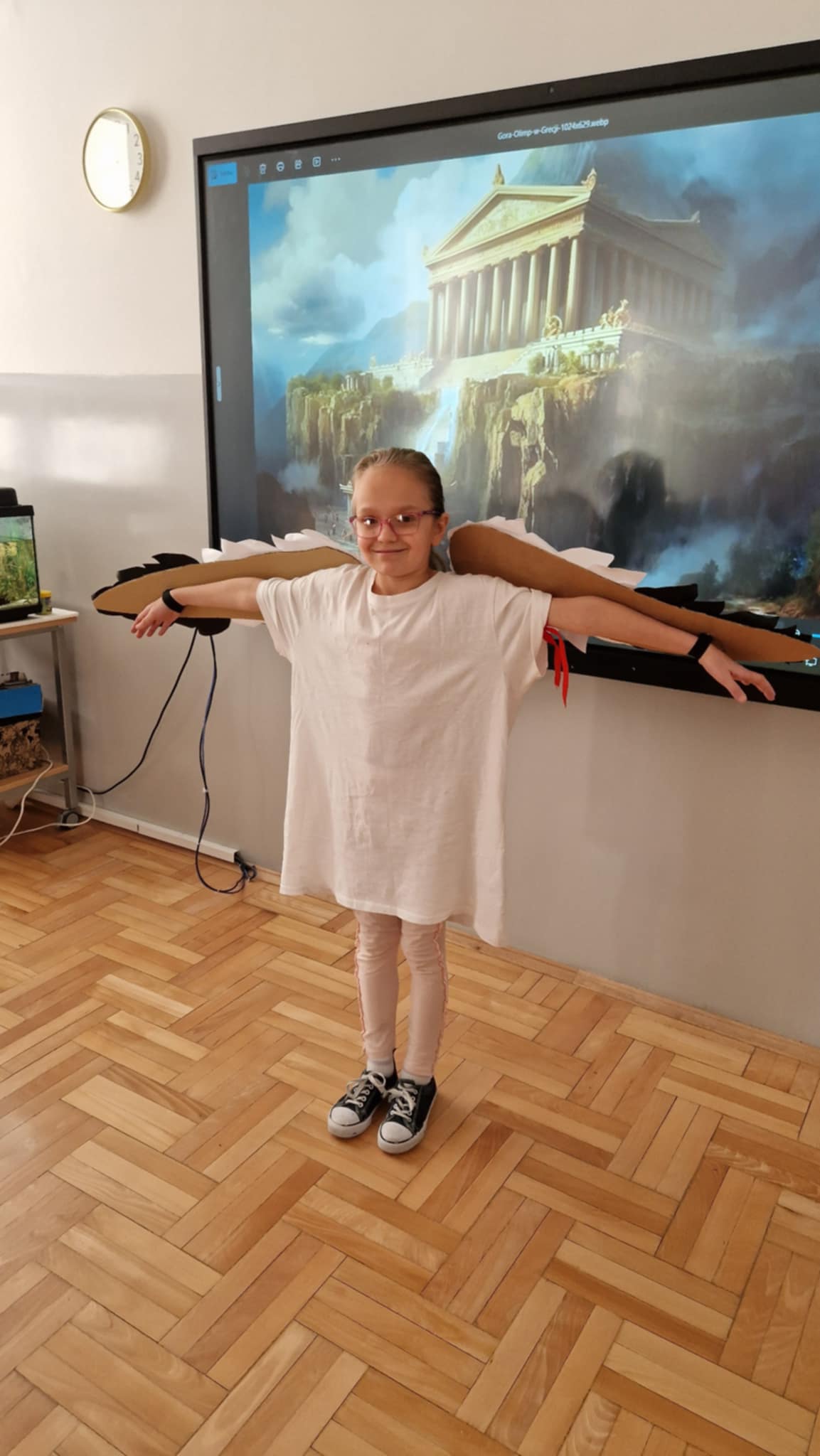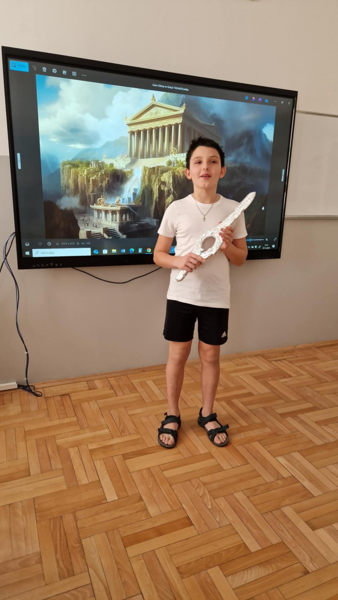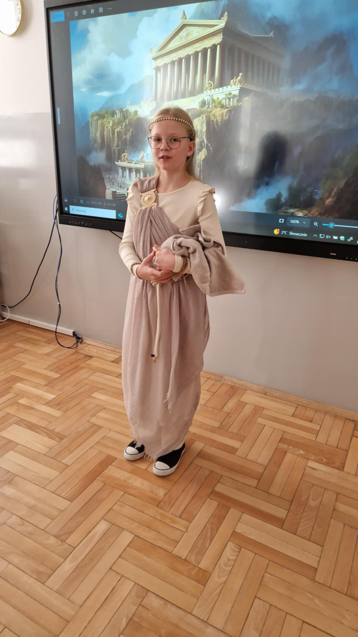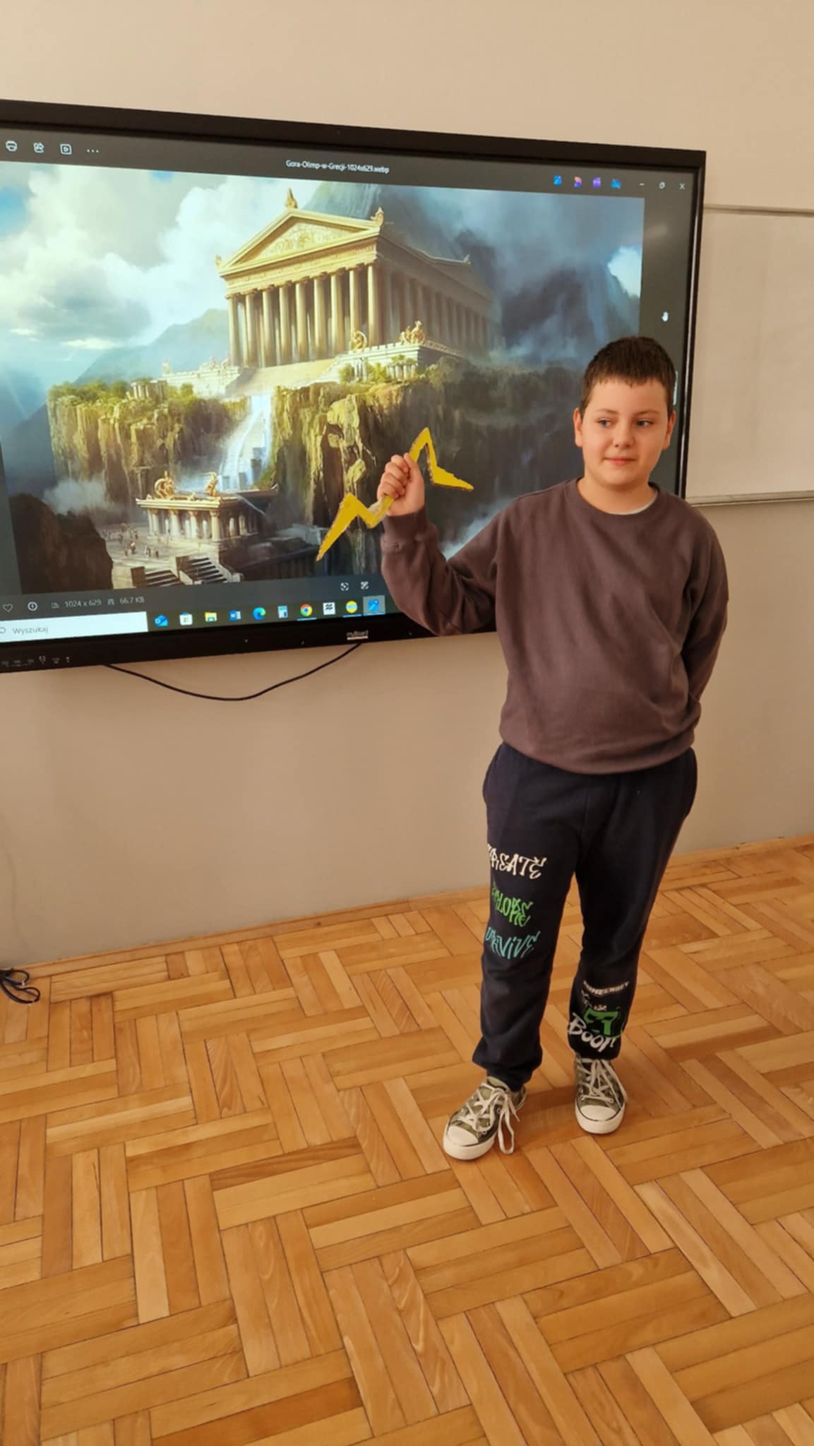 W minioną środę klasa V przeniosła się do starożytnej Grecji. Podczas lekcji podsumowującej pracę z mitologią uczniowie wcielili się w role greckich bogów i herosów. Nie zabrakło zarówno imponujących kostiumów i rekwizytów, jak i ciekawych interpretacji mitologicznych bohaterów. Uczniowie zaskoczyli nie tylko pomysłowością strojów, lecz także znajomością mitów — potrafili ciekawie opowiadać o swoich bogach, ich symbolach i cechach oraz roli, jaką odgrywali w antycznym świecie. Atmosfera łączyła w sobie zabawę z zaangażowaniem, a radość i entuzjazm udzielały się wszystkim. Dzięki temu lekcja ta pozwoliła nie tylko utrwalić zdobytą wiedzę, ale też spojrzeć na nią w nieszablonowy sposób.