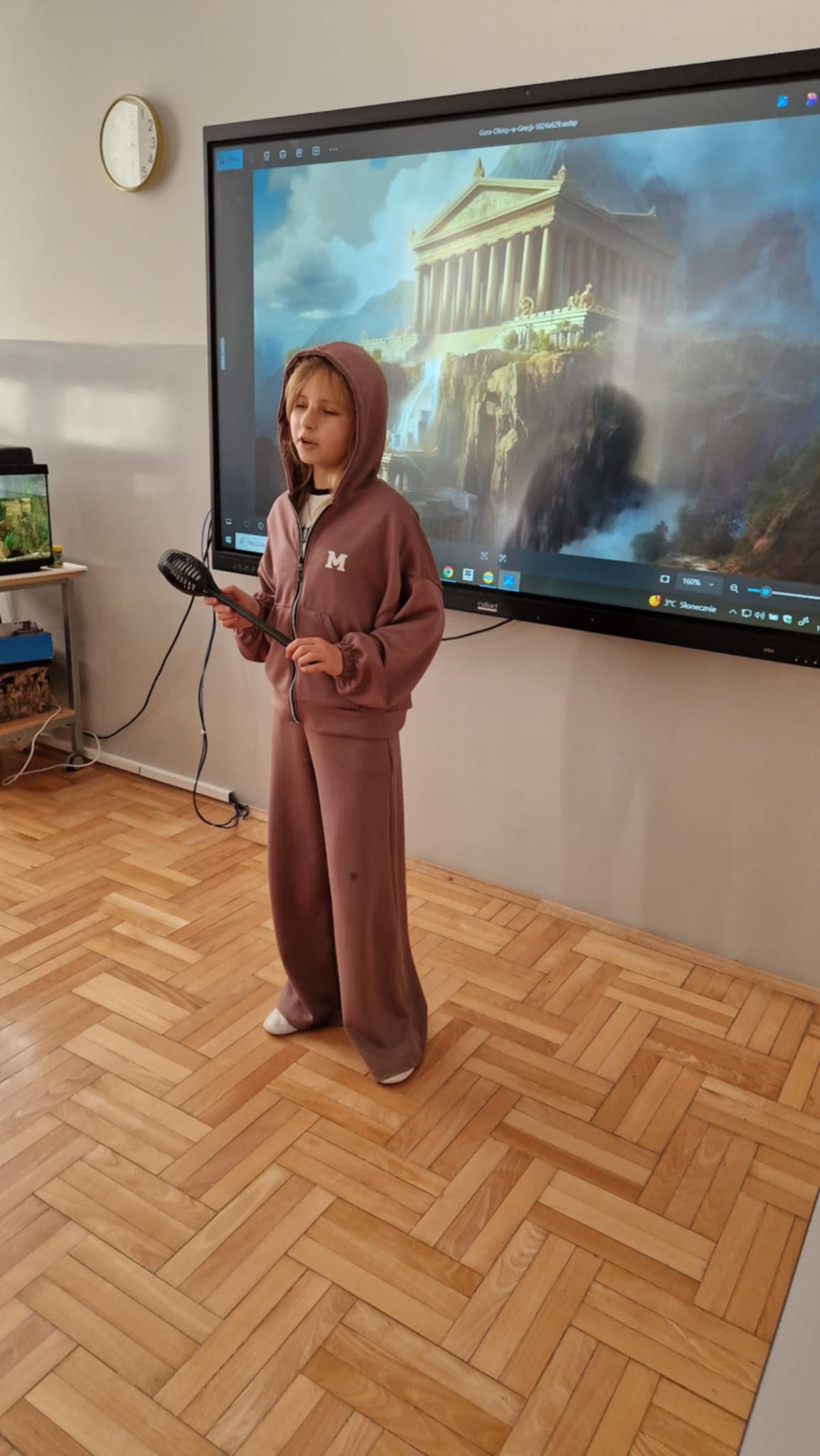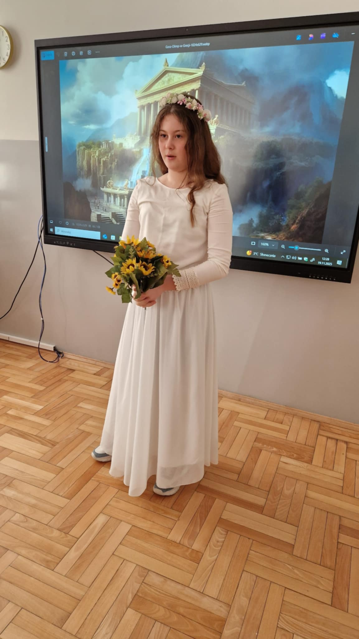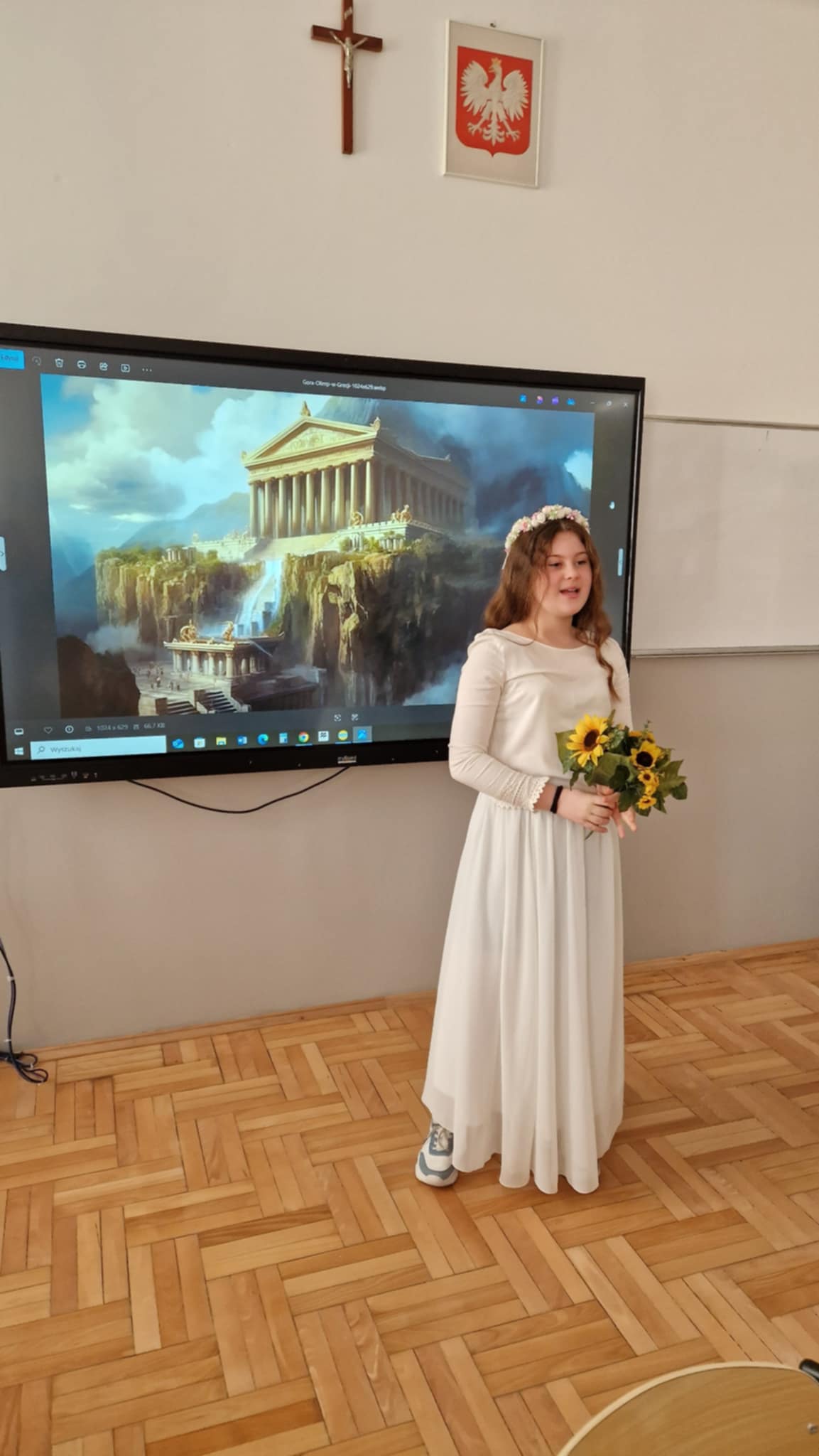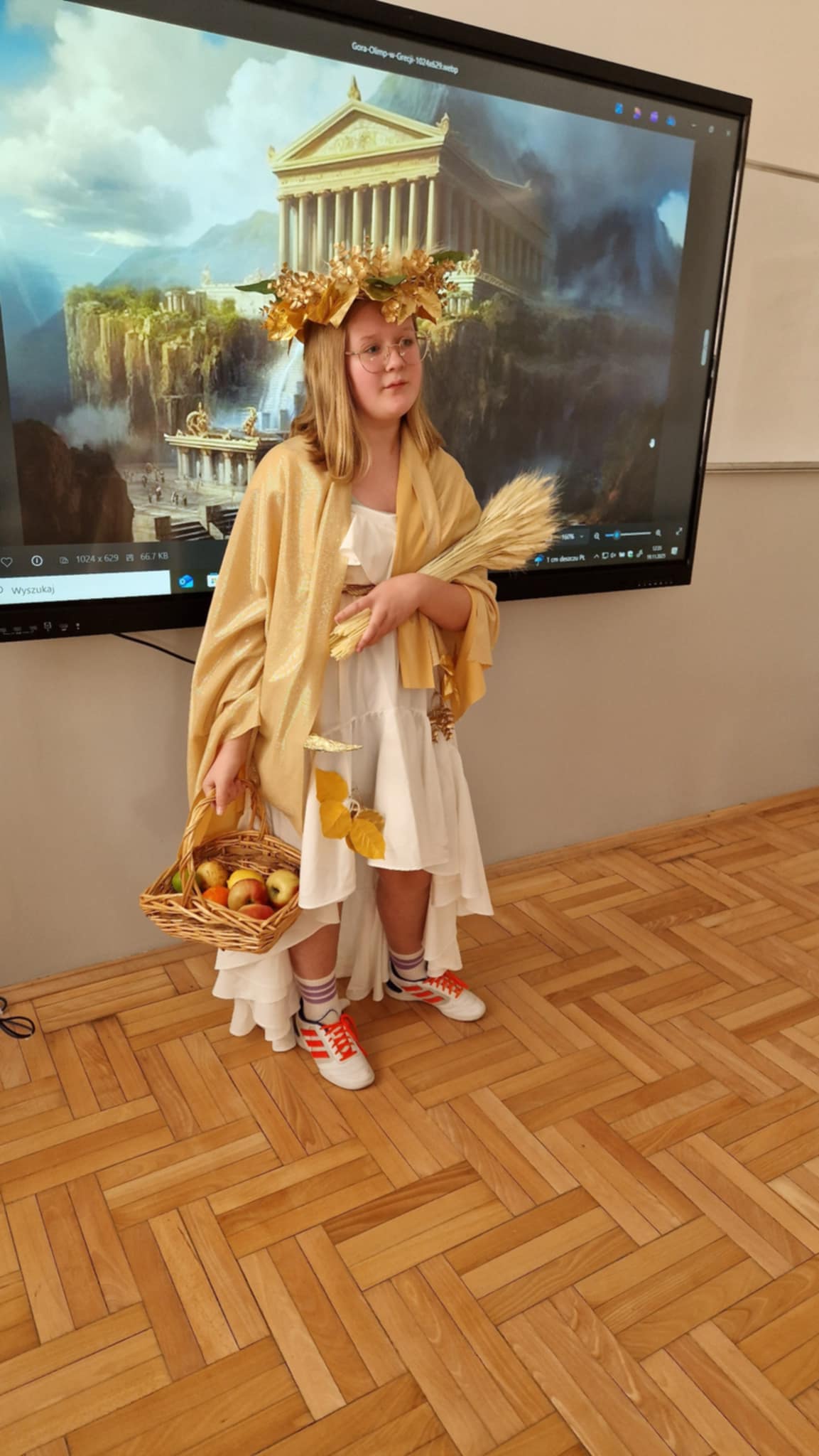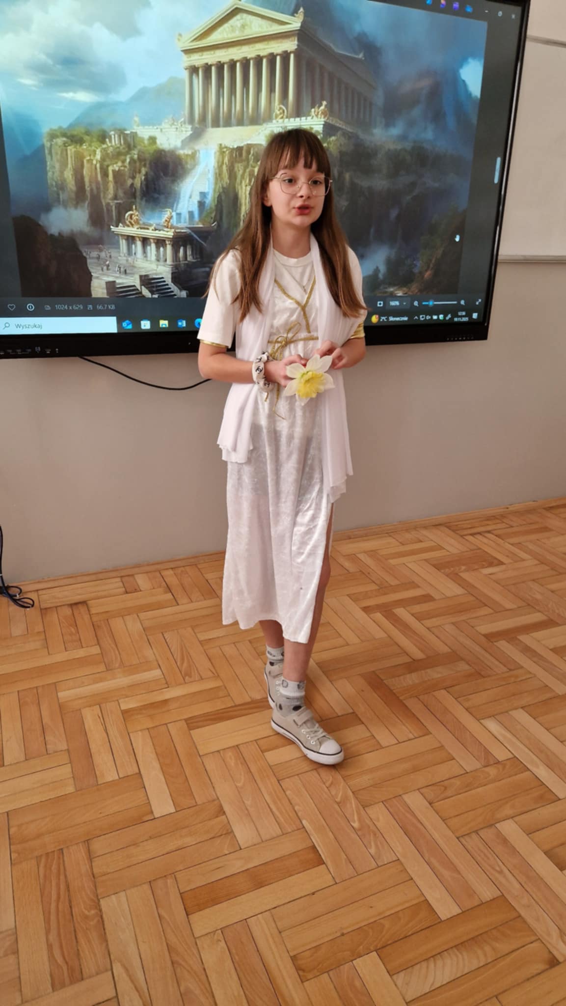W minioną środę klasa V przeniosła się do starożytnej Grecji. Podczas lekcji podsumowującej pracę z mitologią uczniowie wcielili się w role greckich bogów i herosów. Nie zabrakło zarówno imponujących kostiumów i rekwizytów, jak i ciekawych interpretacji mitologicznych bohaterów. Uczniowie zaskoczyli nie tylko pomysłowością strojów, lecz także znajomością mitów — potrafili ciekawie opowiadać o swoich bogach, ich symbolach i cechach oraz roli, jaką odgrywali w antycznym świecie. Atmosfera łączyła w sobie zabawę z zaangażowaniem, a radość i entuzjazm udzielały się wszystkim. Dzięki temu lekcja ta pozwoliła nie tylko utrwalić zdobytą wiedzę, ale też spojrzeć na nią w nieszablonowy sposób.