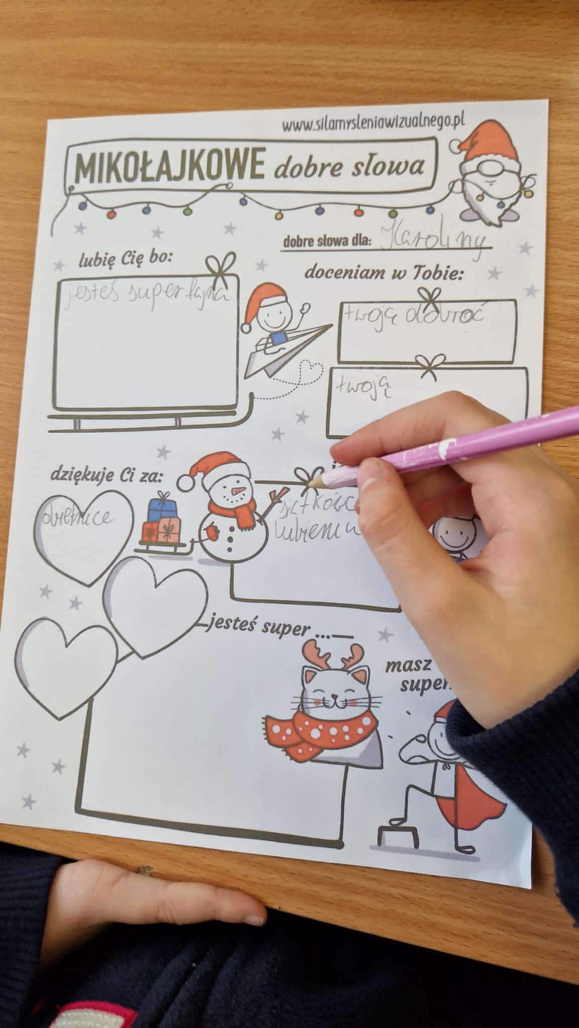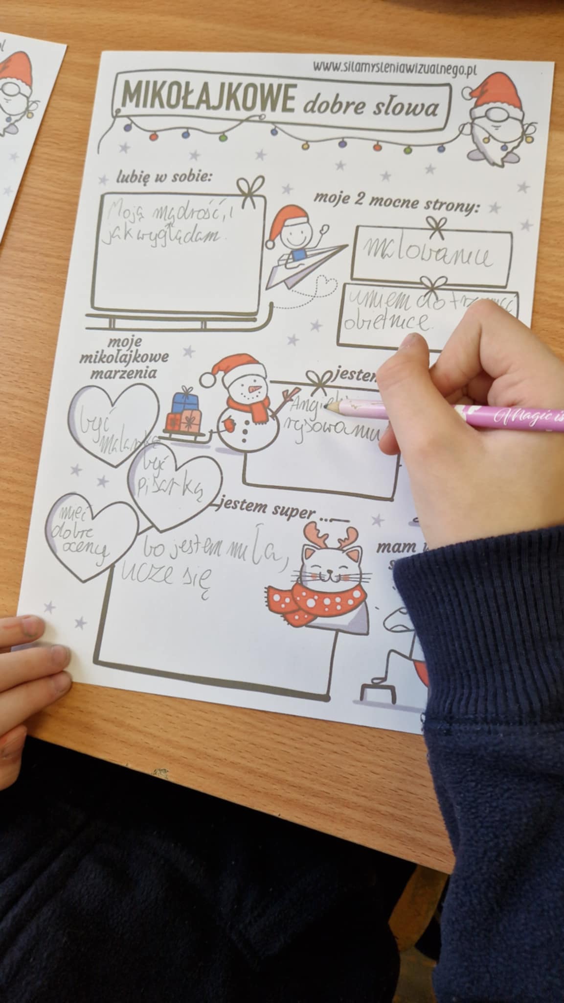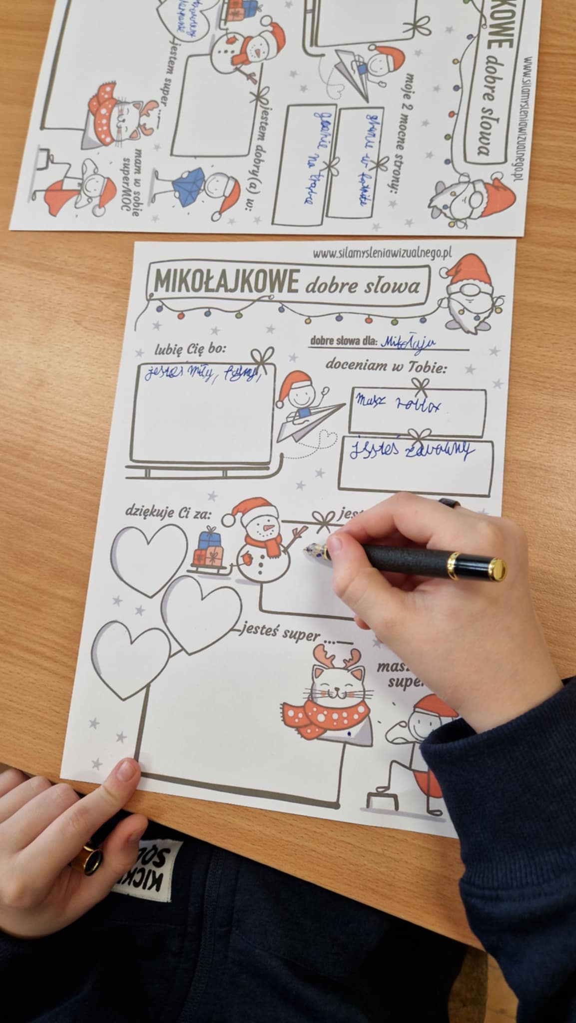 Podczas swoich zajęć uczniowie klasy 4 przygotowali „mikołajkowe dobre słowa” – każdy napisał coś miłego dla wybranej koleżanki i kolegi. Dzięki temu w klasie pojawiła się prawdziwa chmura życzliwości, a dzieci mogły poczuć, jak ważne jest dostrzeganie dobrych cech u innych i dzielenie się nimi.