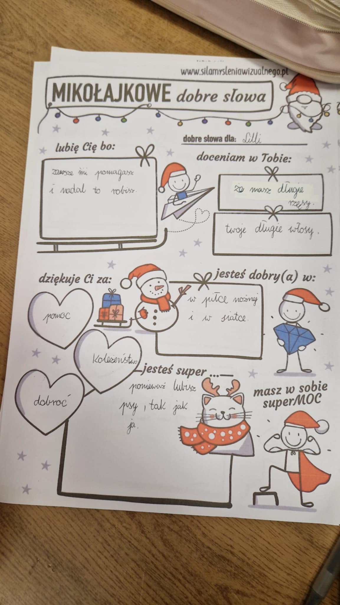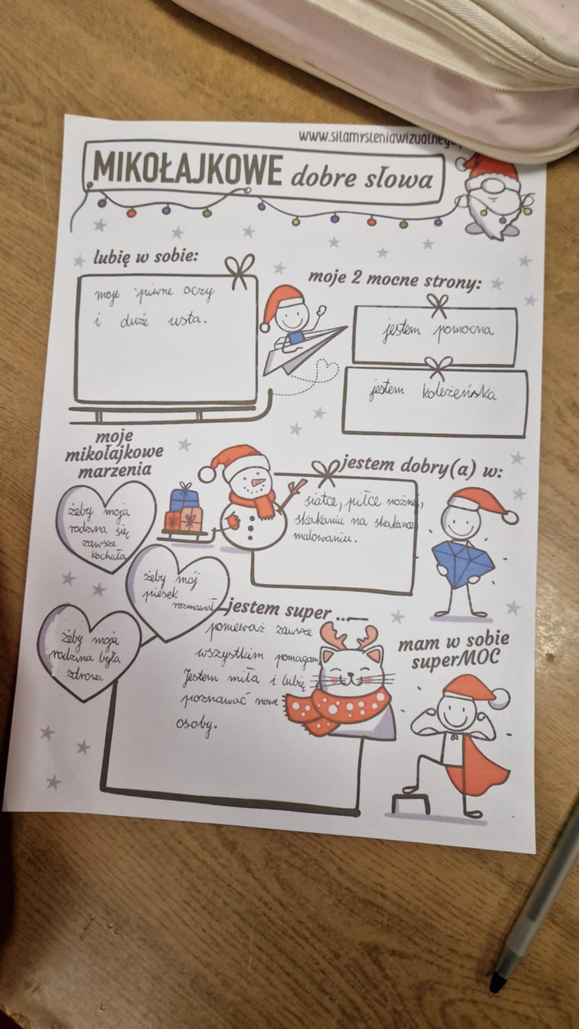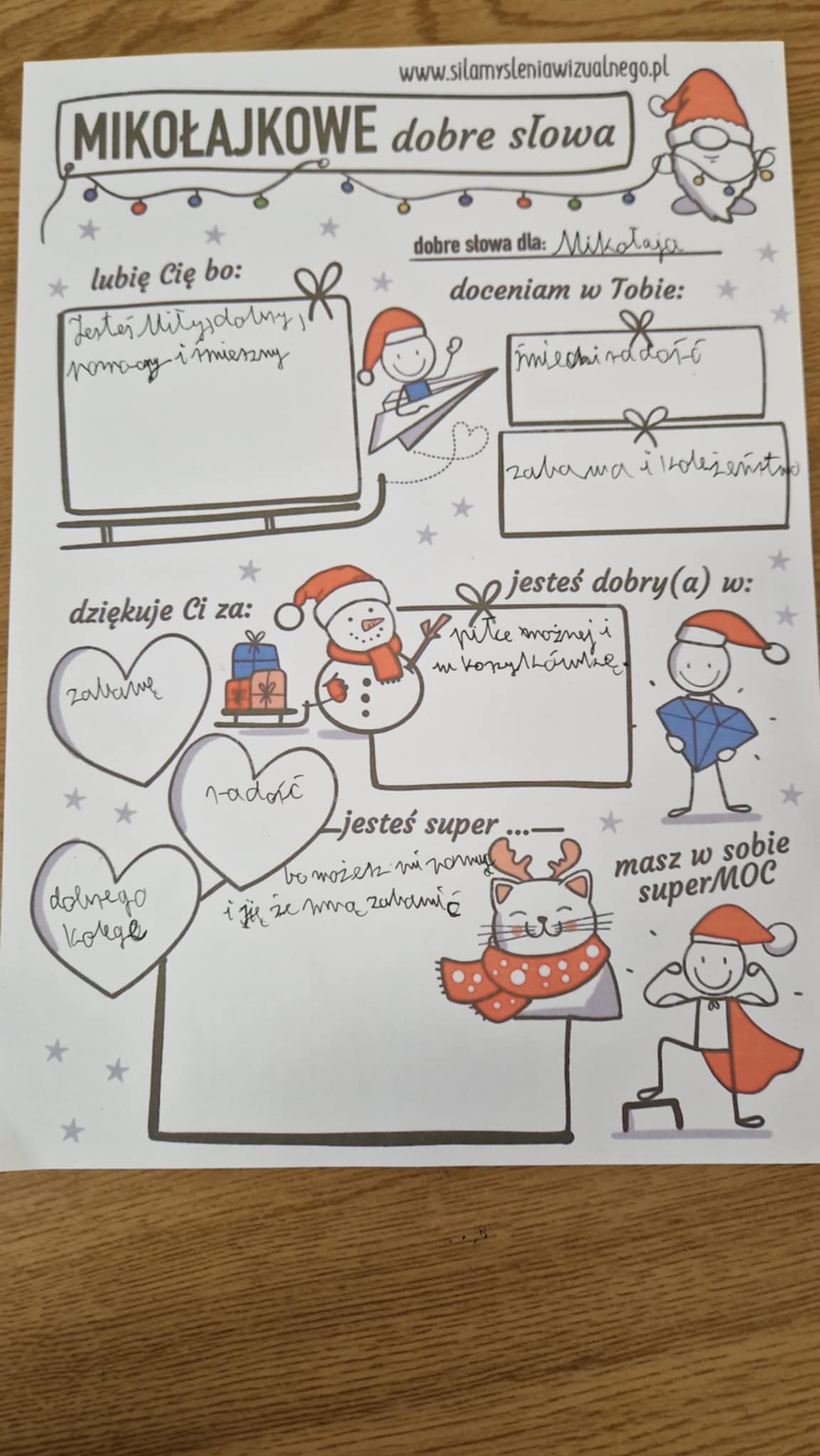 Podczas swoich zajęć uczniowie klasy 4 przygotowali „mikołajkowe dobre słowa” – każdy napisał coś miłego dla wybranej koleżanki i kolegi. Dzięki temu w klasie pojawiła się prawdziwa chmura życzliwości, a dzieci mogły poczuć, jak ważne jest dostrzeganie dobrych cech u innych i dzielenie się nimi.