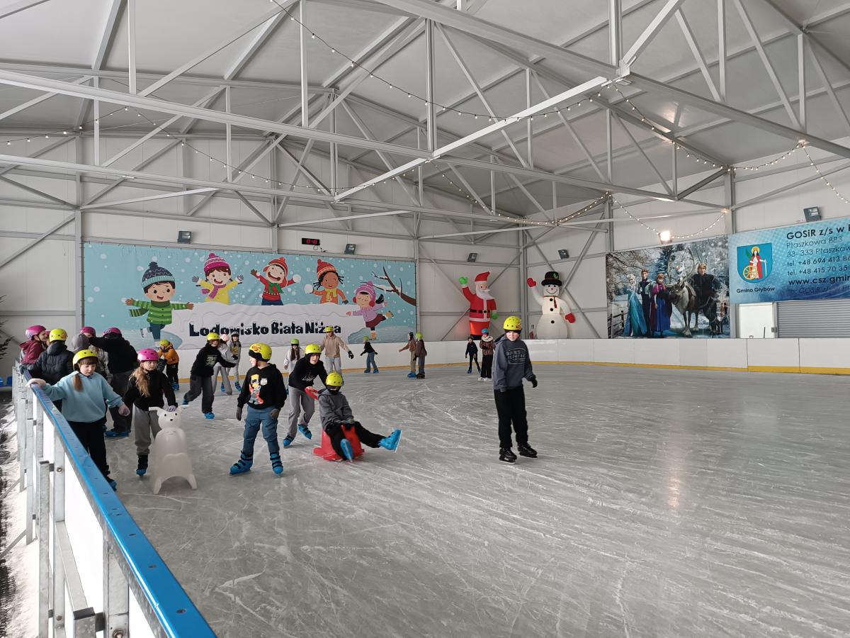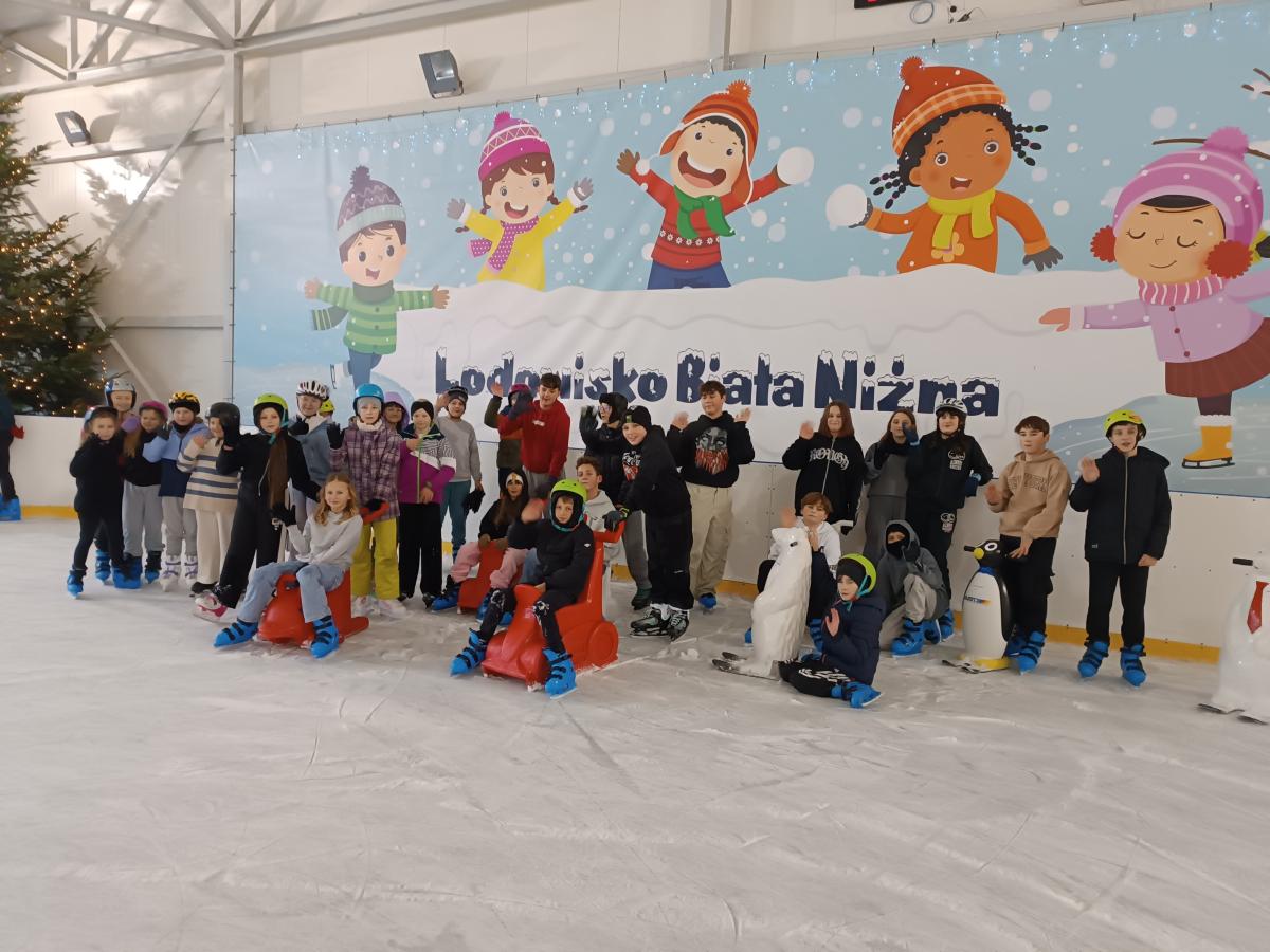 Dnia 15.01.2026 r. uczniowie naszej szkoły wraz z opiekunami udali się na lodowisko do Białej Niżnej. Grupa liczyła 38 uczniów z klas III-VIII. Wszyscy wyposażeni w łyżwy i kaski bezpiecznie uczestniczyli w zajęciach. Poprzedni wyjazd na lodowisko odbył się 11.12.2025 r., grupa liczyła wówczas 42 uczniów.