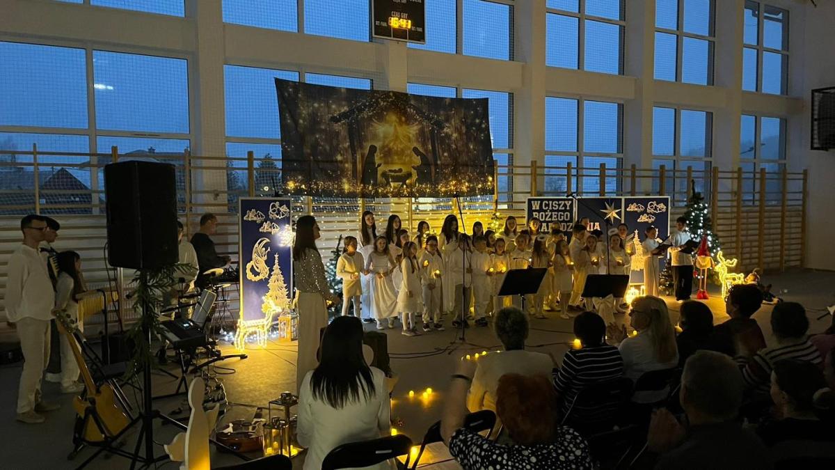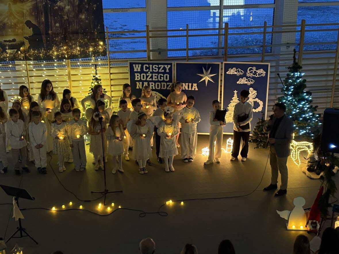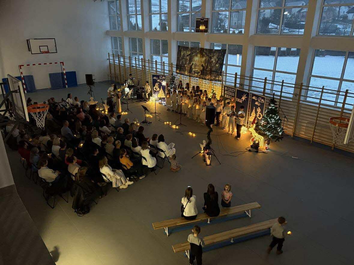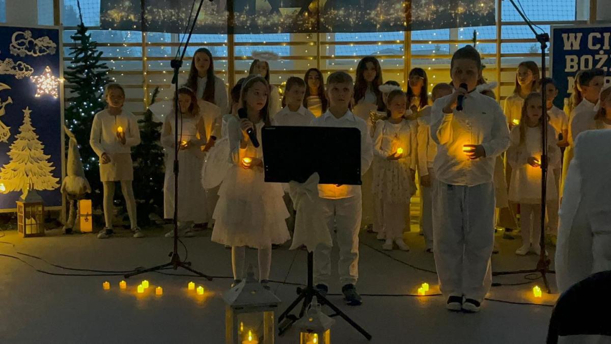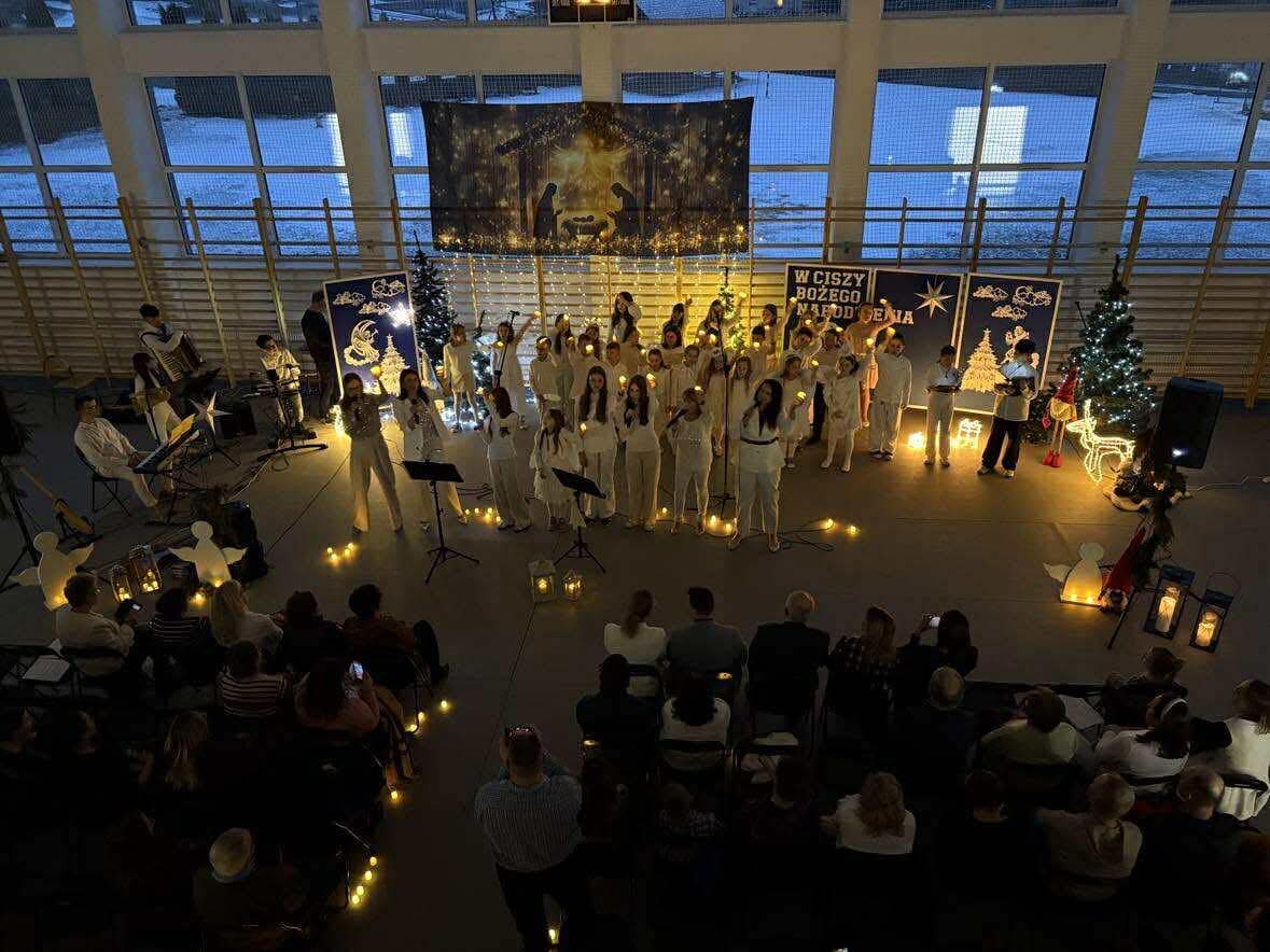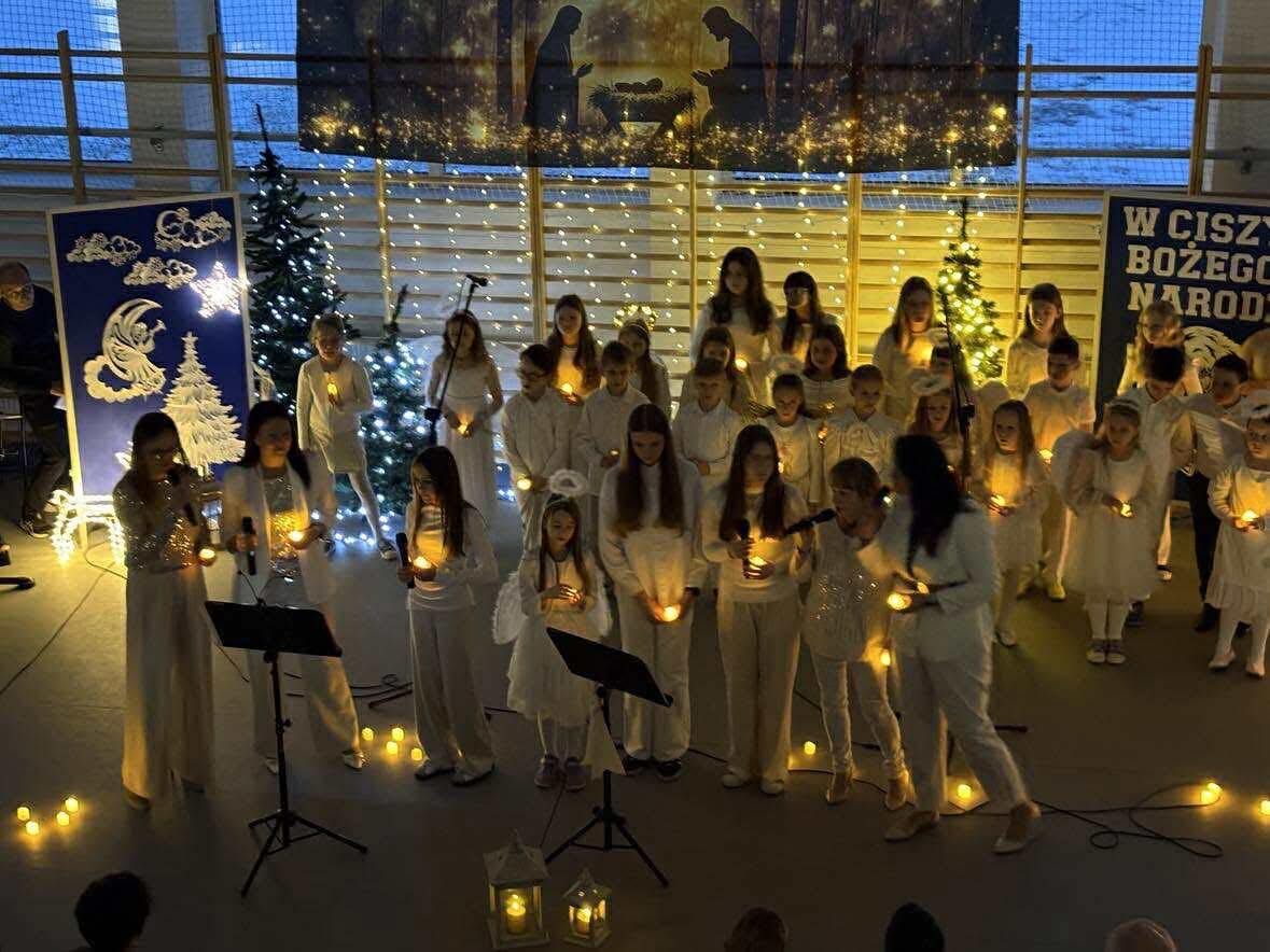 Gdy zapadł zmrok, a przestrzeń rozświetlił blask świec, rozpoczął się prawdziwie magiczny koncert. Na scenie wystąpił chór szkolny pod kierunkiem pani Beaty Rosiek, któremu towarzyszył szkolny zespół wokalno-instrumentalny „Cantus”. Wybrzmiały kolędy i pastorałki, a także piosenki świąteczne, które wprowadziły wszystkich w atmosferę zadumy, spokoju i radości.