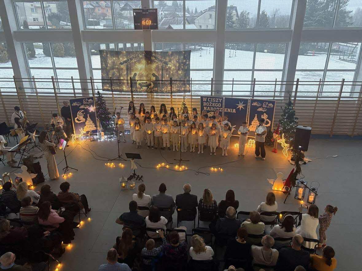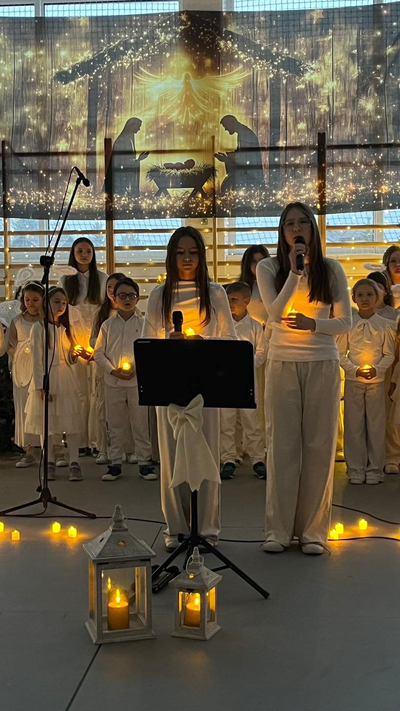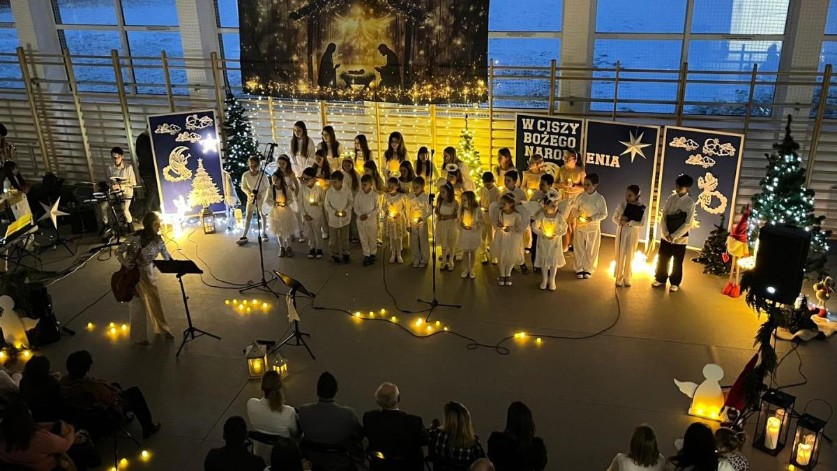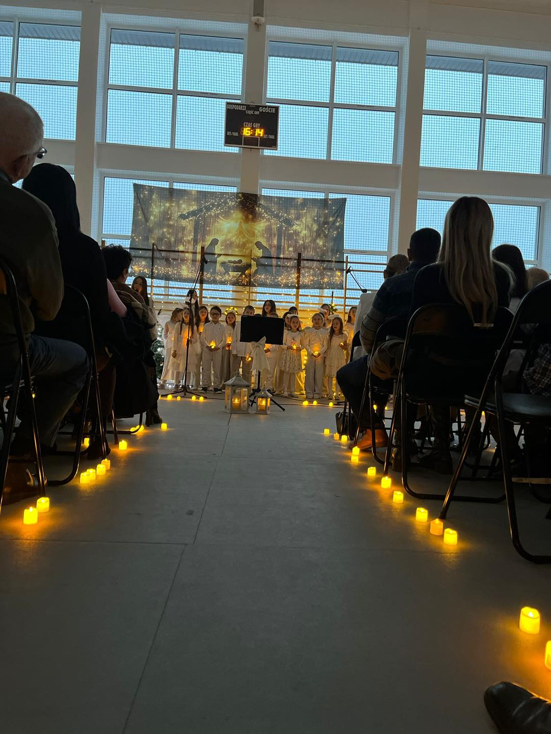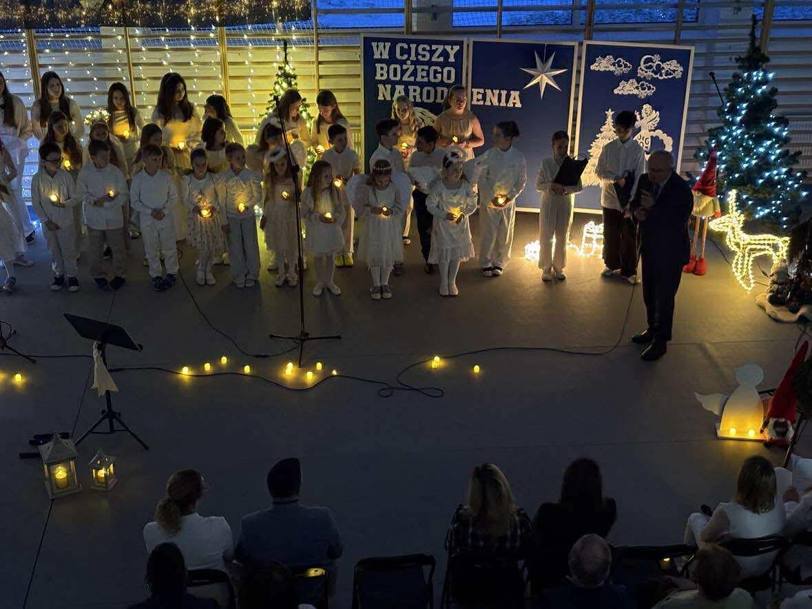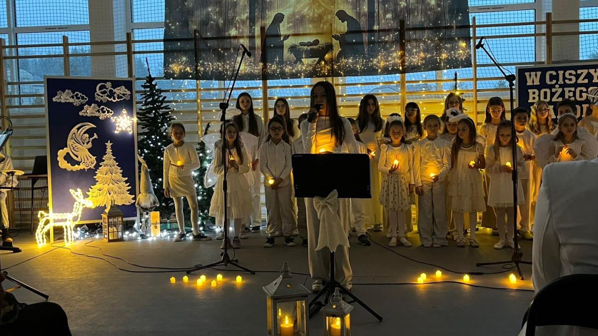 Gdy zapadł zmrok, a przestrzeń rozświetlił blask świec, rozpoczął się prawdziwie magiczny koncert. Na scenie wystąpił chór szkolny pod kierunkiem pani Beaty Rosiek, któremu towarzyszył szkolny zespół wokalno-instrumentalny „Cantus”. Wybrzmiały kolędy i pastorałki, a także piosenki świąteczne, które wprowadziły wszystkich w atmosferę zadumy, spokoju i radości.