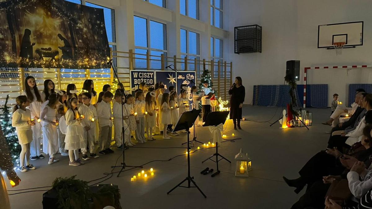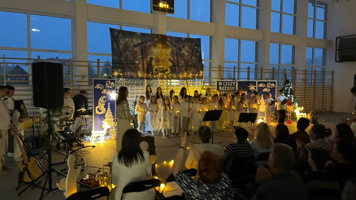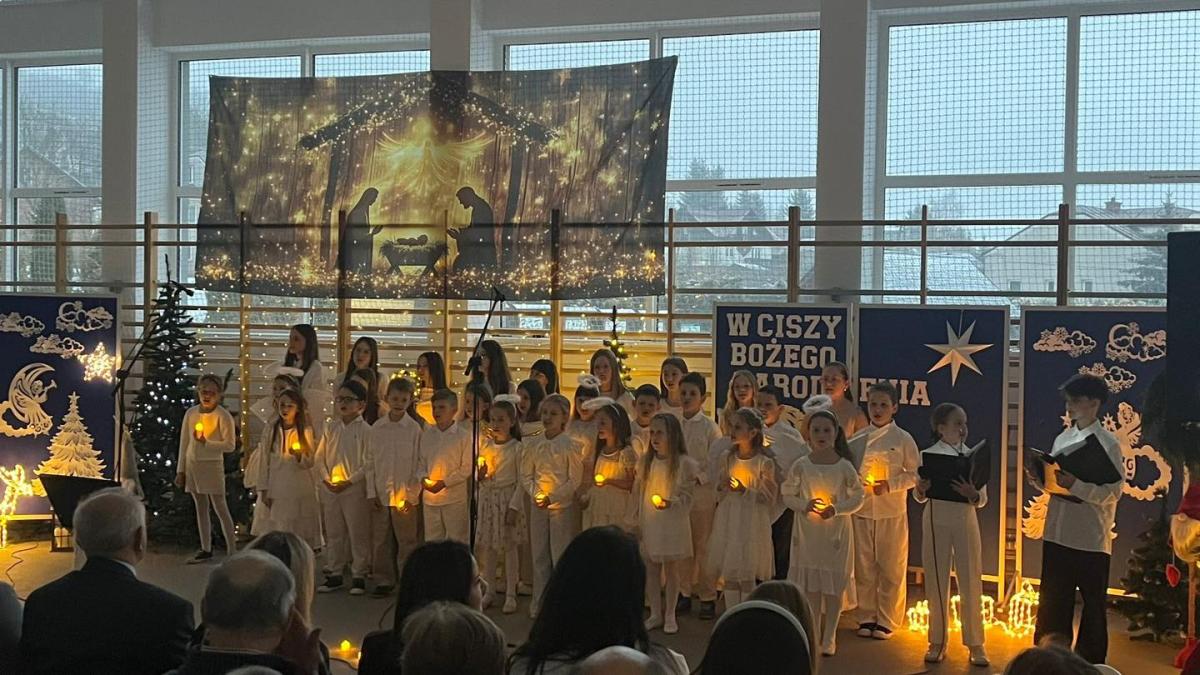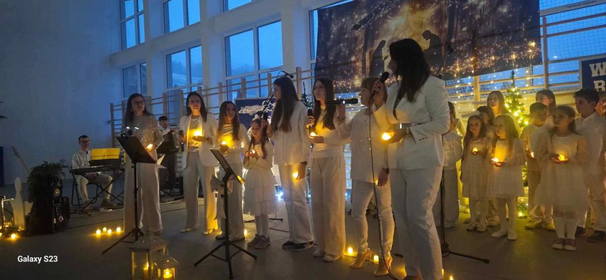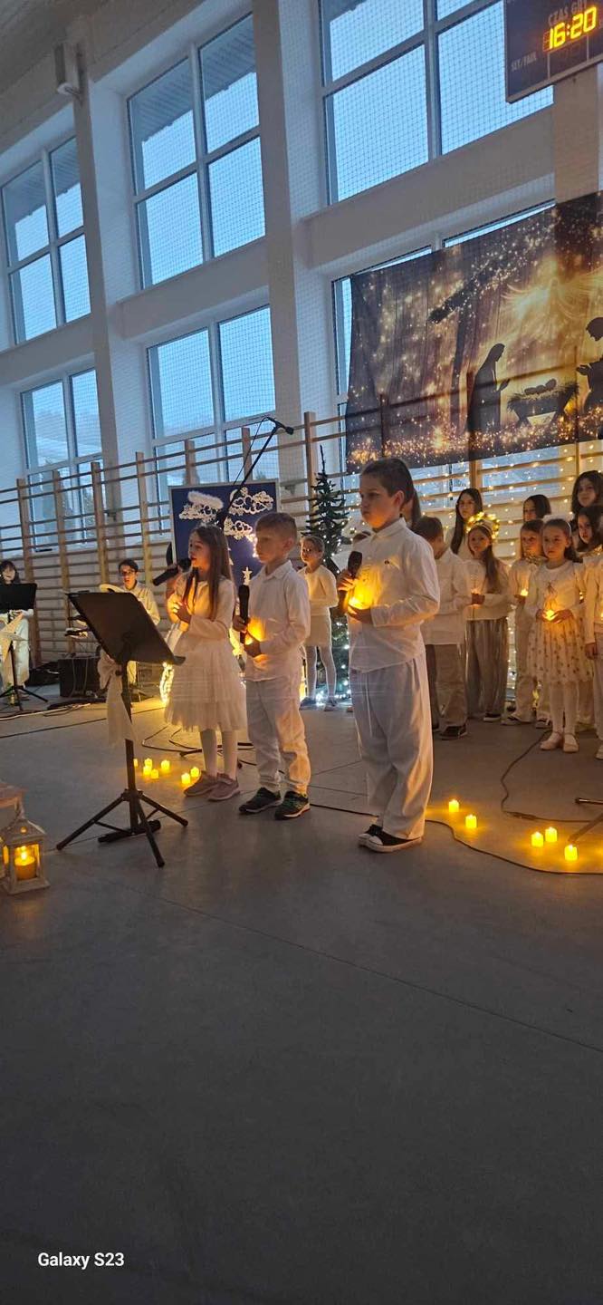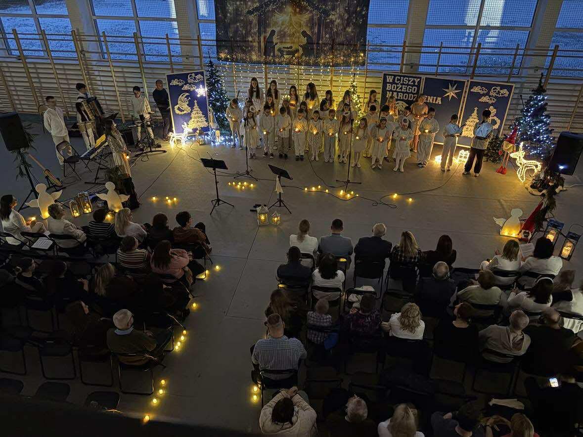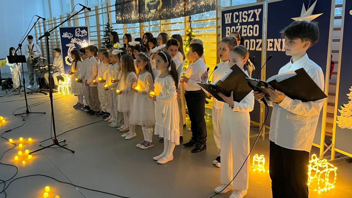 Gdy zapadł zmrok, a przestrzeń rozświetlił blask świec, rozpoczął się prawdziwie magiczny koncert. Na scenie wystąpił chór szkolny pod kierunkiem pani Beaty Rosiek, któremu towarzyszył szkolny zespół wokalno-instrumentalny „Cantus”. Wybrzmiały kolędy i pastorałki, a także piosenki świąteczne, które wprowadziły wszystkich w atmosferę zadumy, spokoju i radości.