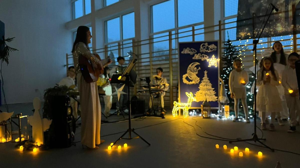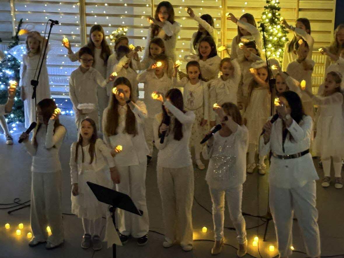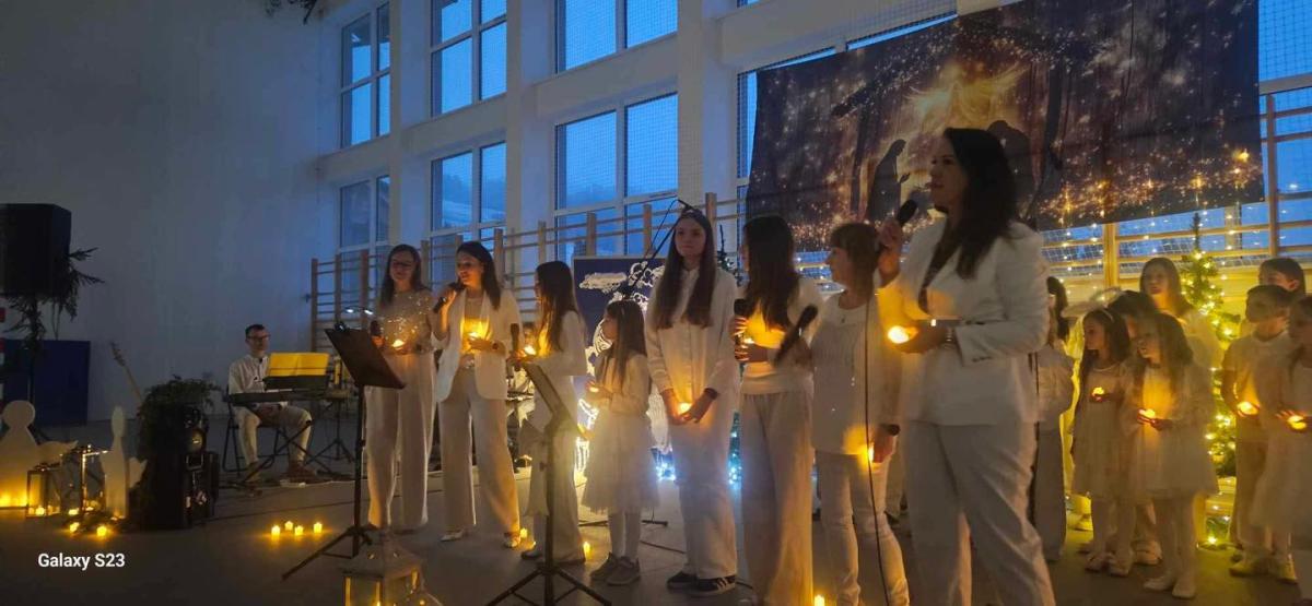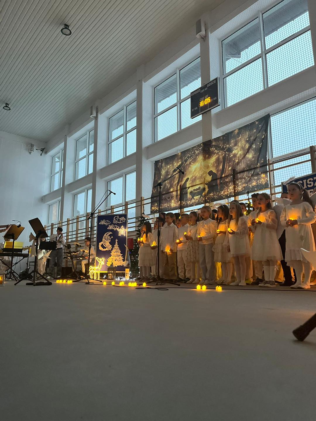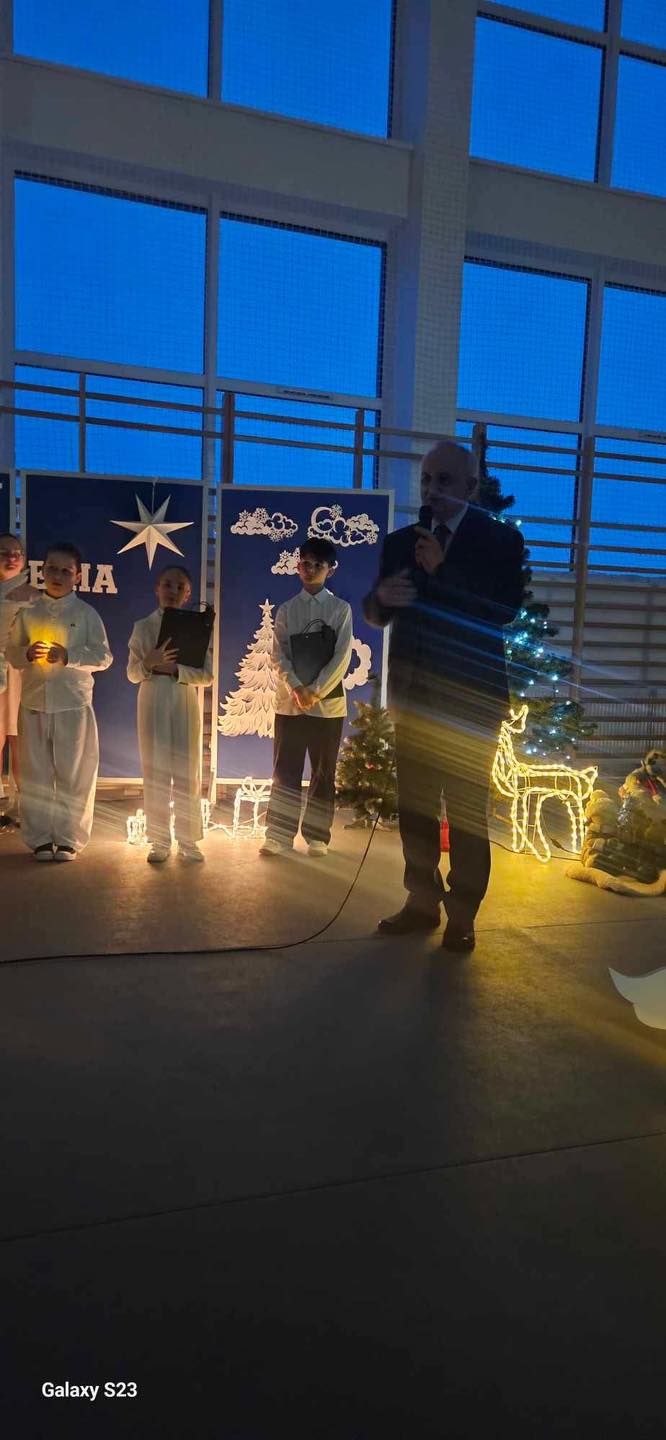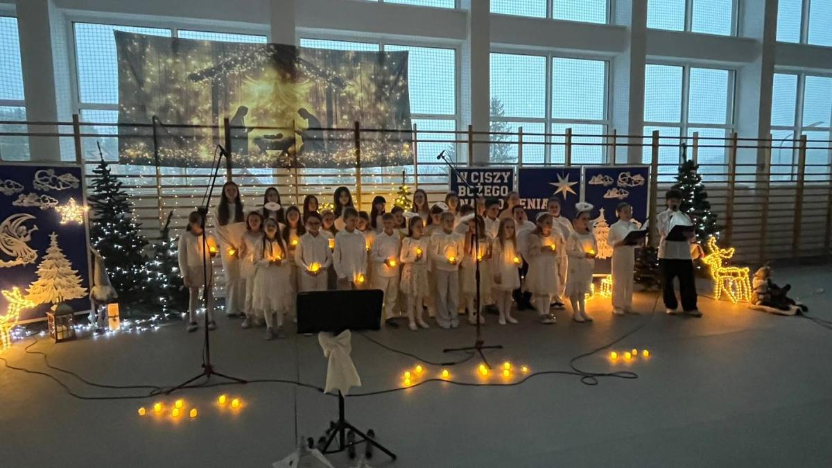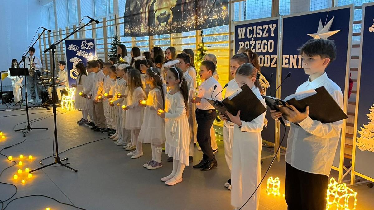 Gdy zapadł zmrok, a przestrzeń rozświetlił blask świec, rozpoczął się prawdziwie magiczny koncert. Na scenie wystąpił chór szkolny pod kierunkiem pani Beaty Rosiek, któremu towarzyszył szkolny zespół wokalno-instrumentalny „Cantus”. Wybrzmiały kolędy i pastorałki, a także piosenki świąteczne, które wprowadziły wszystkich w atmosferę zadumy, spokoju i radości.