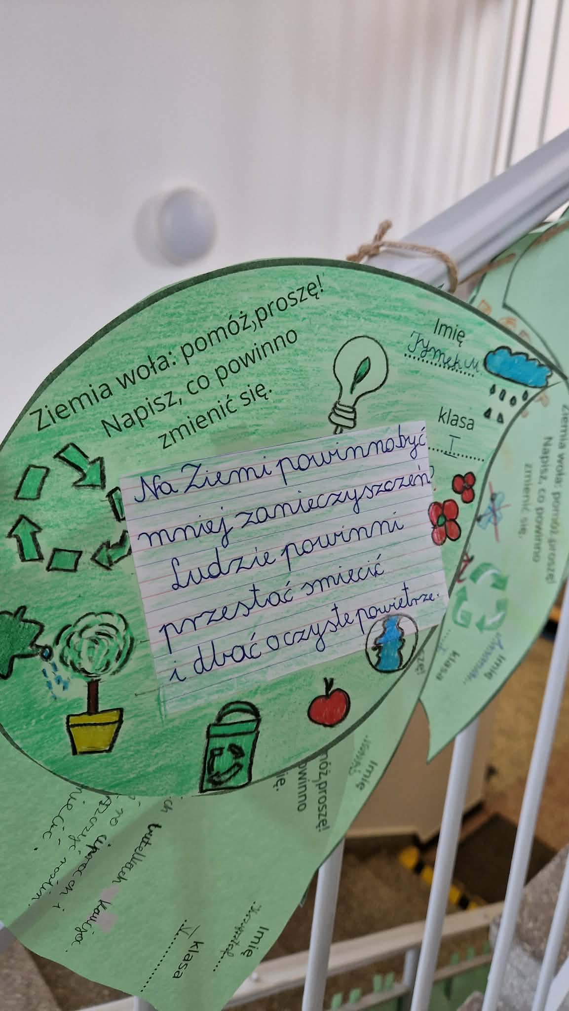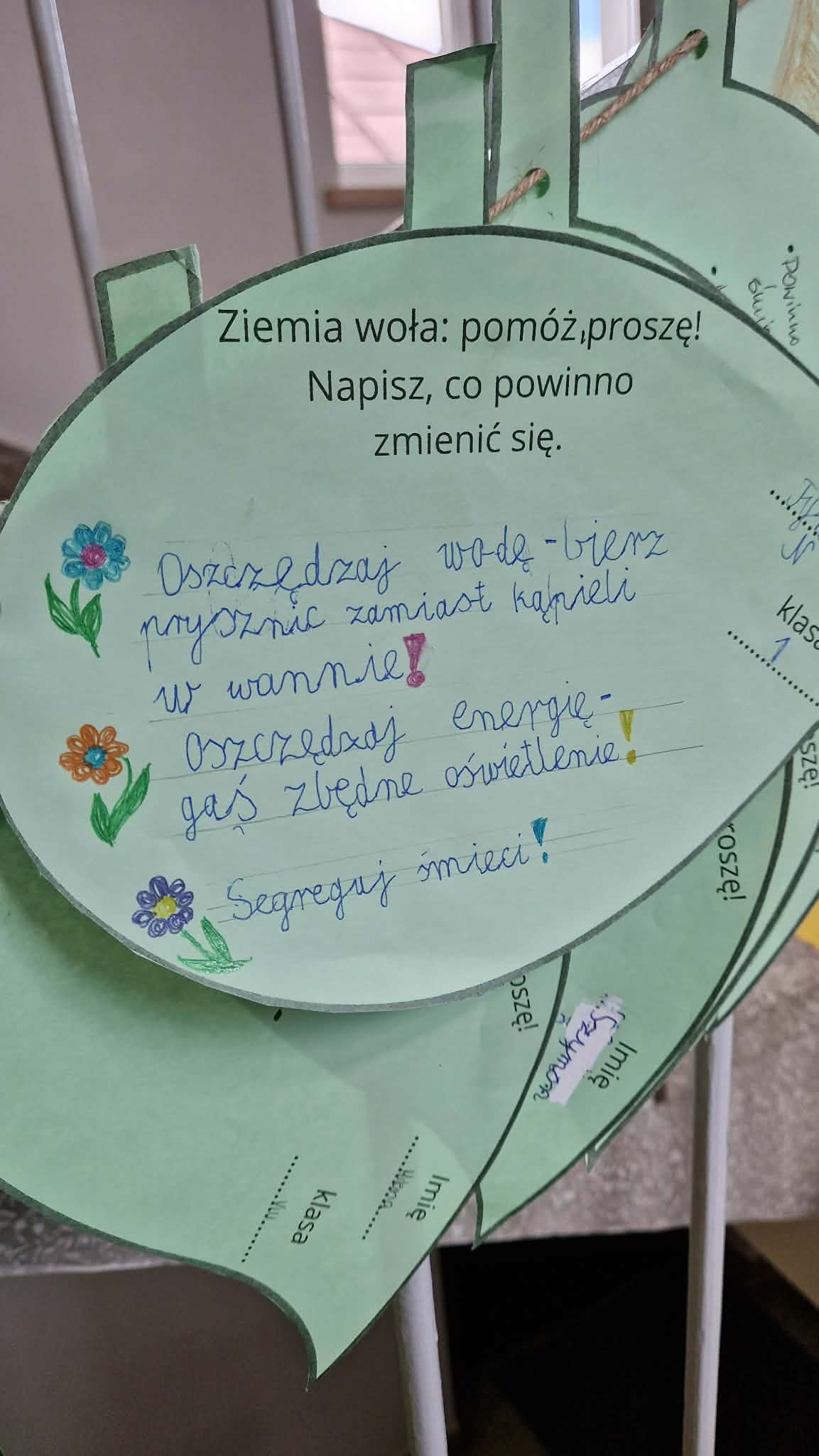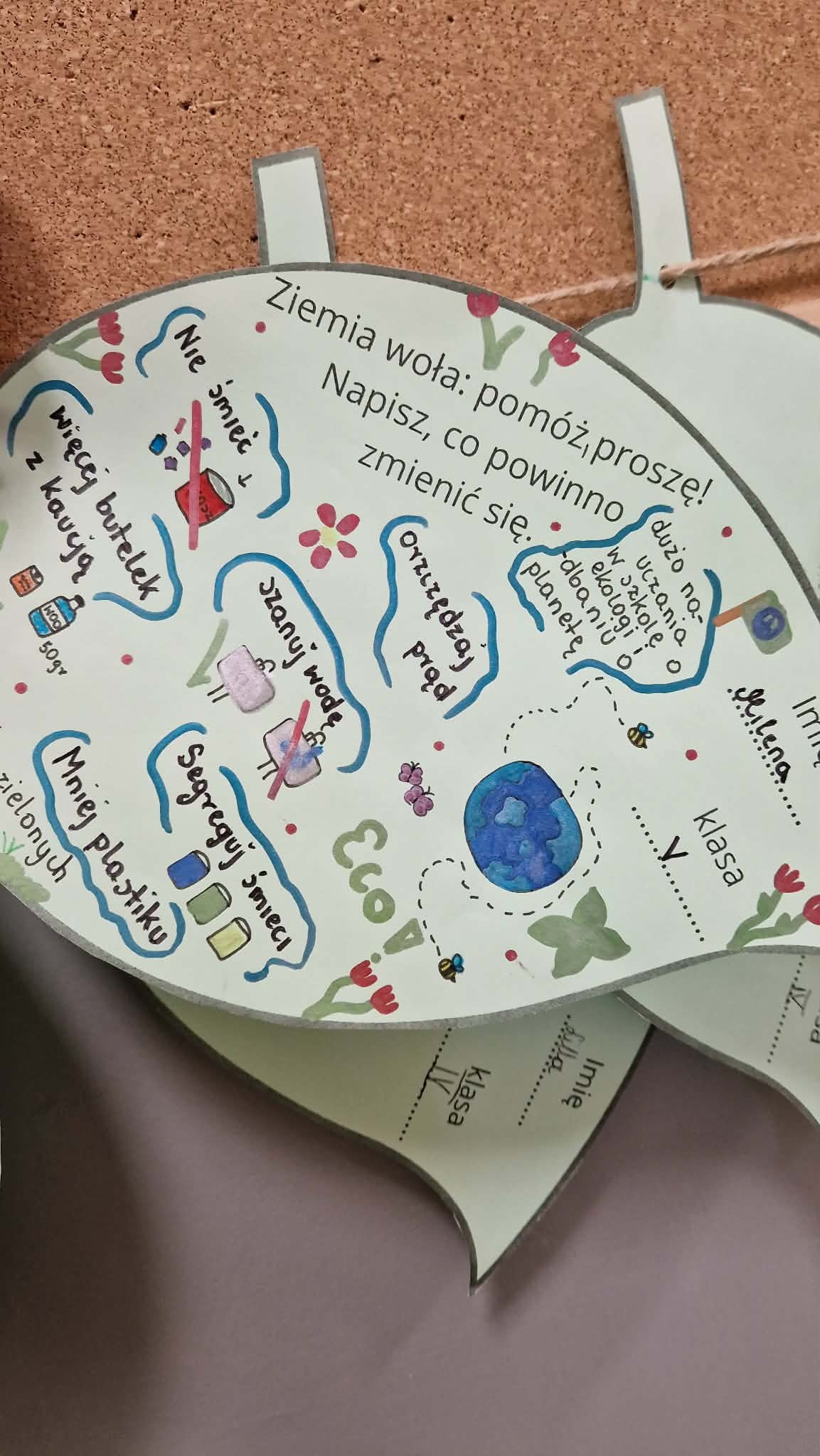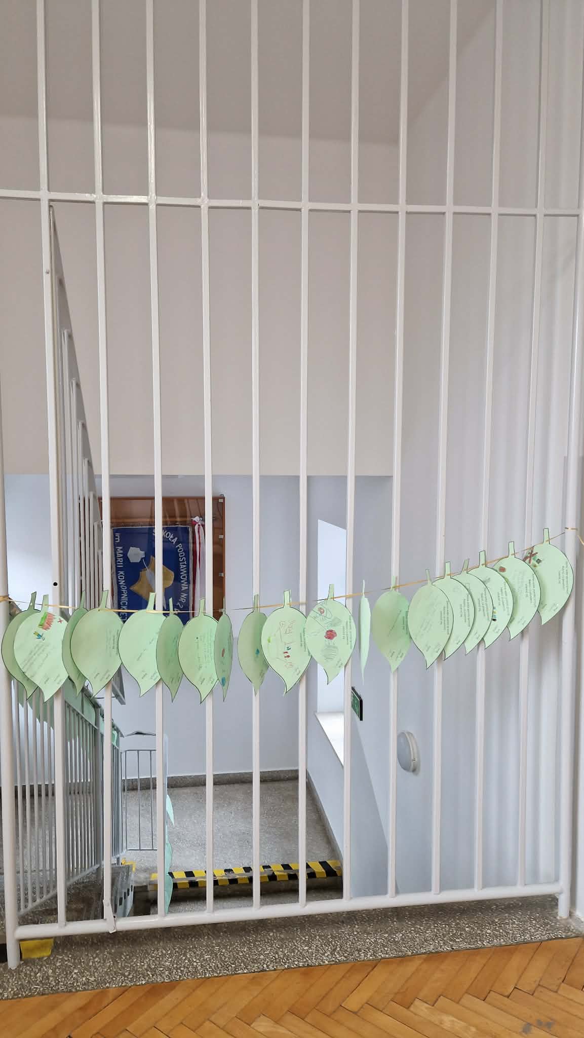 W całej szkole powstał również wyjątkowy, pełen kolorów „Łańcuch Przyjaciół Ziemi”. Przedszkolaki oraz uczniowie klas 1–8 zapisywali na papierowych liściach swoje pomysły, obietnice i rysunki przedstawiające działania, które mogą pomóc naszej planecie. Wszystkie liście połączono w długi łańcuch, który ozdobił szkolne korytarze i stał się symbolem wspólnej troski o środowisko.