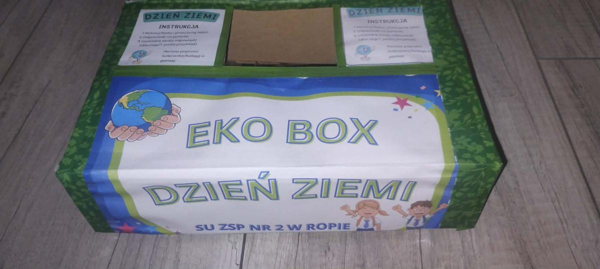Samorząd Uczniowski przygotował akcję Eko‑BOX – ekowiedza z pudełka. Uczniowie losowali fiszki z pytaniami dotyczącymi dbania o Ziemię, a za poprawne odpowiedzi zdobywali odznakę Przyjaciela Ziemi. Była to świetna okazja, aby w formie zabawy utrwalić wiedzę ekologiczną.